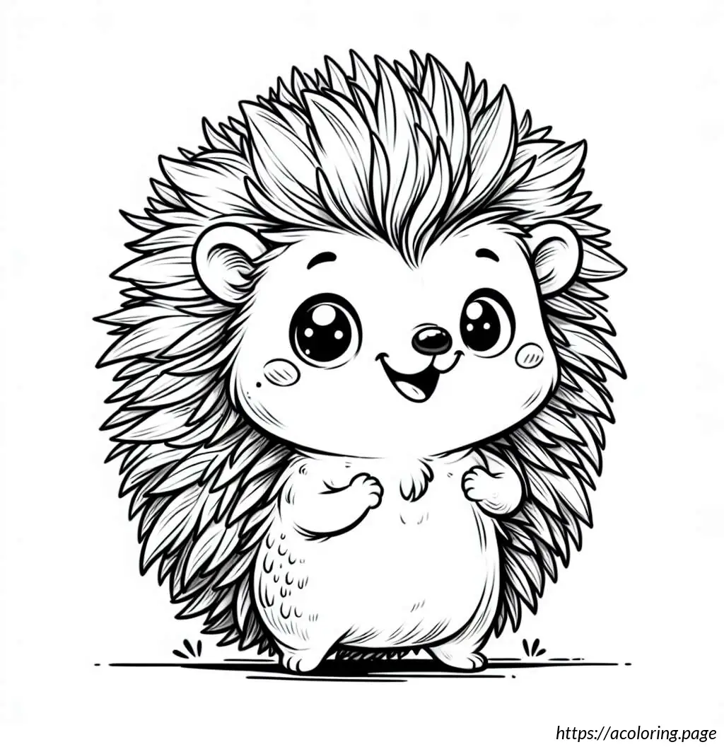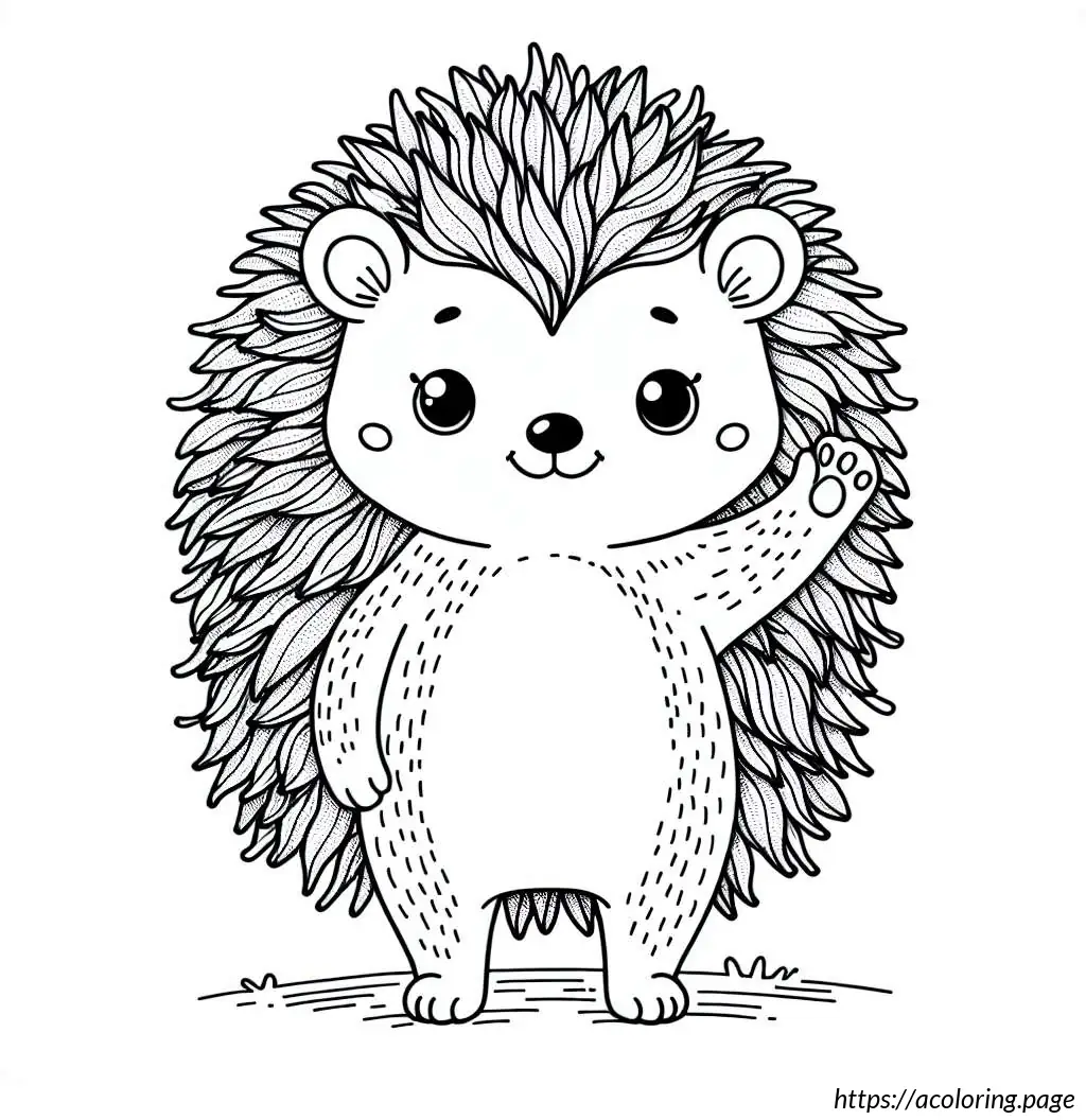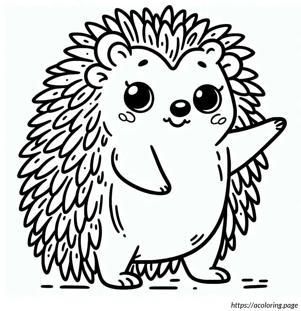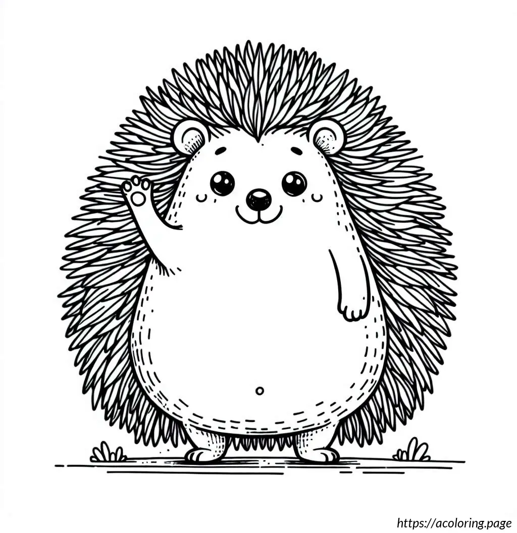 The image shows a cartoon-style drawing of a hedgehog. This illustrated hedgehog exhibits an exaggerated and friendly appearance, characterized by large eyes and a prominent, round nose. The drawing is simple and appears to be designed as a coloring page for children, with bold, clear lines and a lot of white space for coloring. The hedgehog is depicted standing upright on its hind legs, with one arm raised in a waving gesture and the other by its side. Its body is oval-shaped, and it has spiky hair that runs along its back, highlighting the typical texture of a hedgehog”s spines. The feet are illustrated with simple shapes for toes. The background of the image is plain, without any additional details or colors.