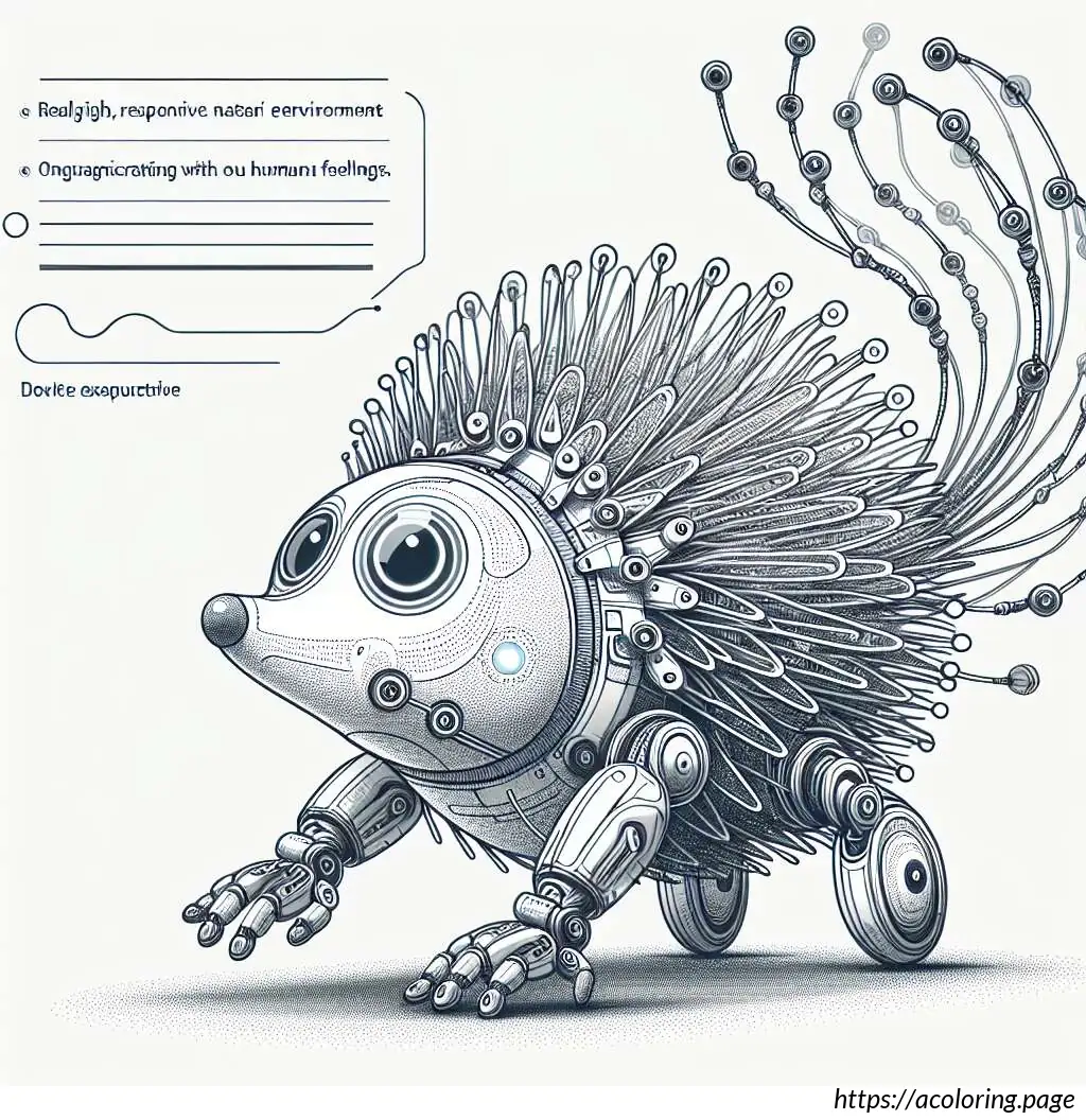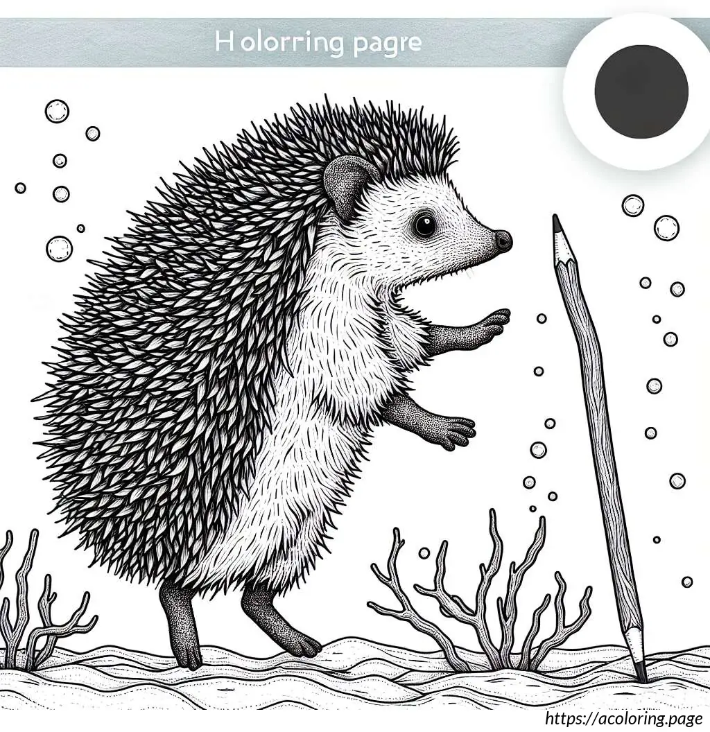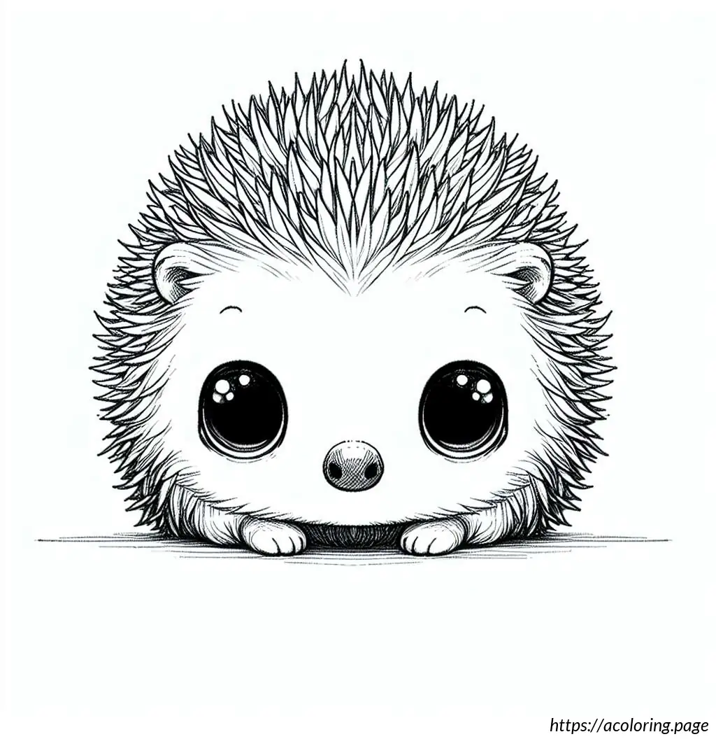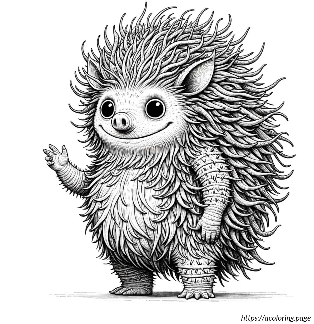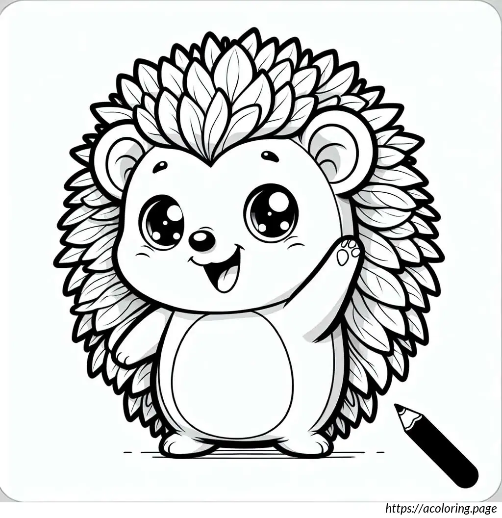 The image shows a cartoon-style drawing of a hedgehog. This illustrated hedgehog exhibits an exaggerated and friendly appearance, characterized by large eyes and a prominent, round nose. The drawing is simple and appears to be designed as a coloring page for children, with bold, clear lines and a lot of white space for coloring. The hedgehog is depicted standing upright on its hind legs, with one arm raised in a waving gesture and the other by its side. Its body is oval-shaped, and it has spiky hair that runs along its back, highlighting the typical texture of a hedgehog”s spines. The feet are illustrated with simple shapes for toes. The background of the image is plain, without any additional details or colors.