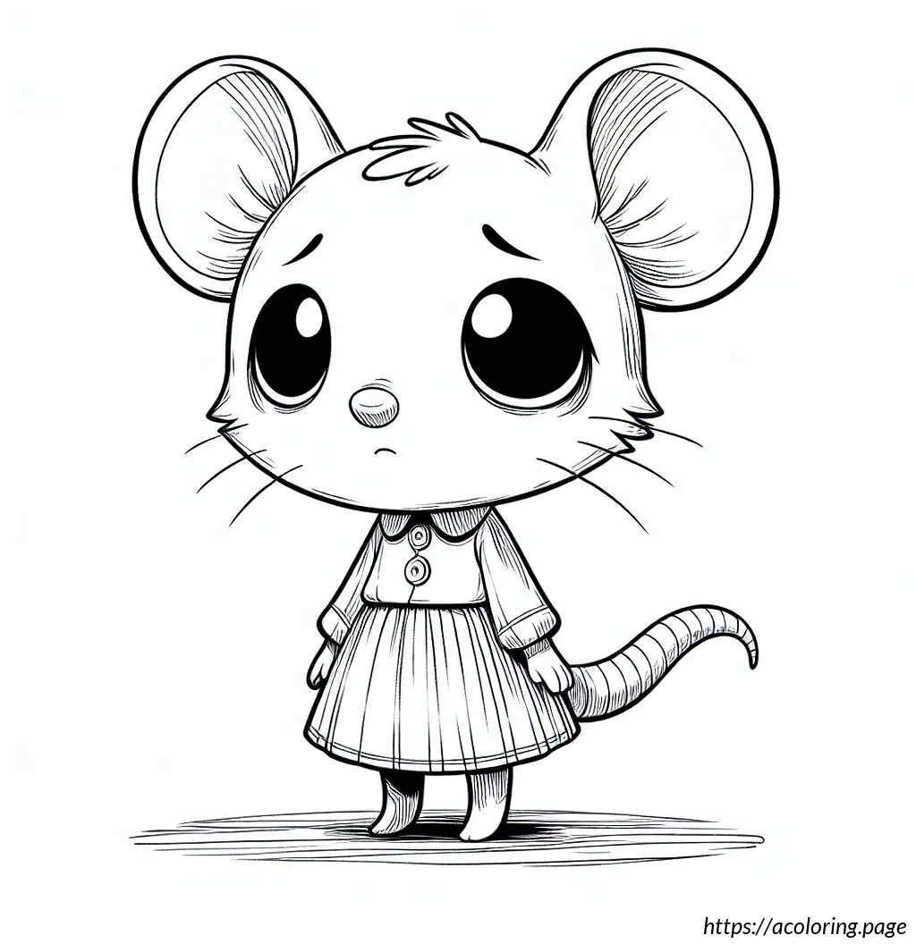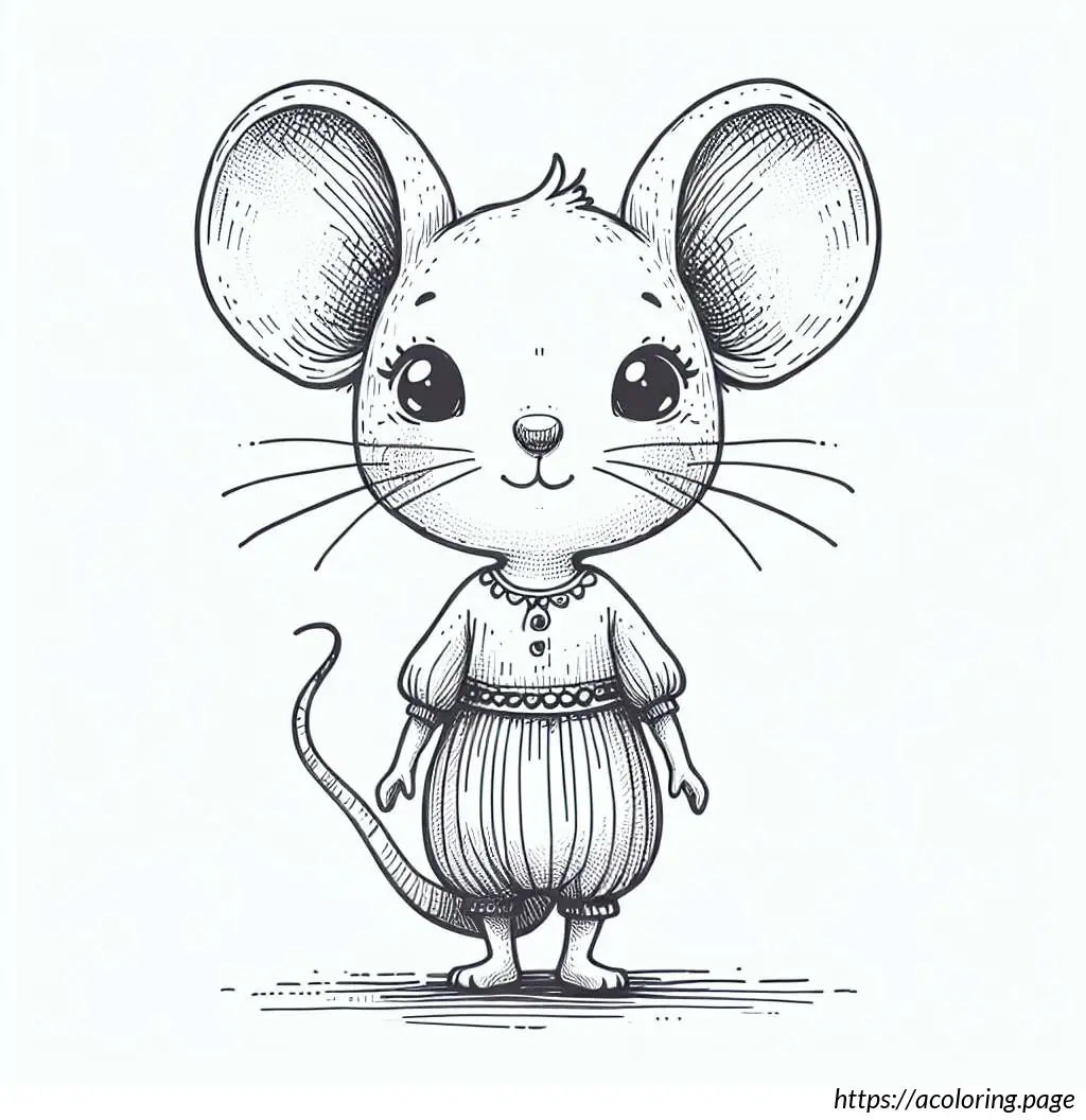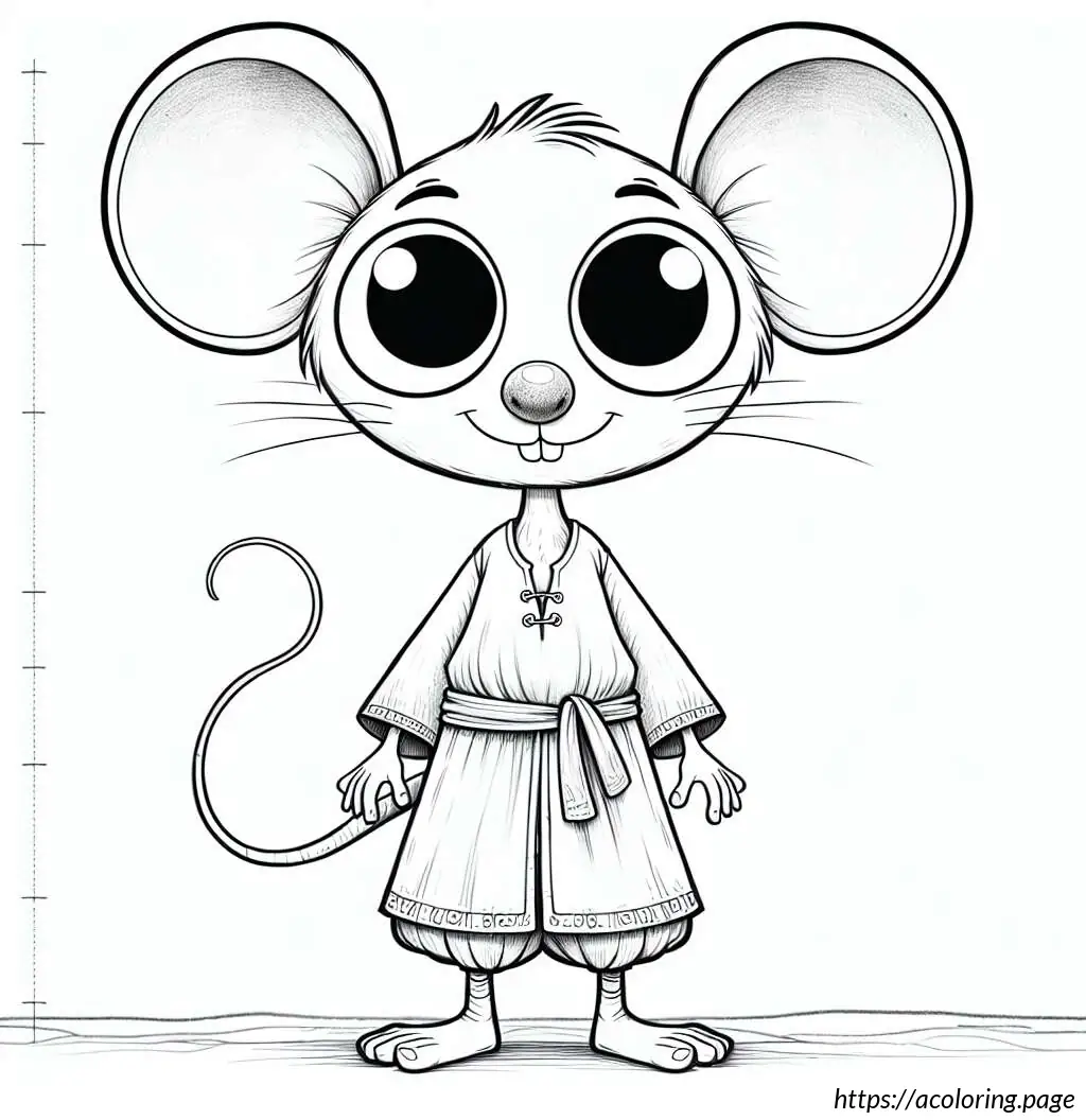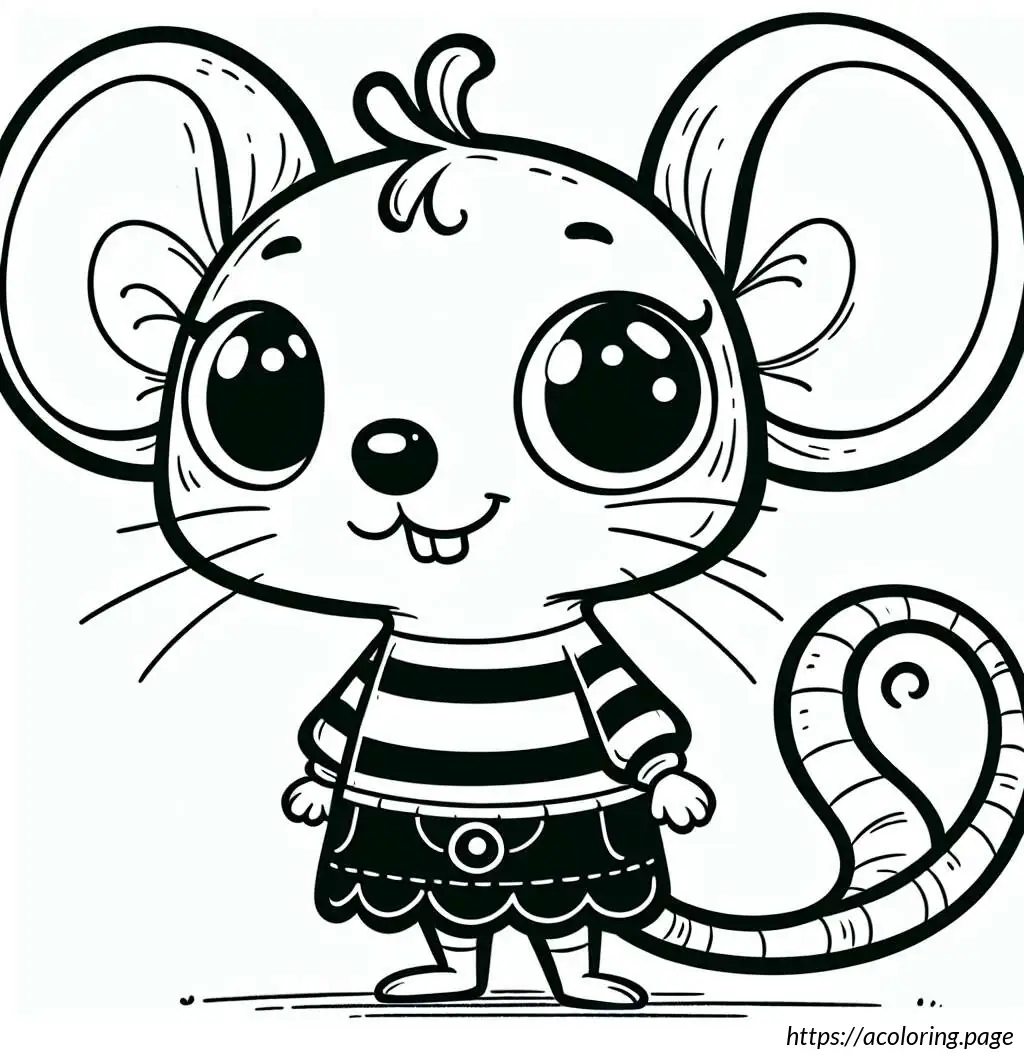 The image is a simple black and white line drawing of a cartoon mouse. The mouse stands upright and has a human-like body posture. At the top, the mouse has round ears that resemble loops. It features two large, round eyes, with one eye slightly larger than the other. The mouse has an oversized snout with a single prominent black circular nose. Its mouth is curved into a gentle smile, and a single tooth is visible. The mouse”s body appears rounded and it”s wearing a clothing-like design, which includes details resembling a shirt with a bell-shaped trim at the bottom, similar to a layered skirt or a tunic. A belt with a simple buckle holds the outfit together around its waist. The arms and hands of the mouse are very simplistic, with thin limbs and fingers crudely drawn. It has two visible oval-shaped feet.The background of the image is plain white with a lightly drawn horizontal line indicating the ground. Overall, the drawing has a playful and child-friendly appearance, ideal for coloring activities.