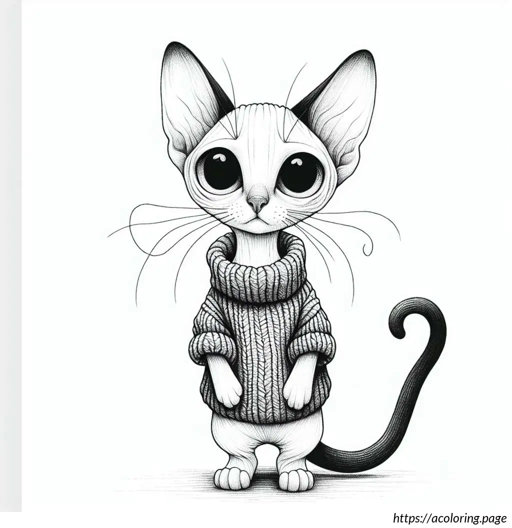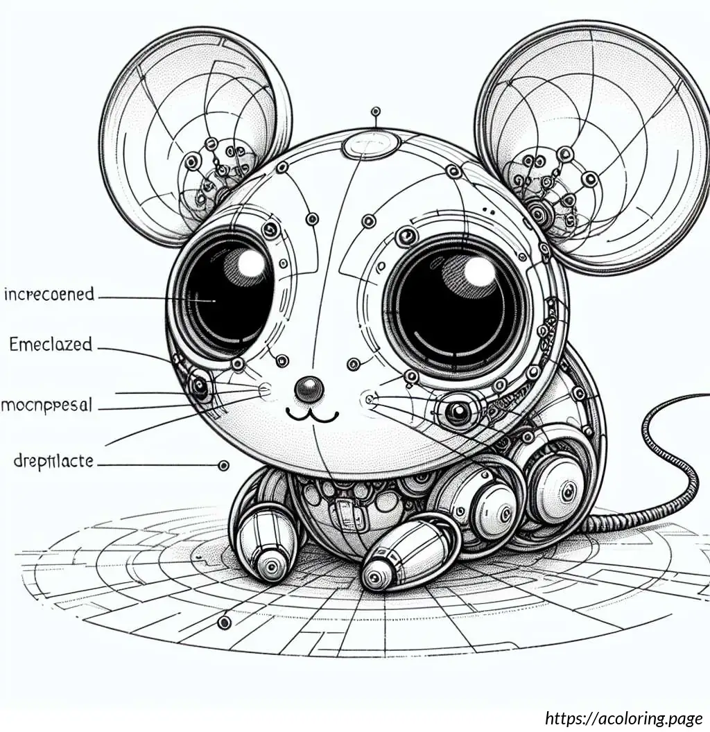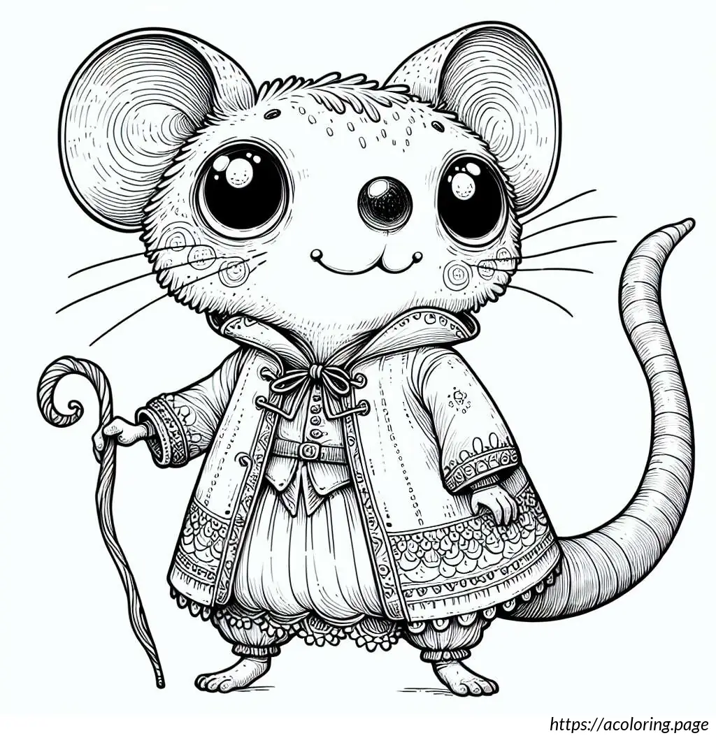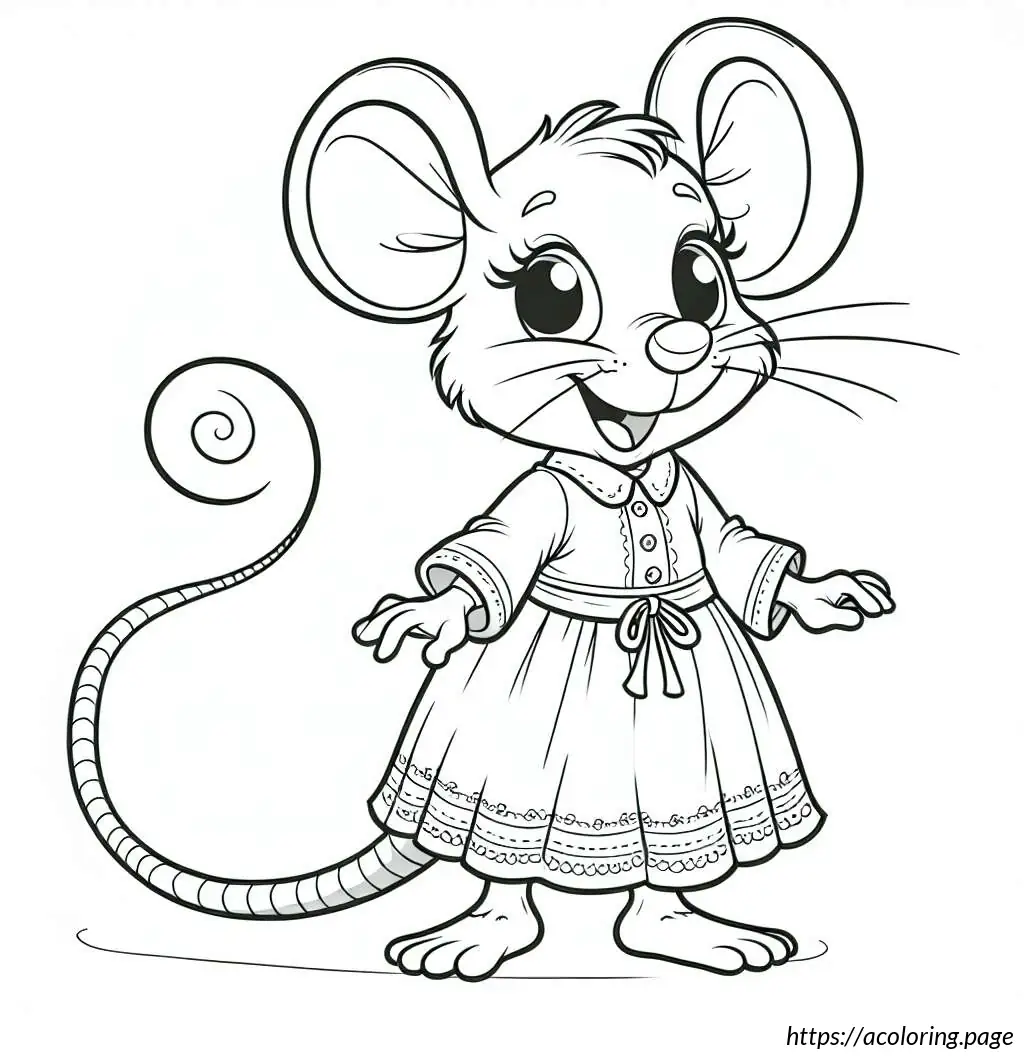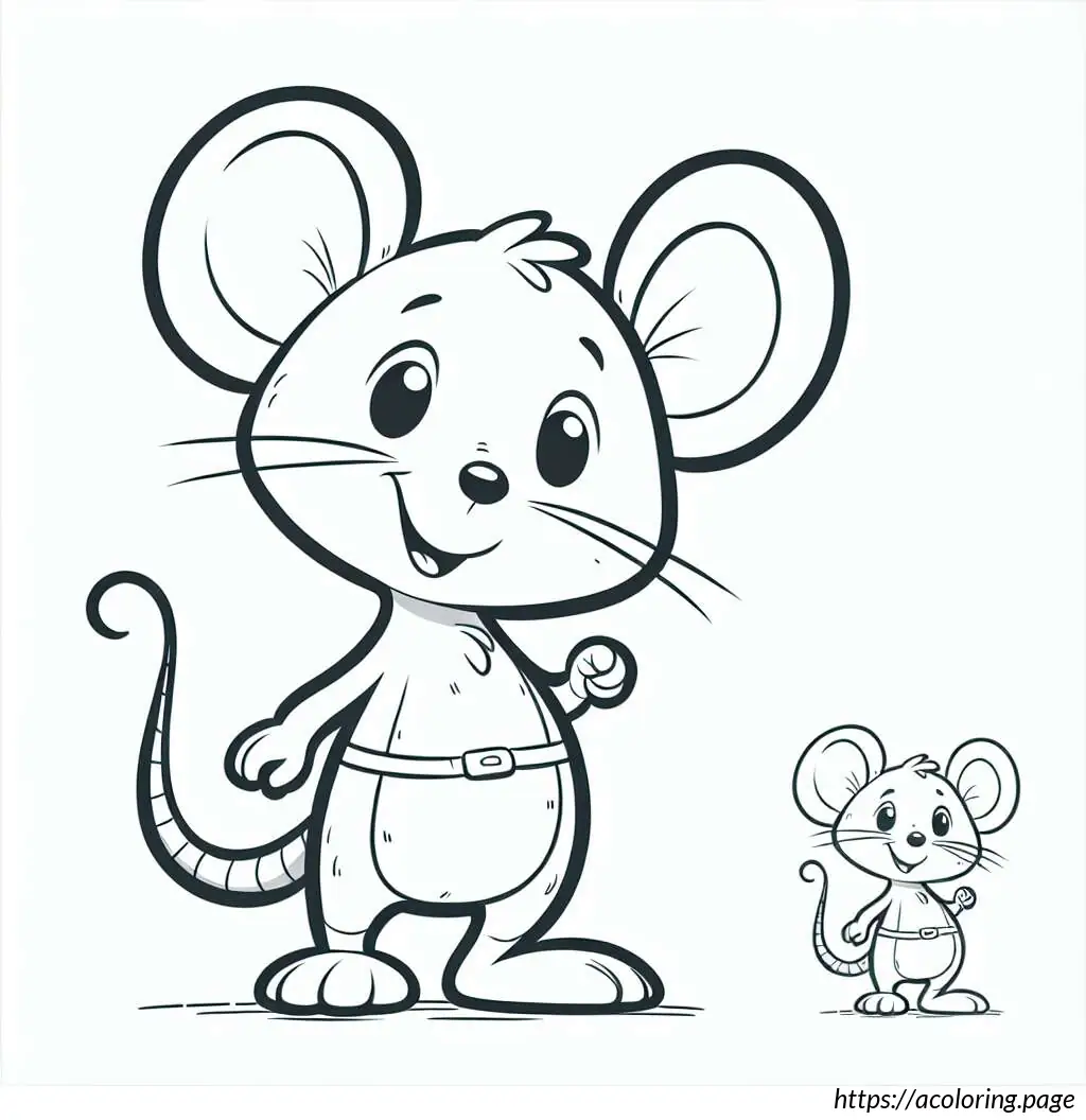The image is a simple black and white line drawing of a cartoon mouse. The mouse stands upright and has a human-like body posture. At the top, the mouse has round ears that resemble loops. It features two large, round eyes, with one eye slightly larger than the other. The mouse has an oversized snout with a single prominent black circular nose. Its mouth is curved into a gentle smile, and a single tooth is visible. The mouse”s body appears rounded and it”s wearing a clothing-like design, which includes details resembling a shirt with a bell-shaped trim at the bottom, similar to a layered skirt or a tunic. A belt with a simple buckle holds the outfit together around its waist. The arms and hands of the mouse are very simplistic, with thin limbs and fingers crudely drawn. It has two visible oval-shaped feet.The background of the image is plain white with a lightly drawn horizontal line indicating the ground. Overall, the drawing has a playful and child-friendly appearance, ideal for coloring activities.