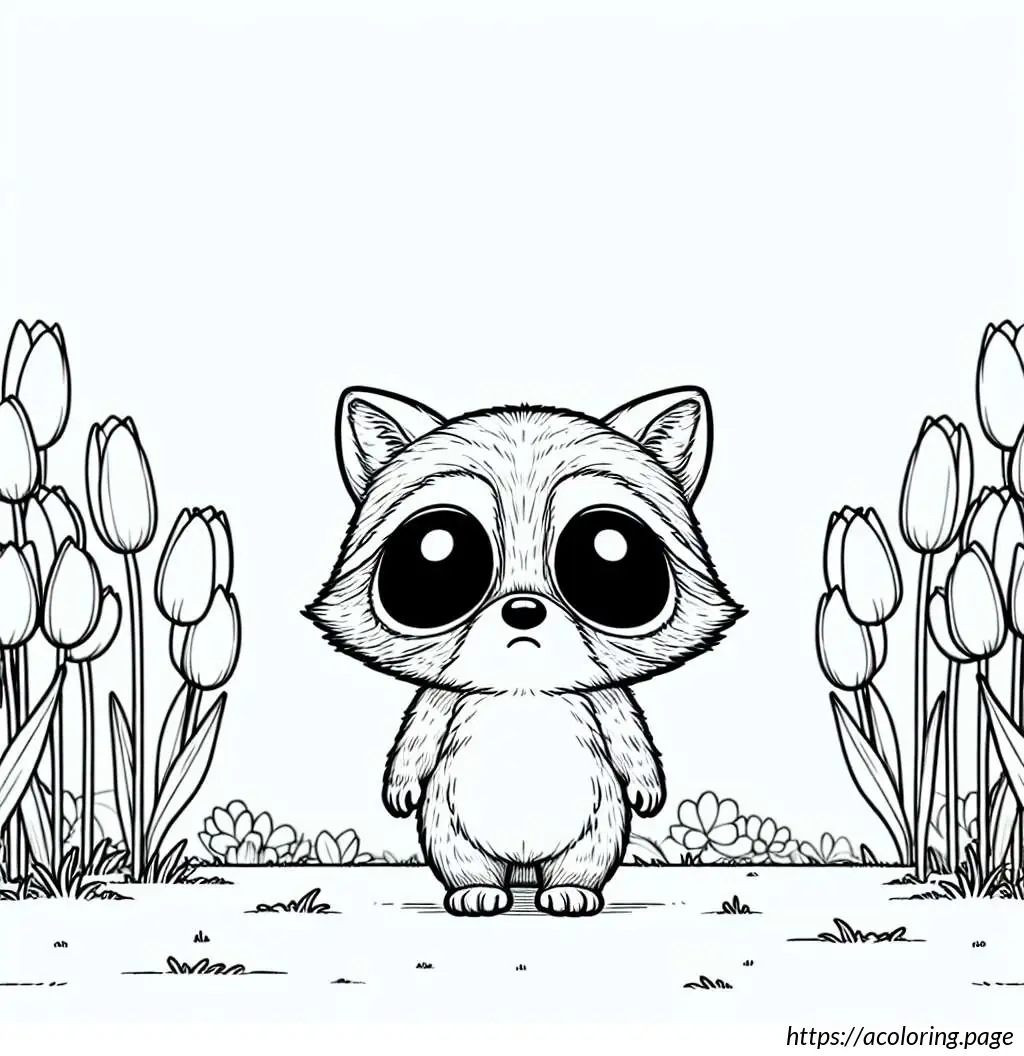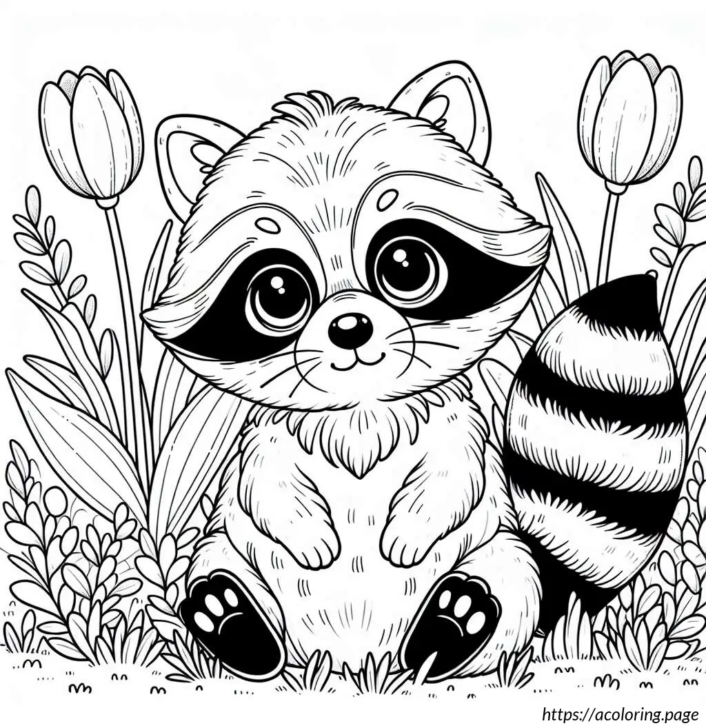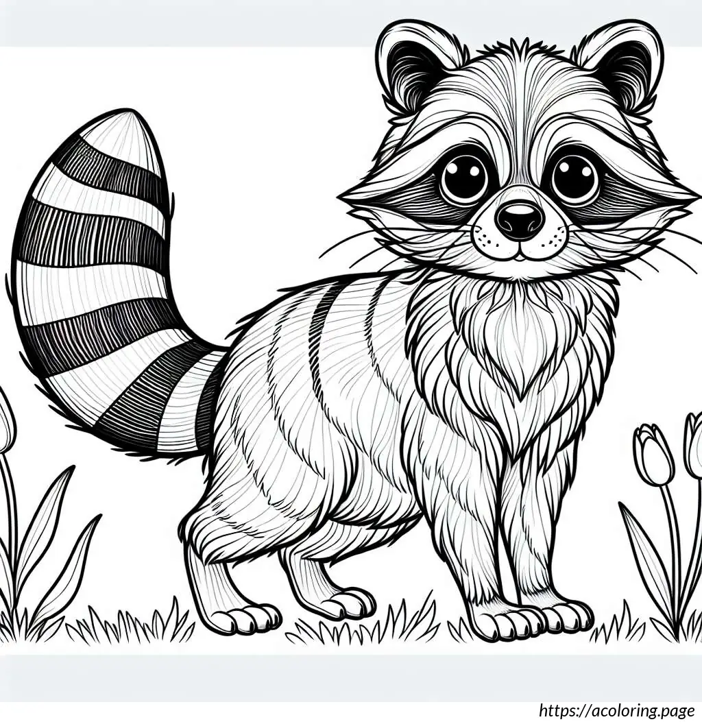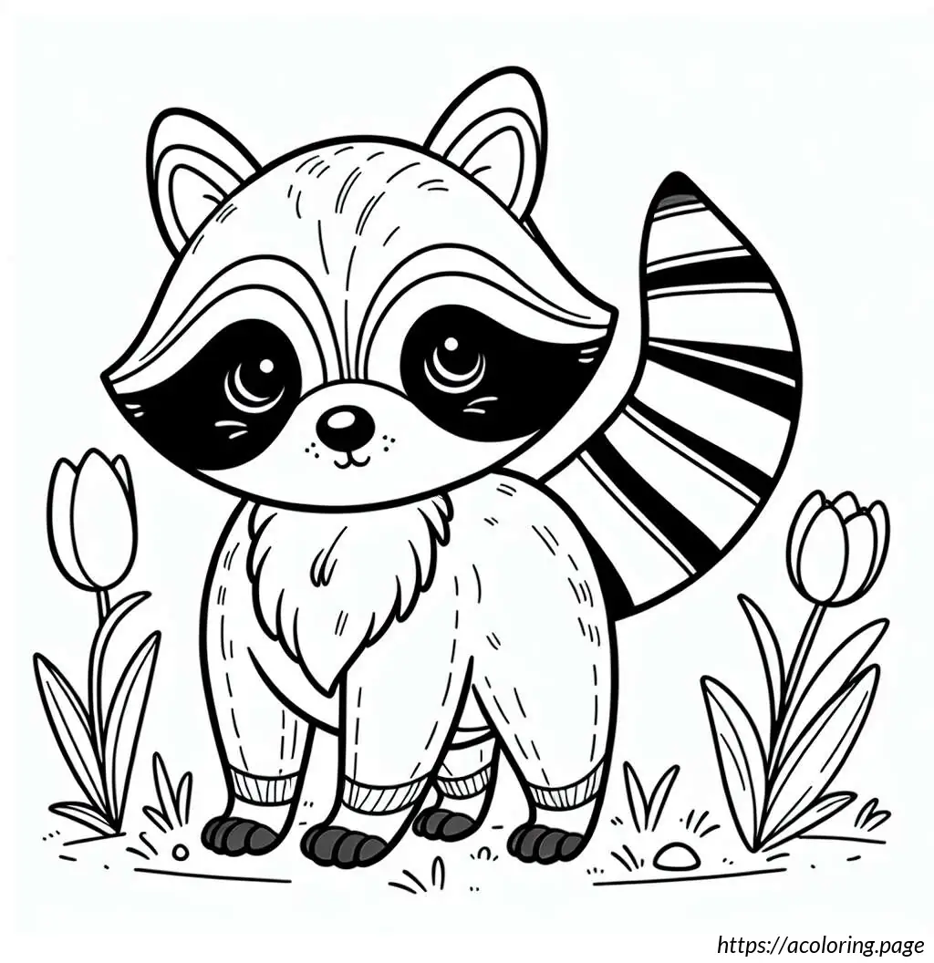This image features a cartoon-style drawing of a raccoon. The raccoon is facing left and has a large head with pronounced ears, big round eyes, and a dotted nose. Its body is stout, and it has a long, striped tail. The raccoon is placed in a simple setting that includes grass at the bottom and three tulip-like flowers to the right. The overall style of the drawing is simplistic and appears to be a line art, suitable for coloring activities.