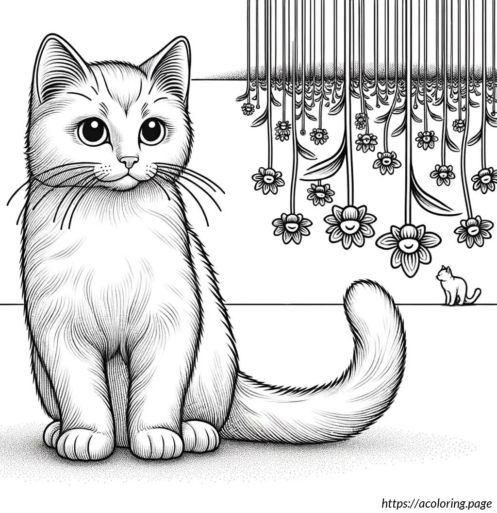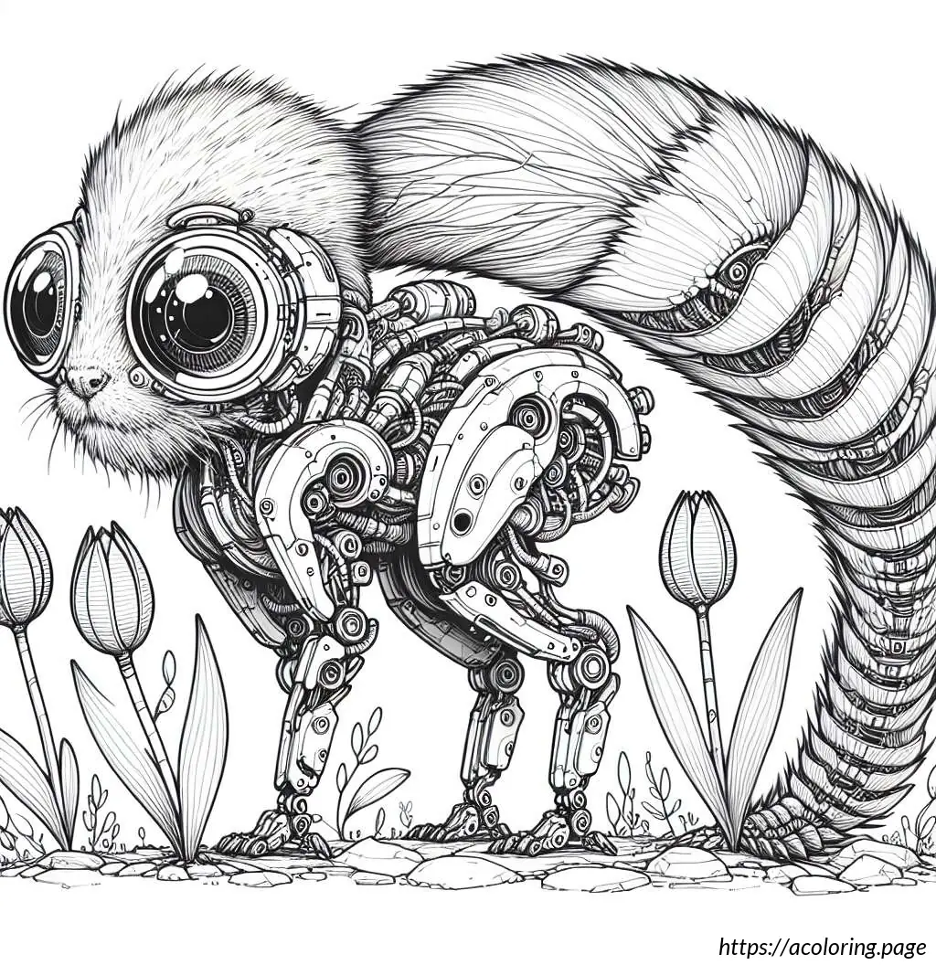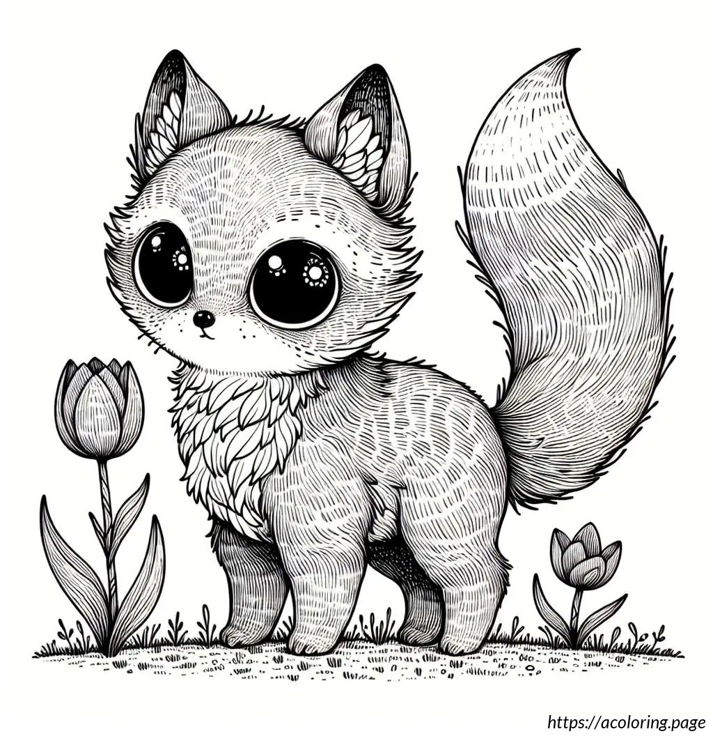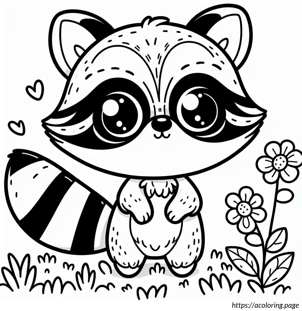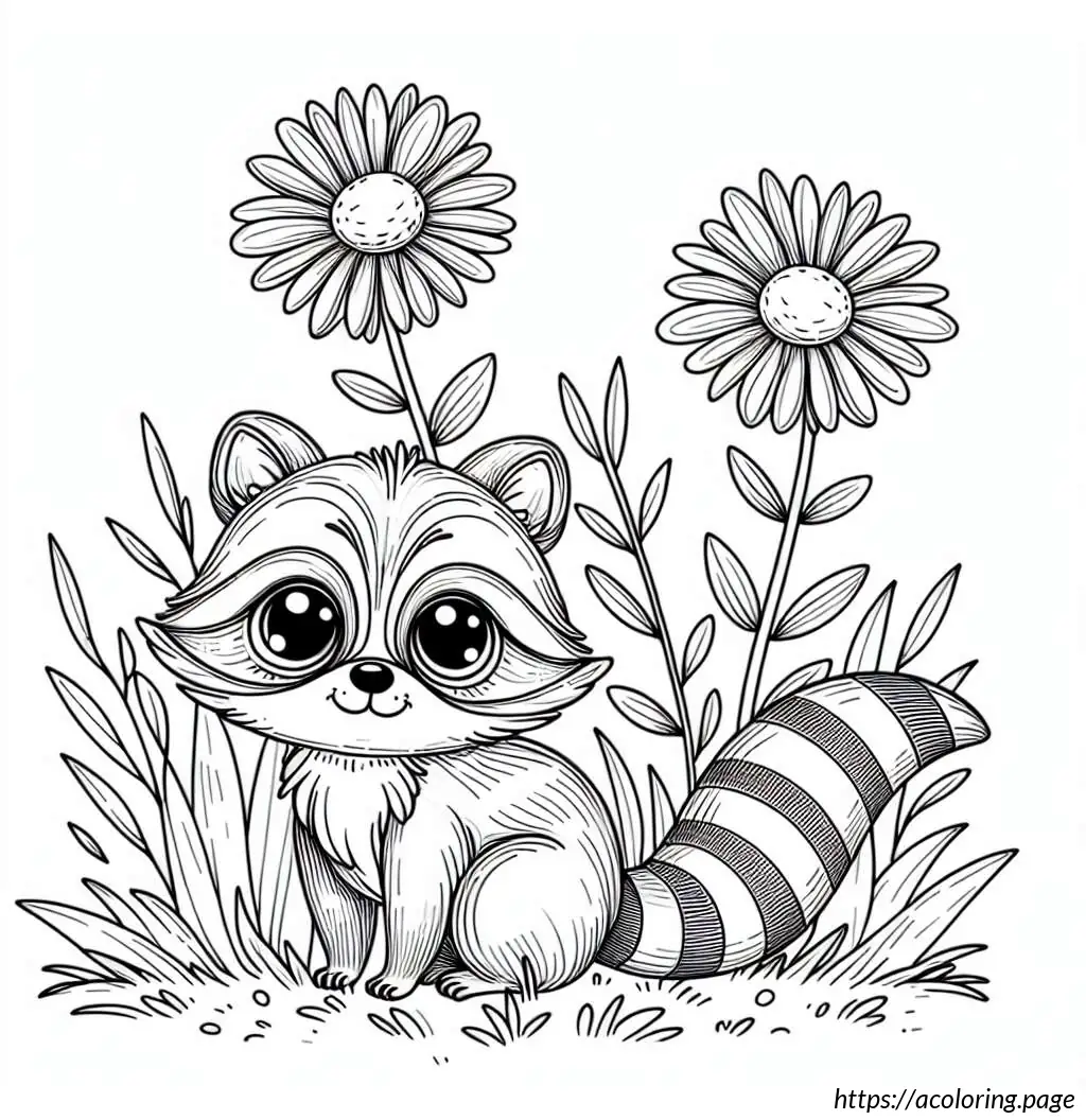 This image features a cartoon-style drawing of a raccoon. The raccoon is facing left and has a large head with pronounced ears, big round eyes, and a dotted nose. Its body is stout, and it has a long, striped tail. The raccoon is placed in a simple setting that includes grass at the bottom and three tulip-like flowers to the right. The overall style of the drawing is simplistic and appears to be a line art, suitable for coloring activities.