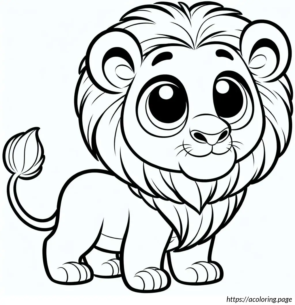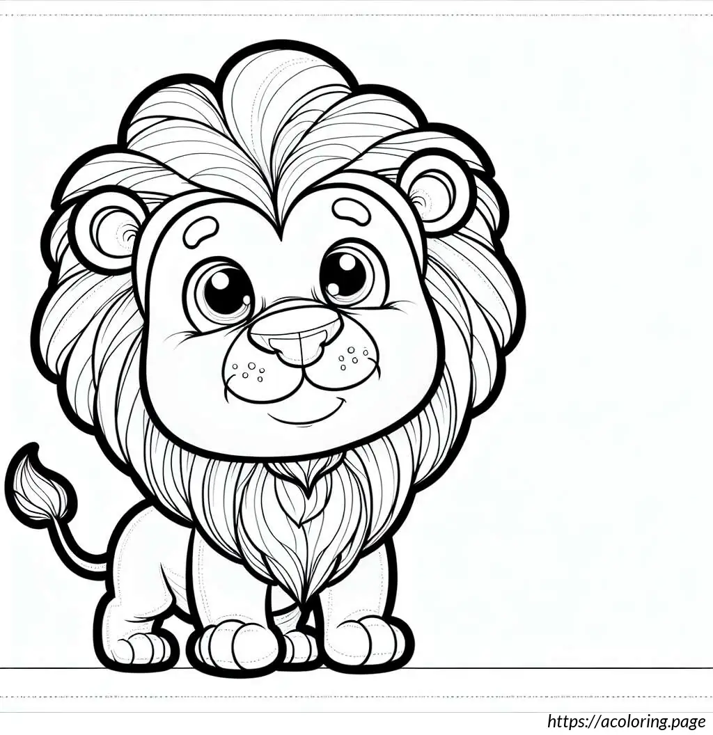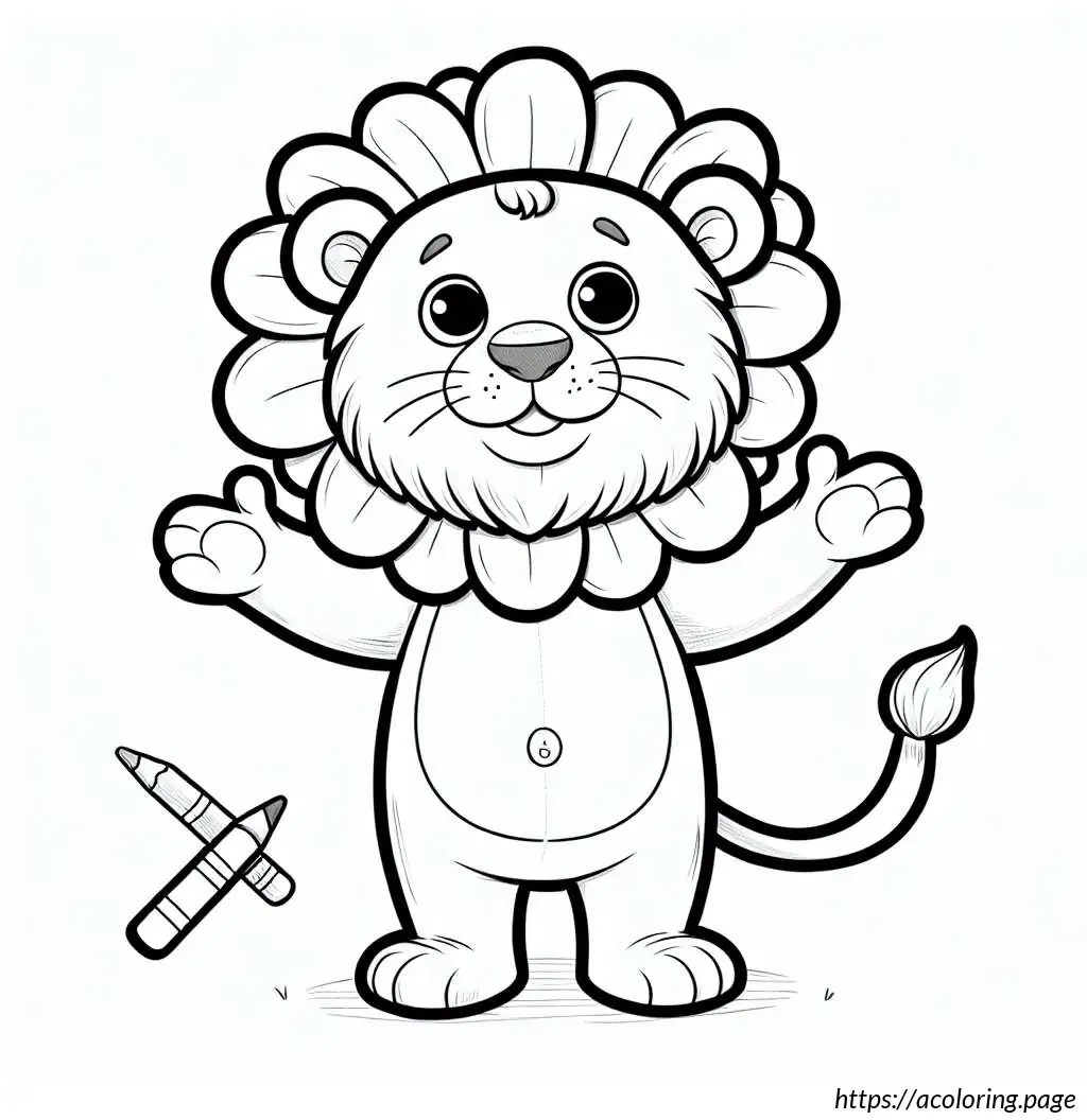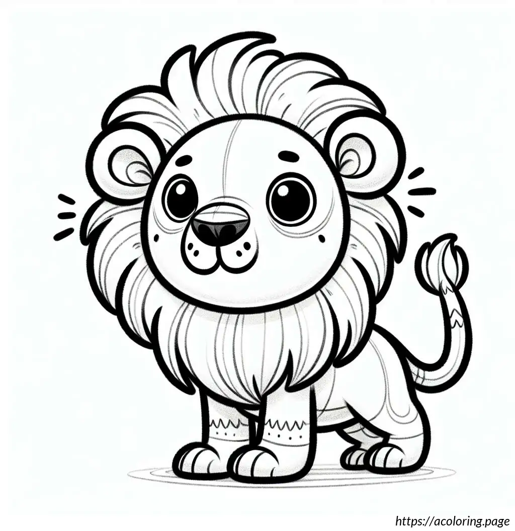 This image features a cartoon drawing of a lion. The lion appears cheerful and is standing upright on its two back legs, in a human-like posture. It has large eyes that are wide open, contributing to its friendly and inviting expression. The lion”s face is framed by a thick mane that looks similar to the petals of a daisy, and it has small round ears poking out from the top of its mane. Its snout is pronounced, with a small triangle for a nose and three whiskers on each side of its muzzle. The mouth is a simple line with a slight upward curve, suggesting a smile.The body of the lion is relatively simplistic a round belly with a circular navel in the center, and it has short, stubby arms raised up as if it’s in a greeting or dancing pose. The hands have three fingers each, and the legs are straight with small paws that have visible toe lines. The lion’s tail is thin and slightly curved upwards, ending with a small tuft of fur.Overall, the drawing is done with clean black outlines and seems designed to appeal to children, possibly for coloring. The simplicity and exaggerated features typical of such animated characters make it ideal for engaging young audiences.