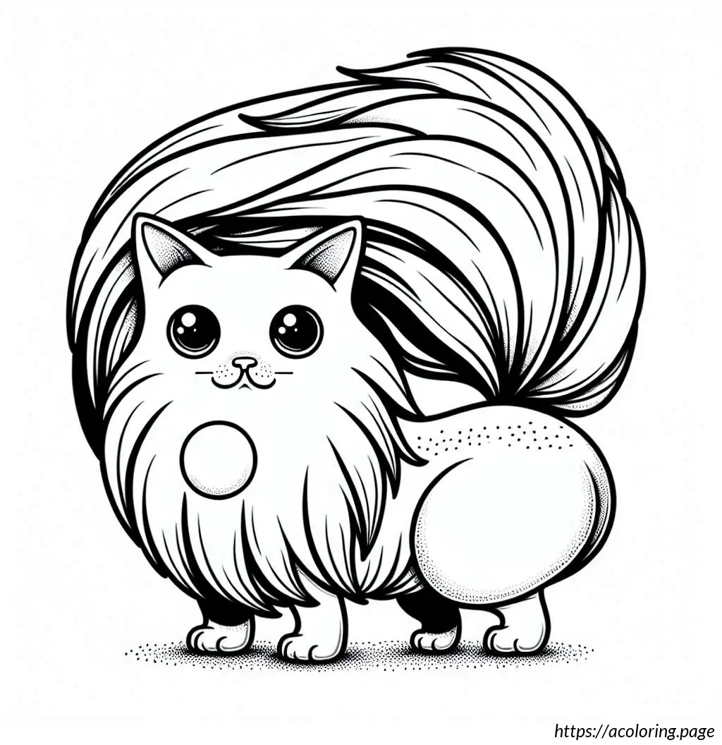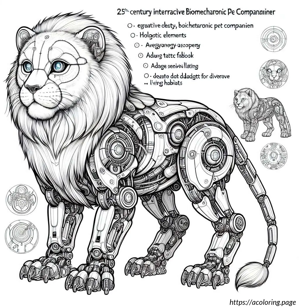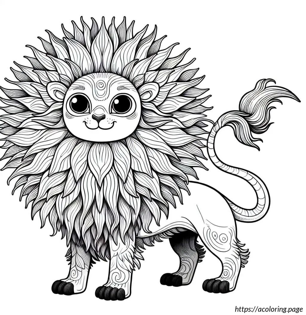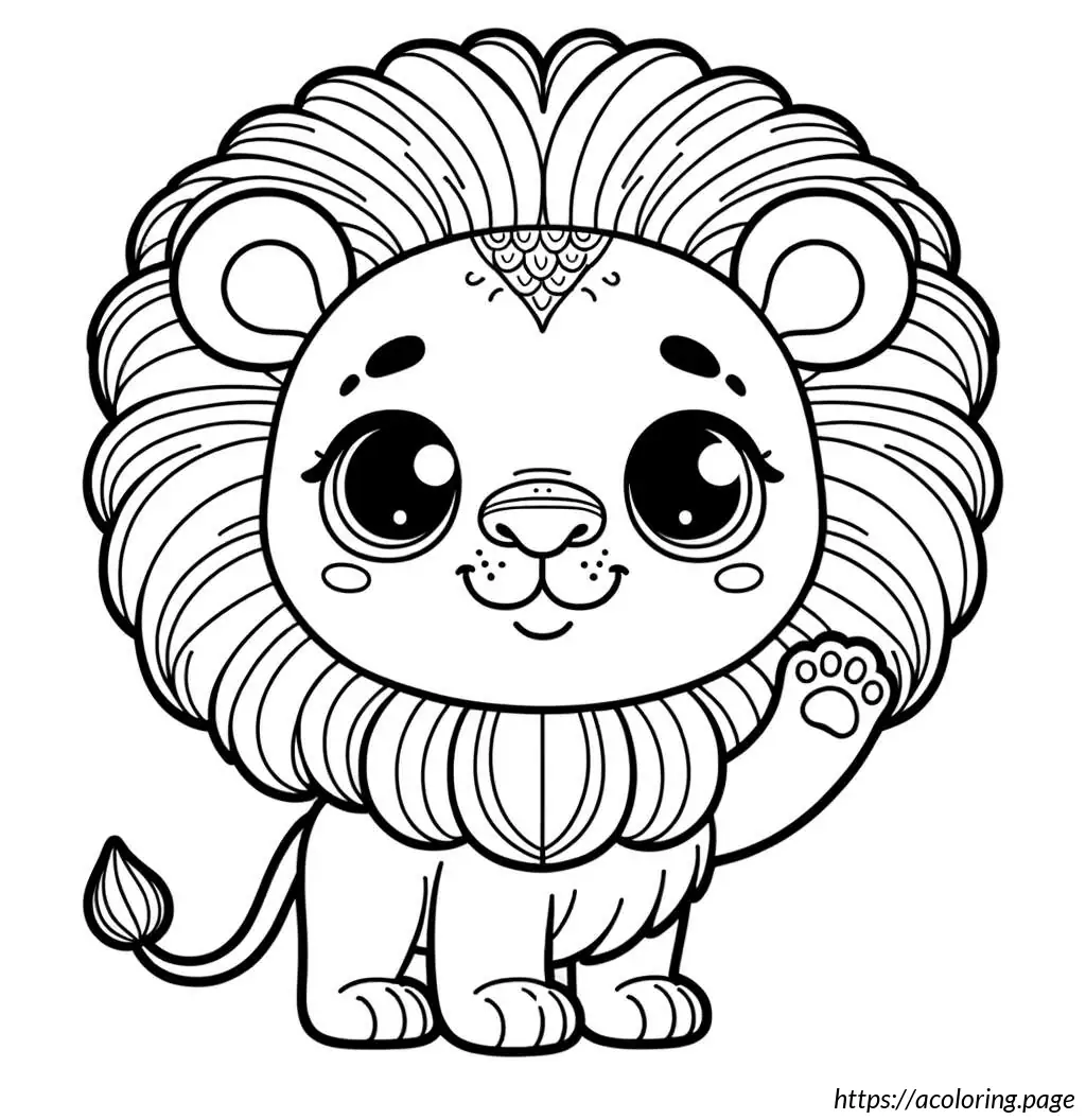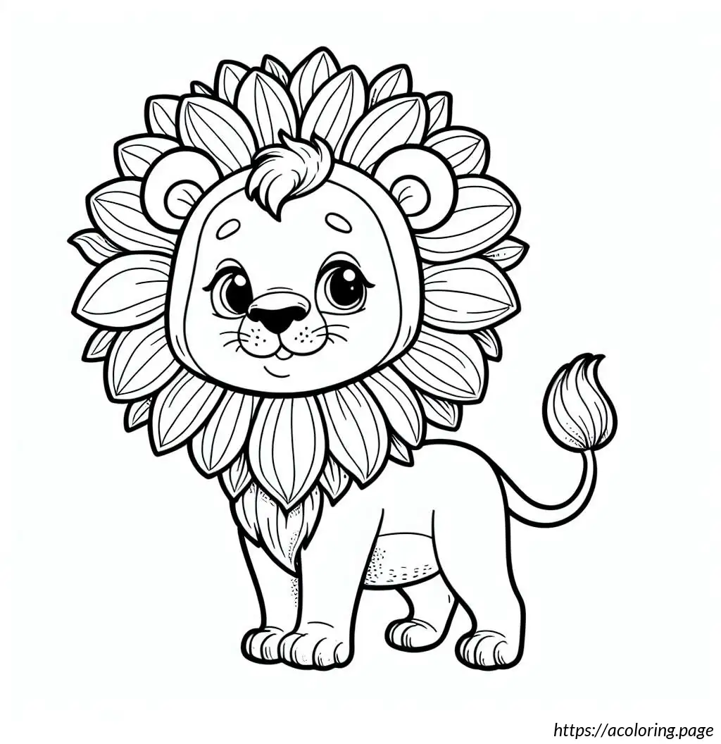 This image features a cartoon drawing of a lion. The lion appears cheerful and is standing upright on its two back legs, in a human-like posture. It has large eyes that are wide open, contributing to its friendly and inviting expression. The lion”s face is framed by a thick mane that looks similar to the petals of a daisy, and it has small round ears poking out from the top of its mane. Its snout is pronounced, with a small triangle for a nose and three whiskers on each side of its muzzle. The mouth is a simple line with a slight upward curve, suggesting a smile.The body of the lion is relatively simplistic a round belly with a circular navel in the center, and it has short, stubby arms raised up as if it’s in a greeting or dancing pose. The hands have three fingers each, and the legs are straight with small paws that have visible toe lines. The lion’s tail is thin and slightly curved upwards, ending with a small tuft of fur.Overall, the drawing is done with clean black outlines and seems designed to appeal to children, possibly for coloring. The simplicity and exaggerated features typical of such animated characters make it ideal for engaging young audiences.
