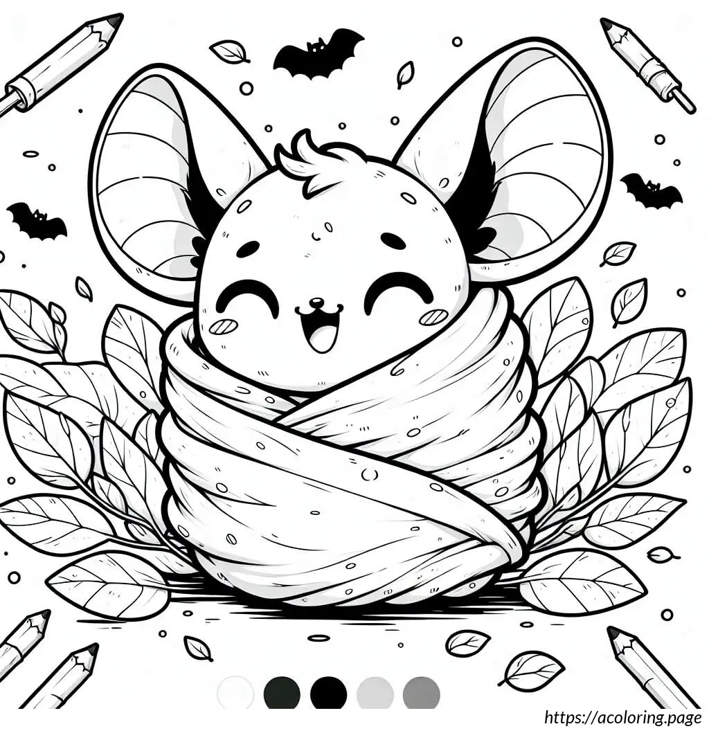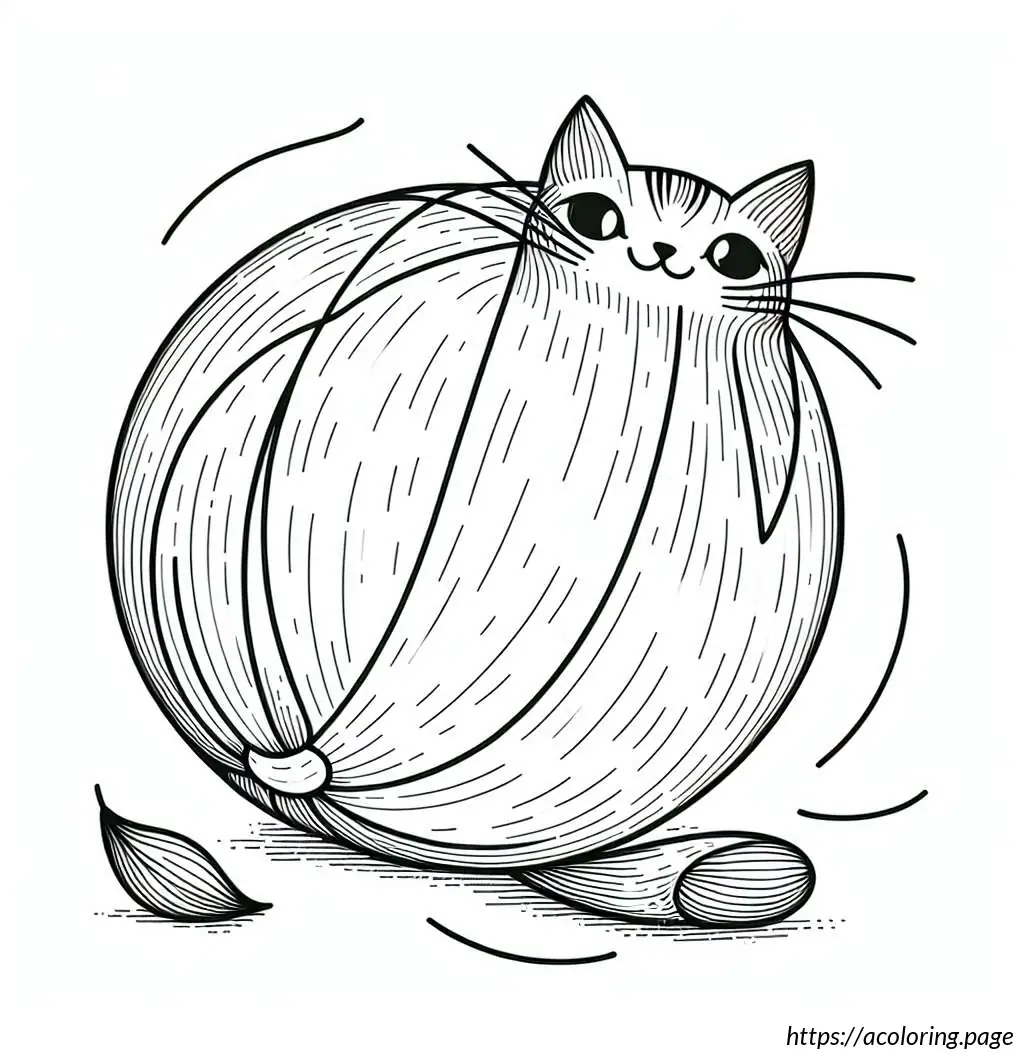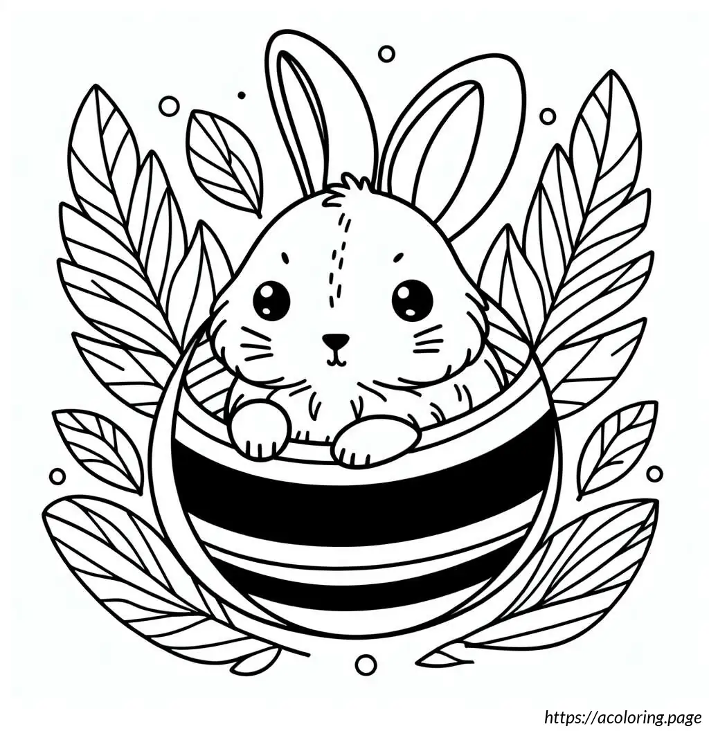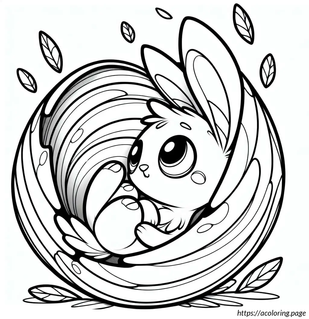 The image depicts a whimsical, cartoon-style drawing of an animal character curled up inside a structure resembling a hollowed-out, segmented sphere. The animal has distinct long ears, big, round eyes, and a playful expression, suggesting it is a fictional or stylized creature, possibly a rabbit due to its ears. There are a few leaf shapes scattered near and around the sphere, adding an outdoor, natural feel to the scene. The entire drawing is in black and white, outlined in bold, smooth lines giving it a clear and simple aesthetic suitable for coloring.