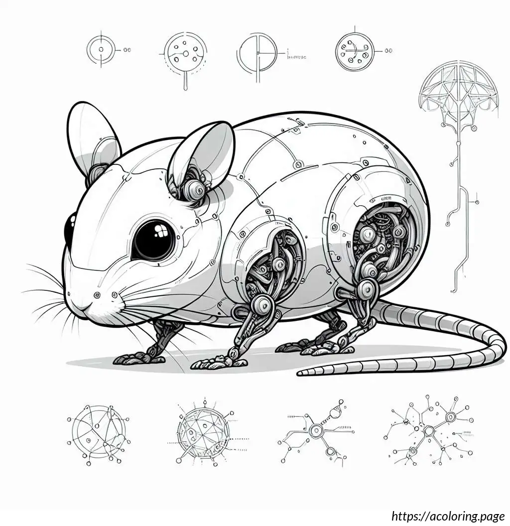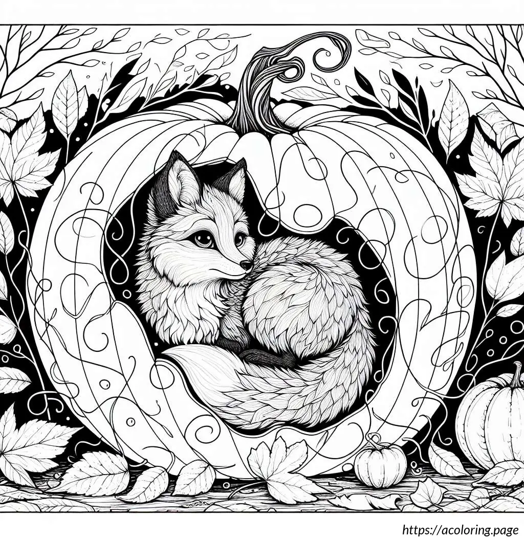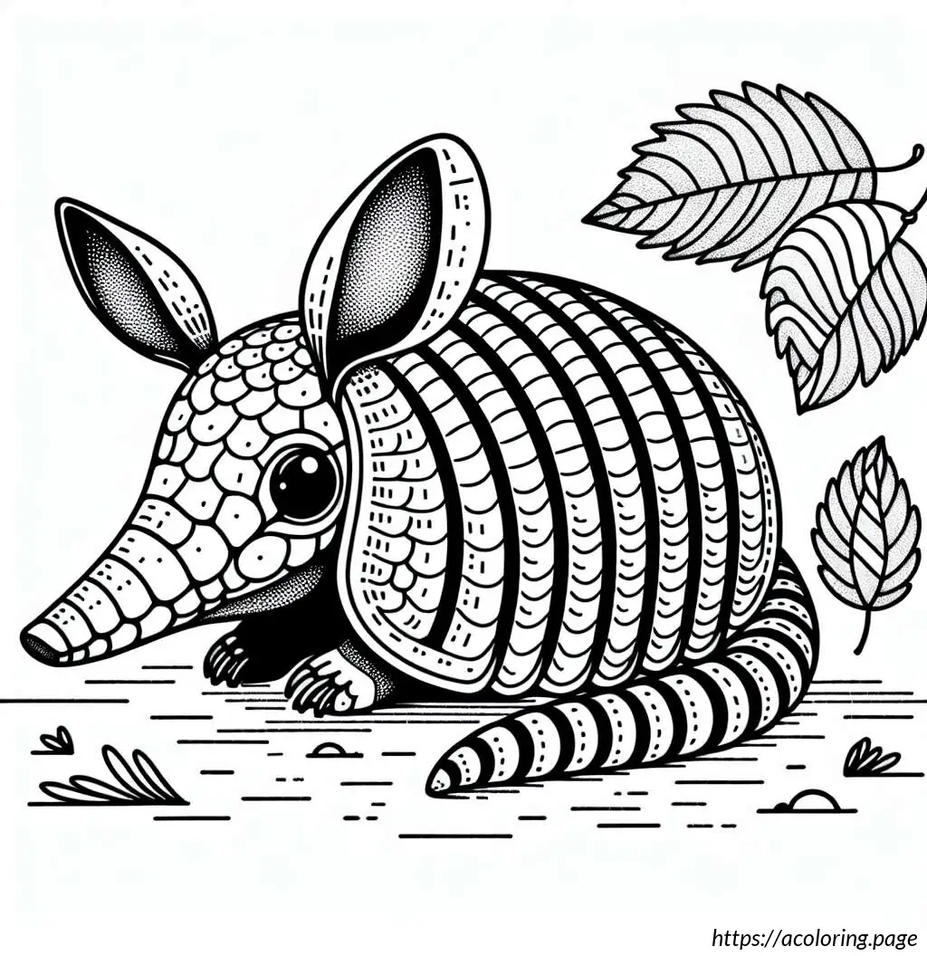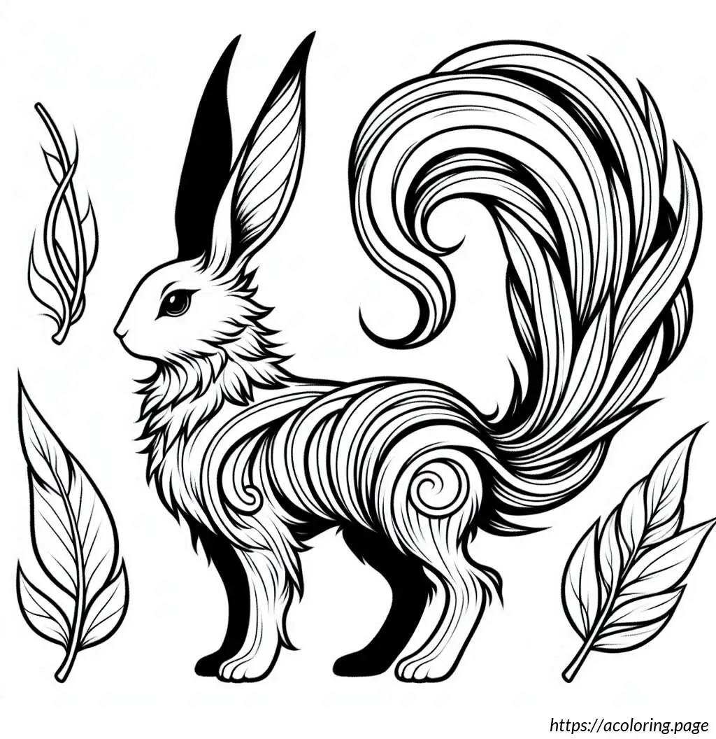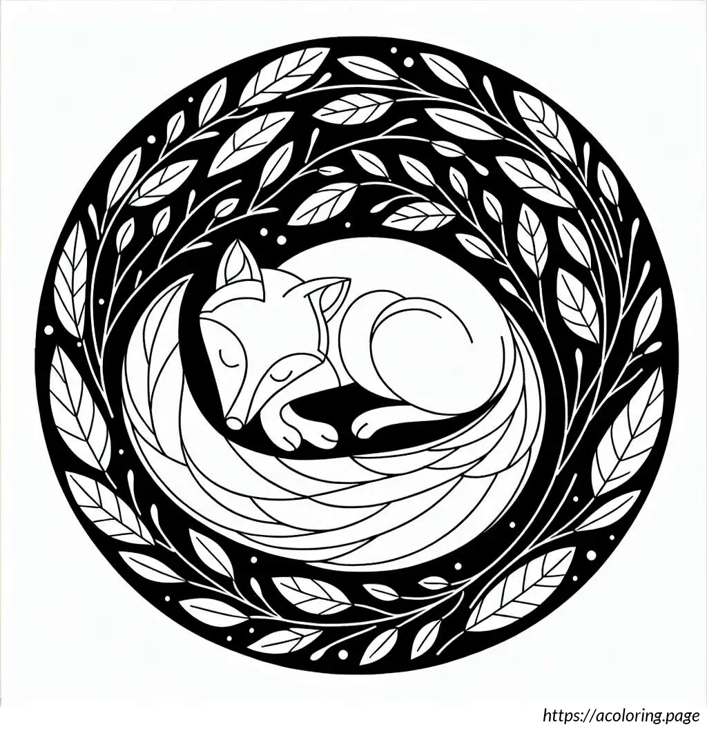 The image depicts a whimsical, cartoon-style drawing of an animal character curled up inside a structure resembling a hollowed-out, segmented sphere. The animal has distinct long ears, big, round eyes, and a playful expression, suggesting it is a fictional or stylized creature, possibly a rabbit due to its ears. There are a few leaf shapes scattered near and around the sphere, adding an outdoor, natural feel to the scene. The entire drawing is in black and white, outlined in bold, smooth lines giving it a clear and simple aesthetic suitable for coloring.