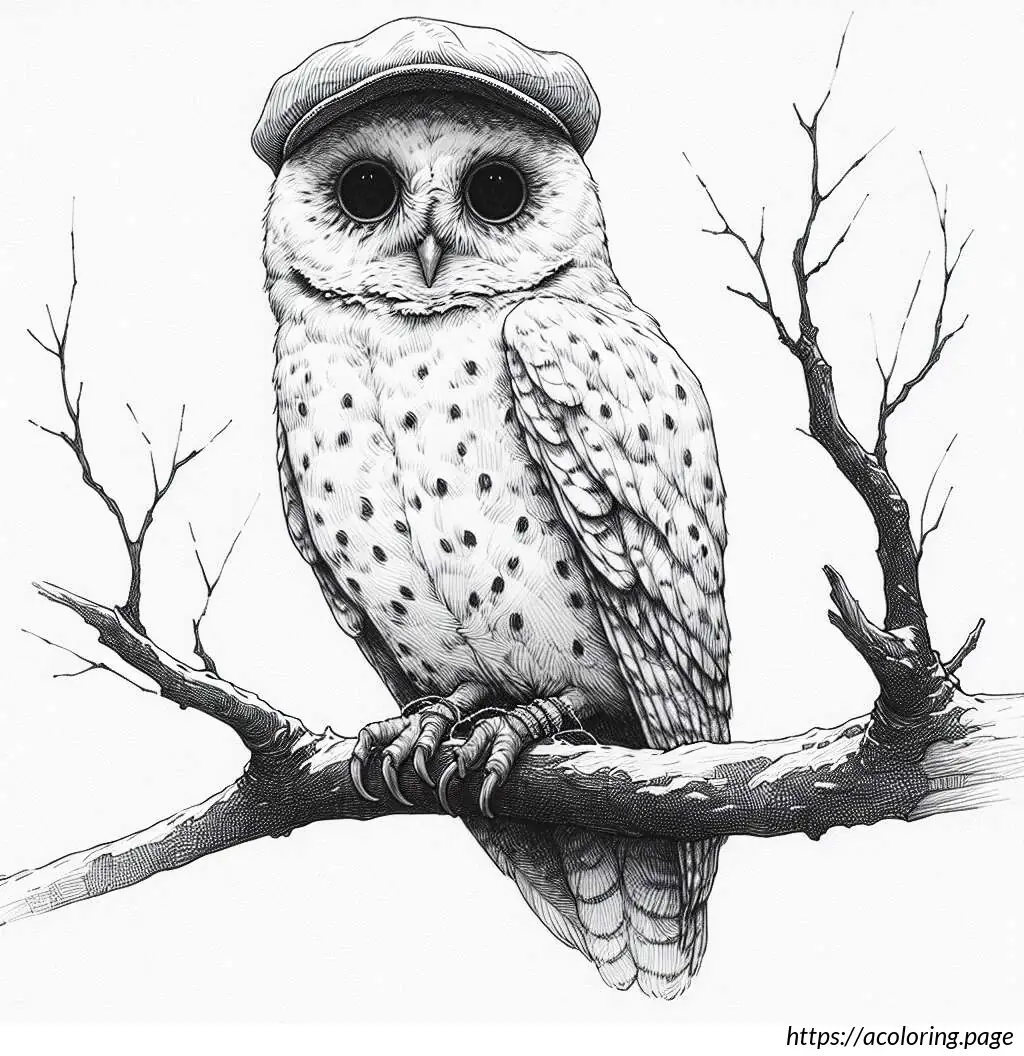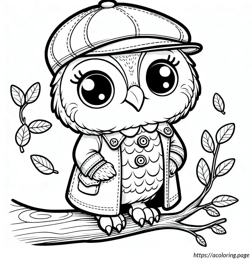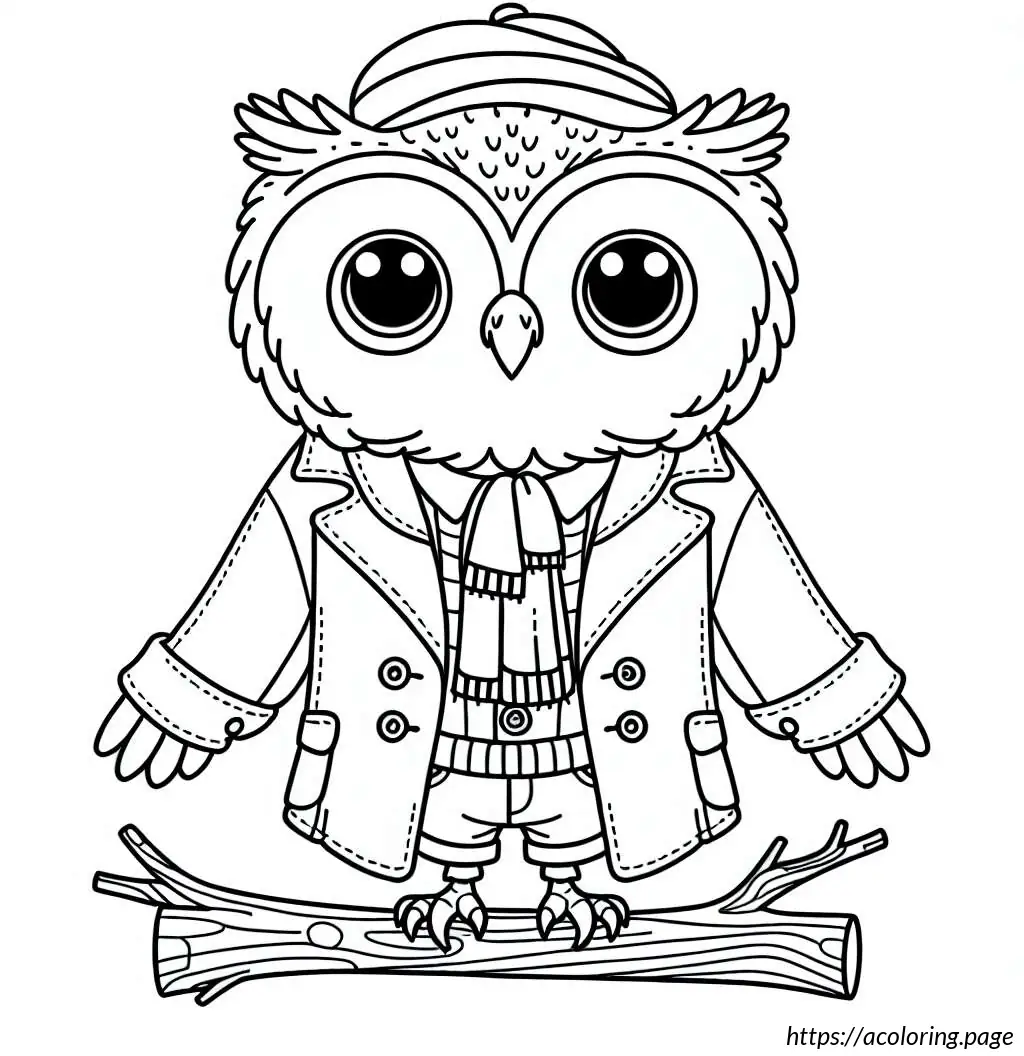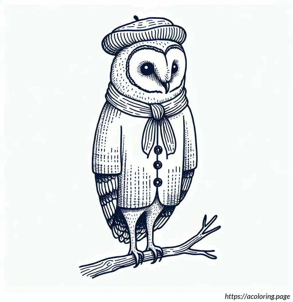 This image features a cartoon owl drawn in a simple black and white line art style. The owl is standing upright on a branch with its feet visible. It has large, round eyes and a small, triangular beak. The owl is wearing a shirt with a scarf around its neck, and over the shirt, it has a jacket or sweater buttoned up, showing three visible buttons. The wings of the owl resemble human arms as they extend to mimic the appearance of a person wearing a jacket. Additionally, the owl is wearing a cap, depicted in a style resembling a baseball cap but simplified. The overall appearance is quirky and anthropomorphic, as the owl has human-like features and clothing, making it look friendly and approachable.