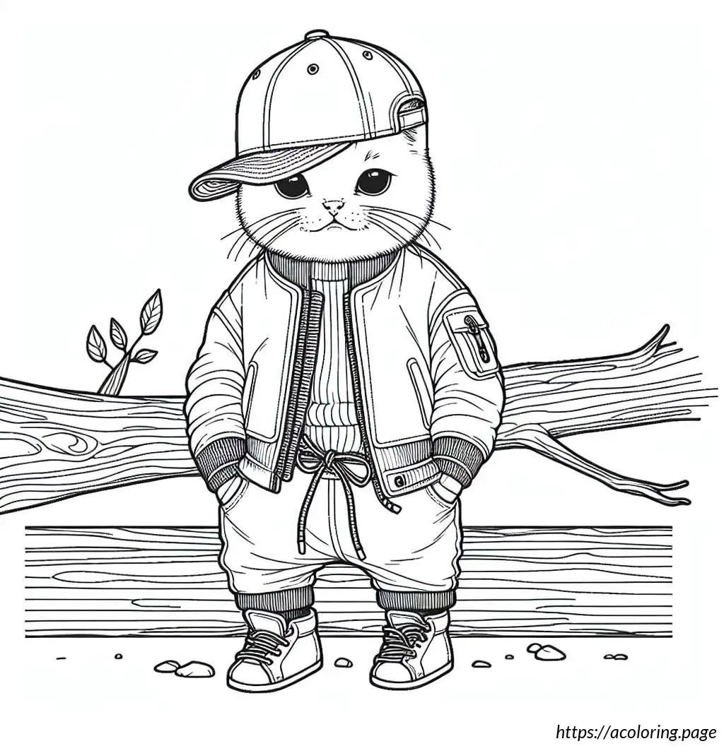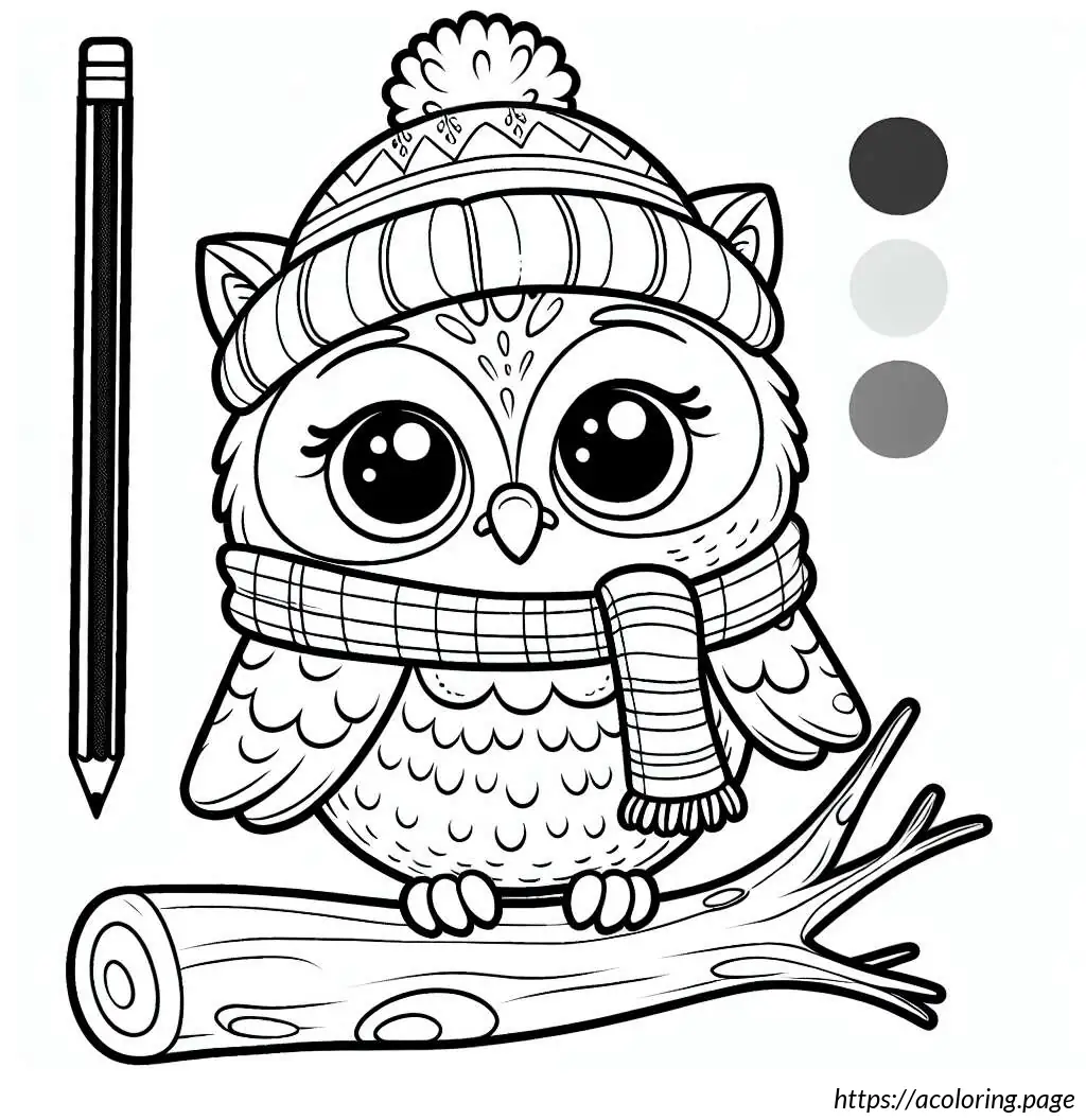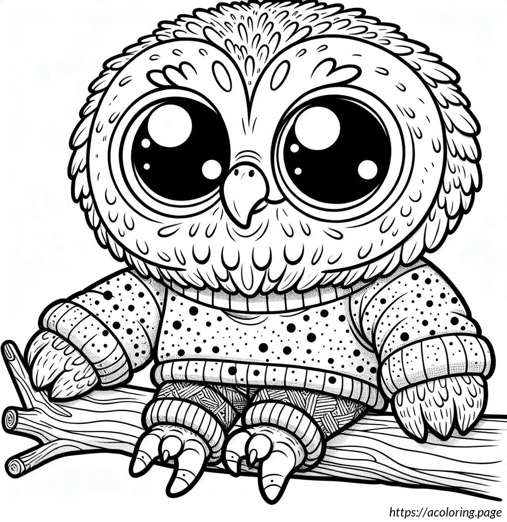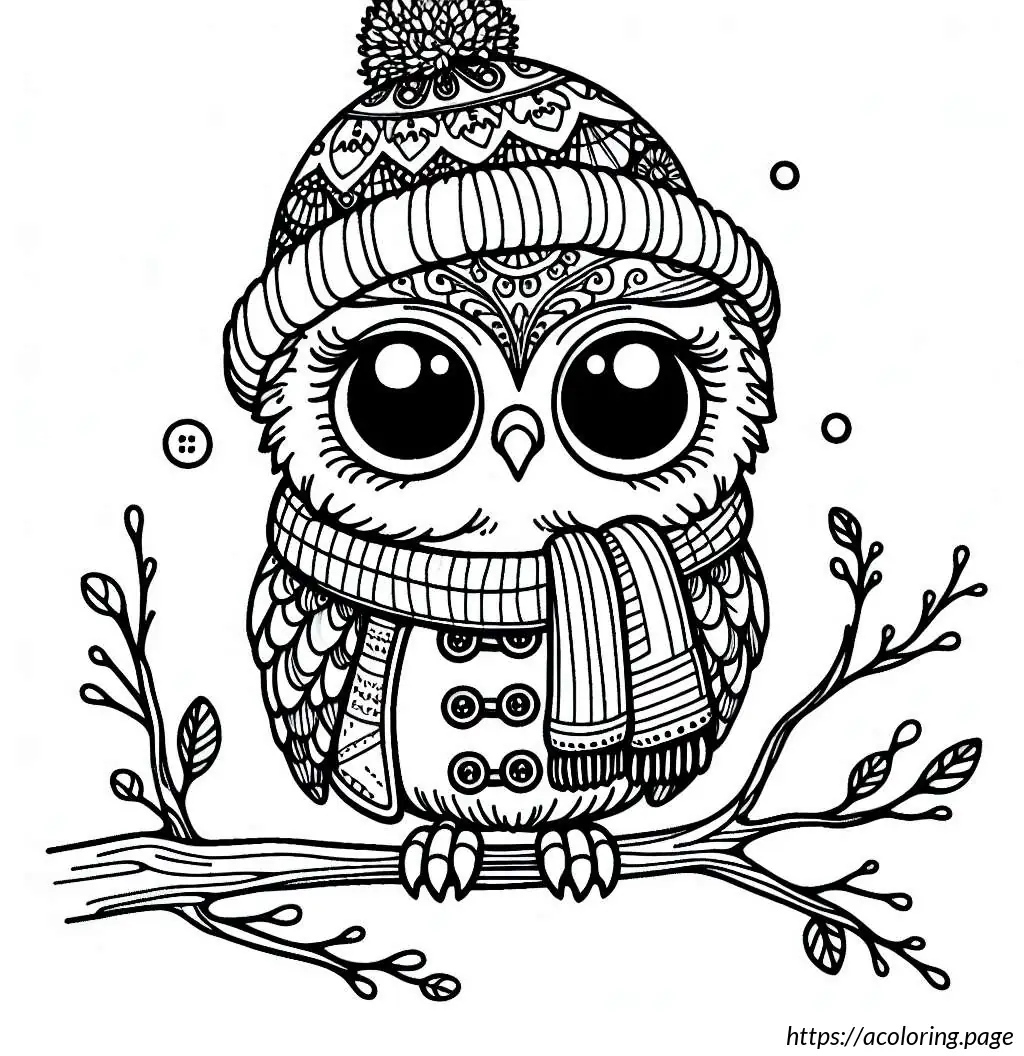 This image features a cartoon owl drawn in a simple black and white line art style. The owl is standing upright on a branch with its feet visible. It has large, round eyes and a small, triangular beak. The owl is wearing a shirt with a scarf around its neck, and over the shirt, it has a jacket or sweater buttoned up, showing three visible buttons. The wings of the owl resemble human arms as they extend to mimic the appearance of a person wearing a jacket. Additionally, the owl is wearing a cap, depicted in a style resembling a baseball cap but simplified. The overall appearance is quirky and anthropomorphic, as the owl has human-like features and clothing, making it look friendly and approachable.