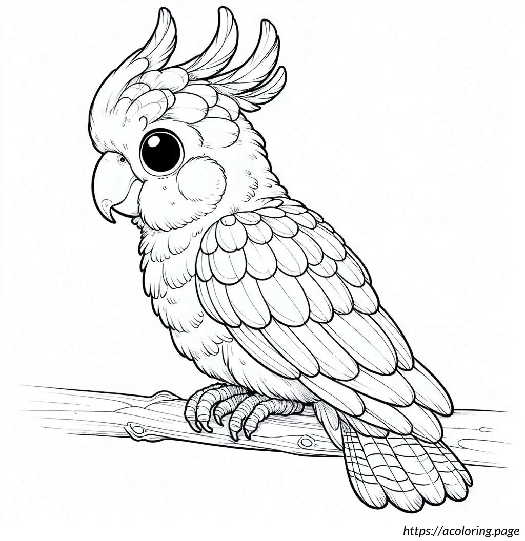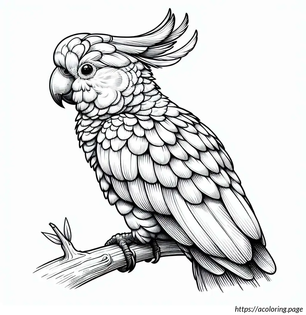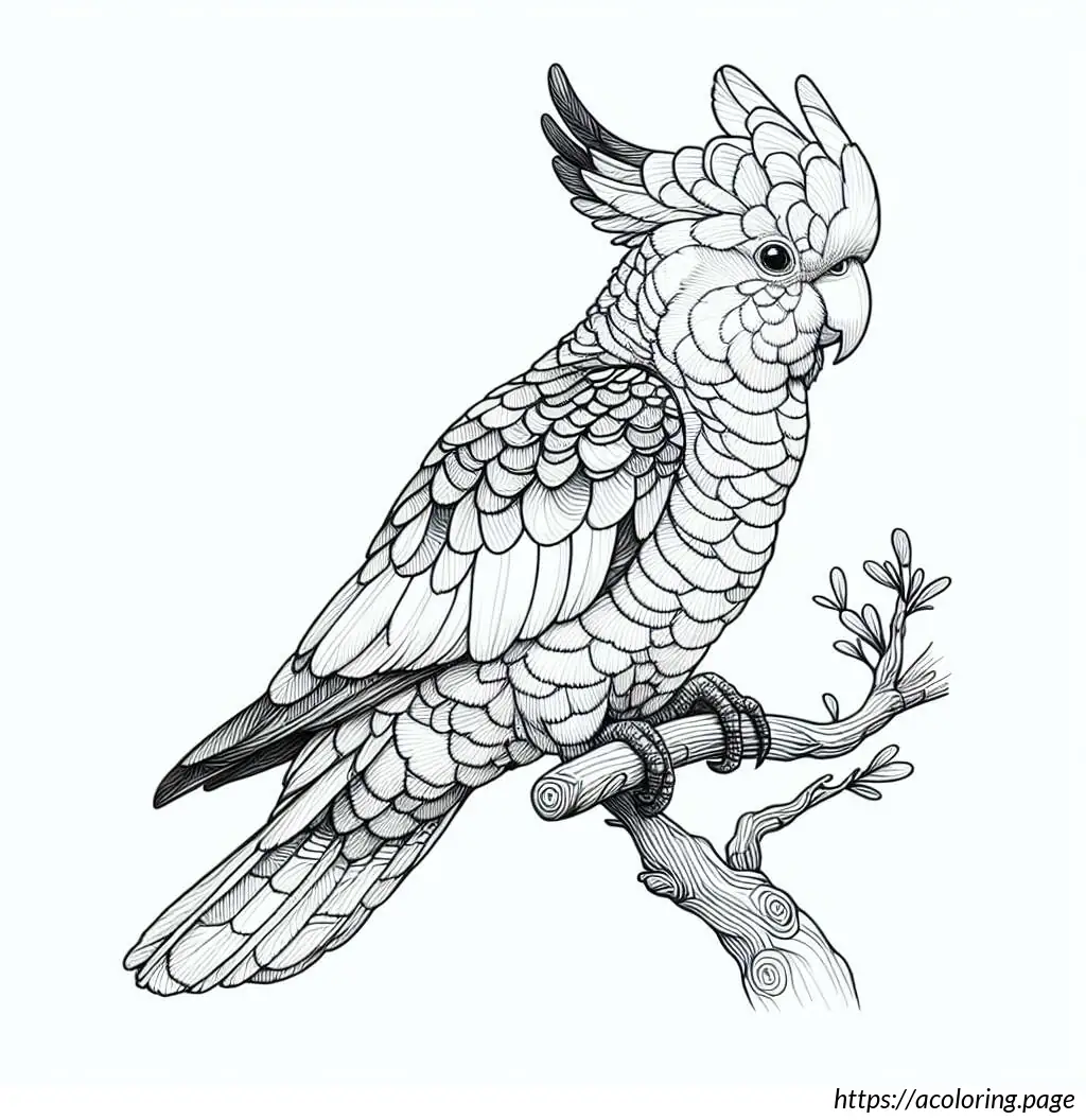 The image shows a stylized line drawing of a cockatoo. The bird is depicted perching on a branch. It has a prominent crest of feathers on its head, which are upright giving a somewhat alerted appearance. The cockatoo is shown in profile, facing to the left. Its eye is large and round, and it has a strong, curved beak that is characteristic of parrots. The feathers on its body are outlined with bold lines to indicate shadows and texture, with striping details on its chest and tail feathers. The branch it is perched on is relatively simple without much detail. The background of the image is plain, emphasizing the bird. This drawing seems suitable for coloring activities, given its clear and simple outlines.