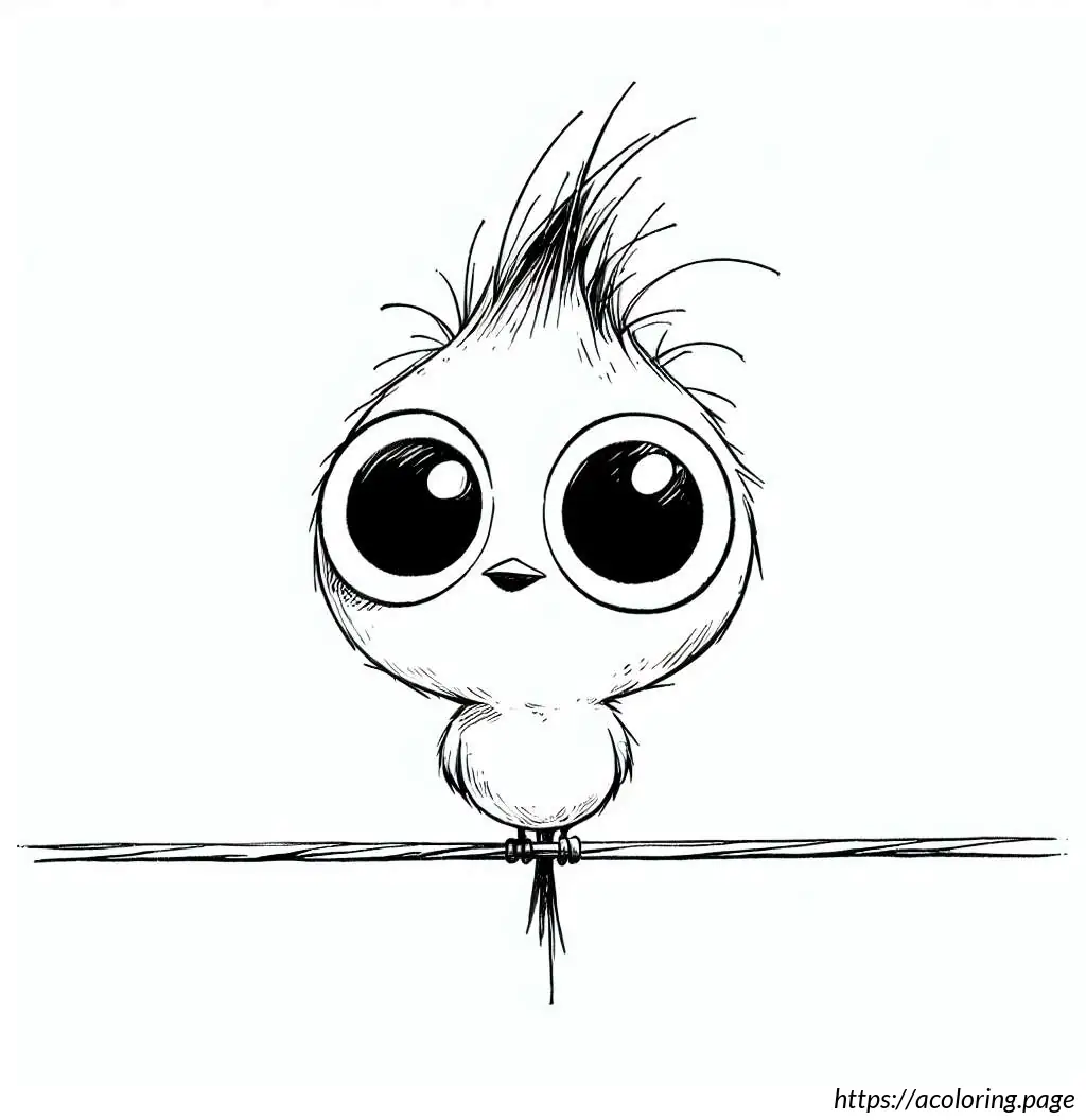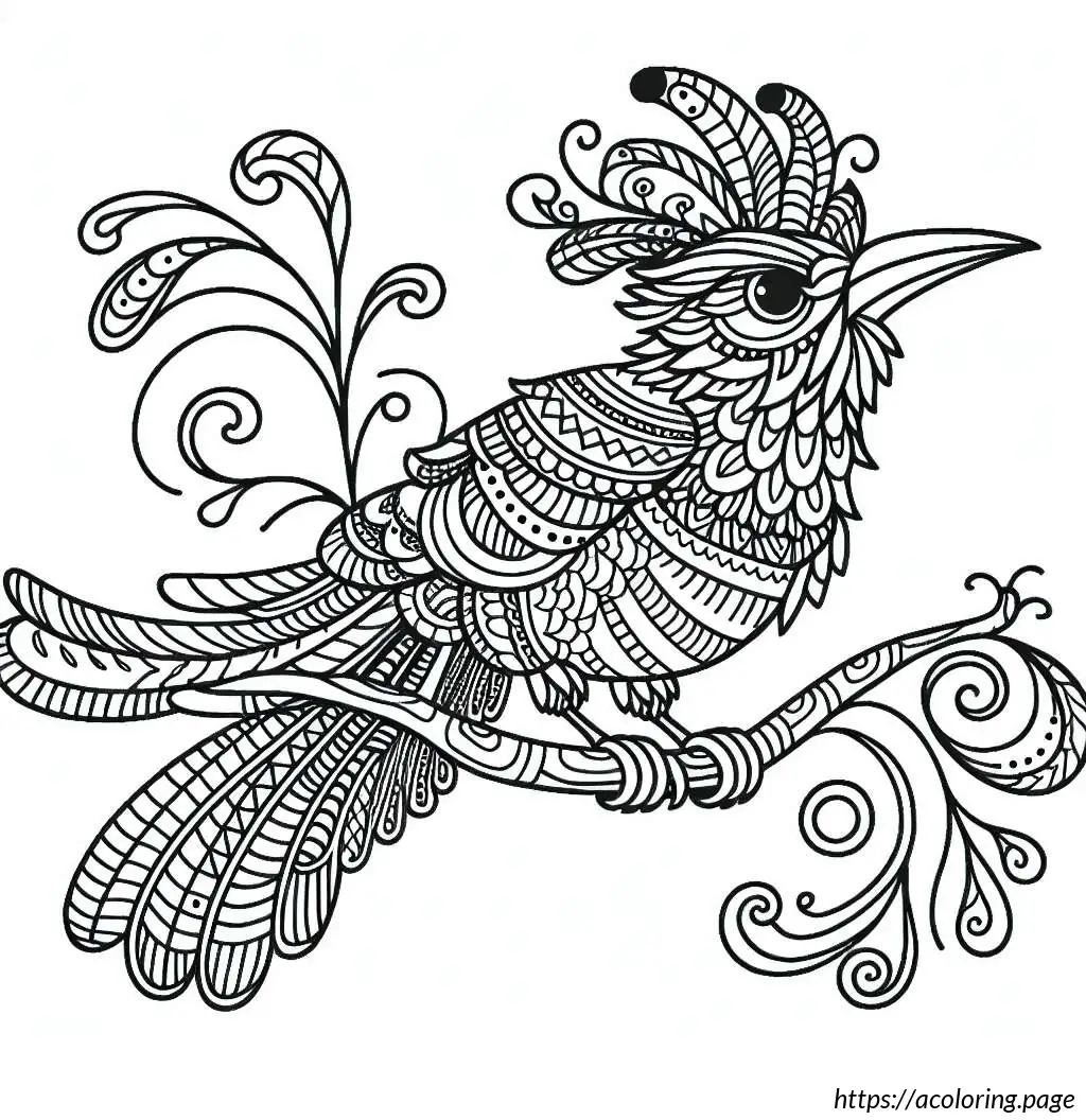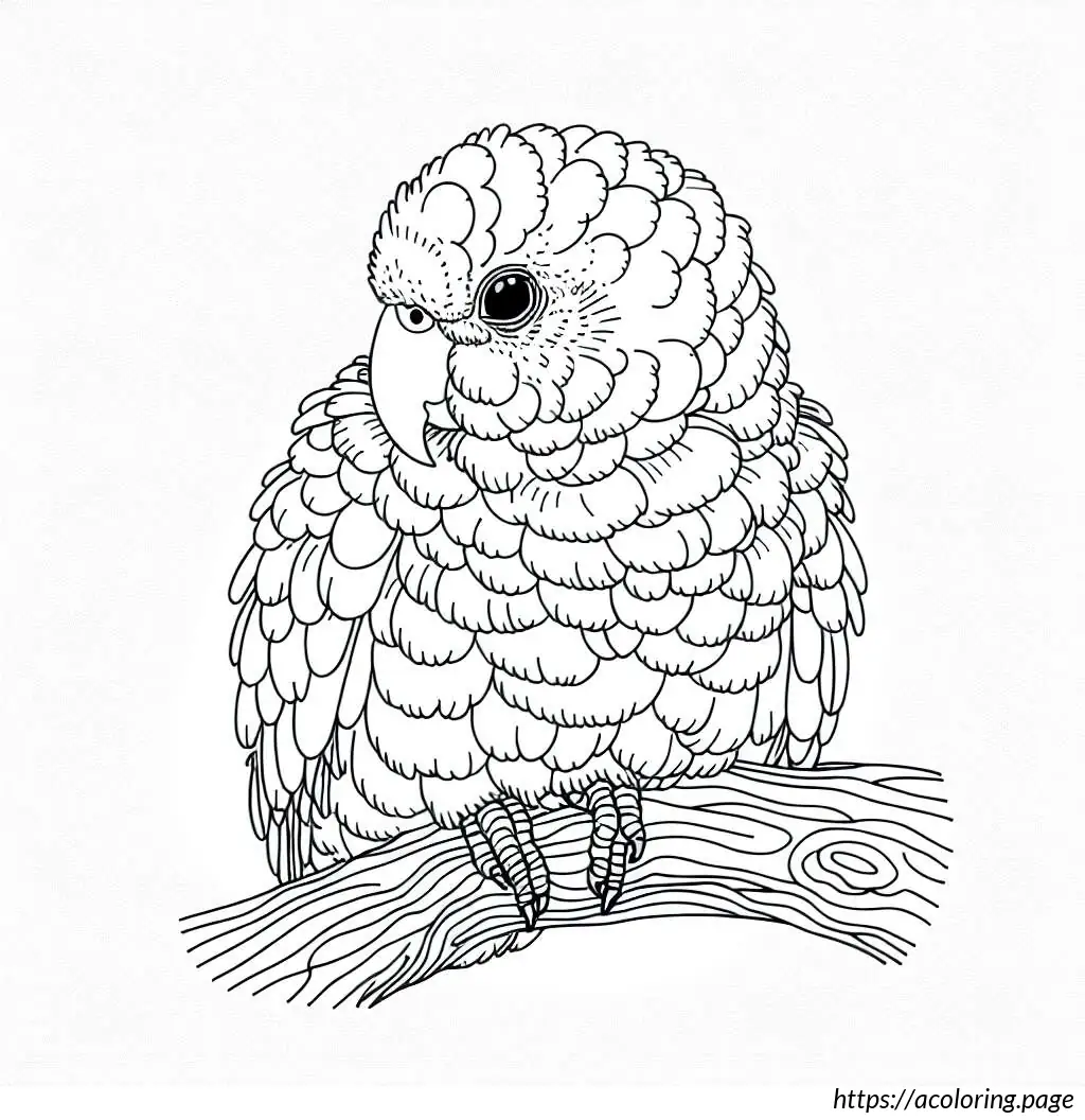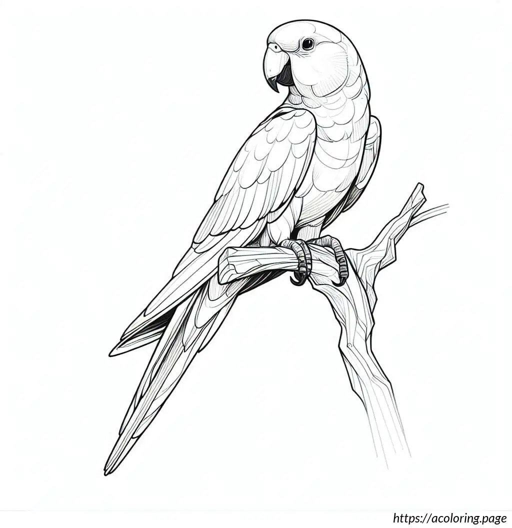 The image shows a stylized line drawing of a cockatoo. The bird is depicted perching on a branch. It has a prominent crest of feathers on its head, which are upright giving a somewhat alerted appearance. The cockatoo is shown in profile, facing to the left. Its eye is large and round, and it has a strong, curved beak that is characteristic of parrots. The feathers on its body are outlined with bold lines to indicate shadows and texture, with striping details on its chest and tail feathers. The branch it is perched on is relatively simple without much detail. The background of the image is plain, emphasizing the bird. This drawing seems suitable for coloring activities, given its clear and simple outlines.