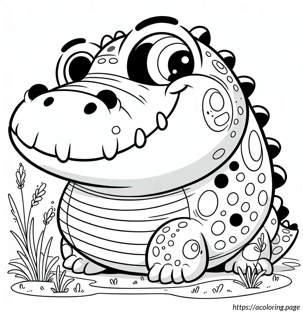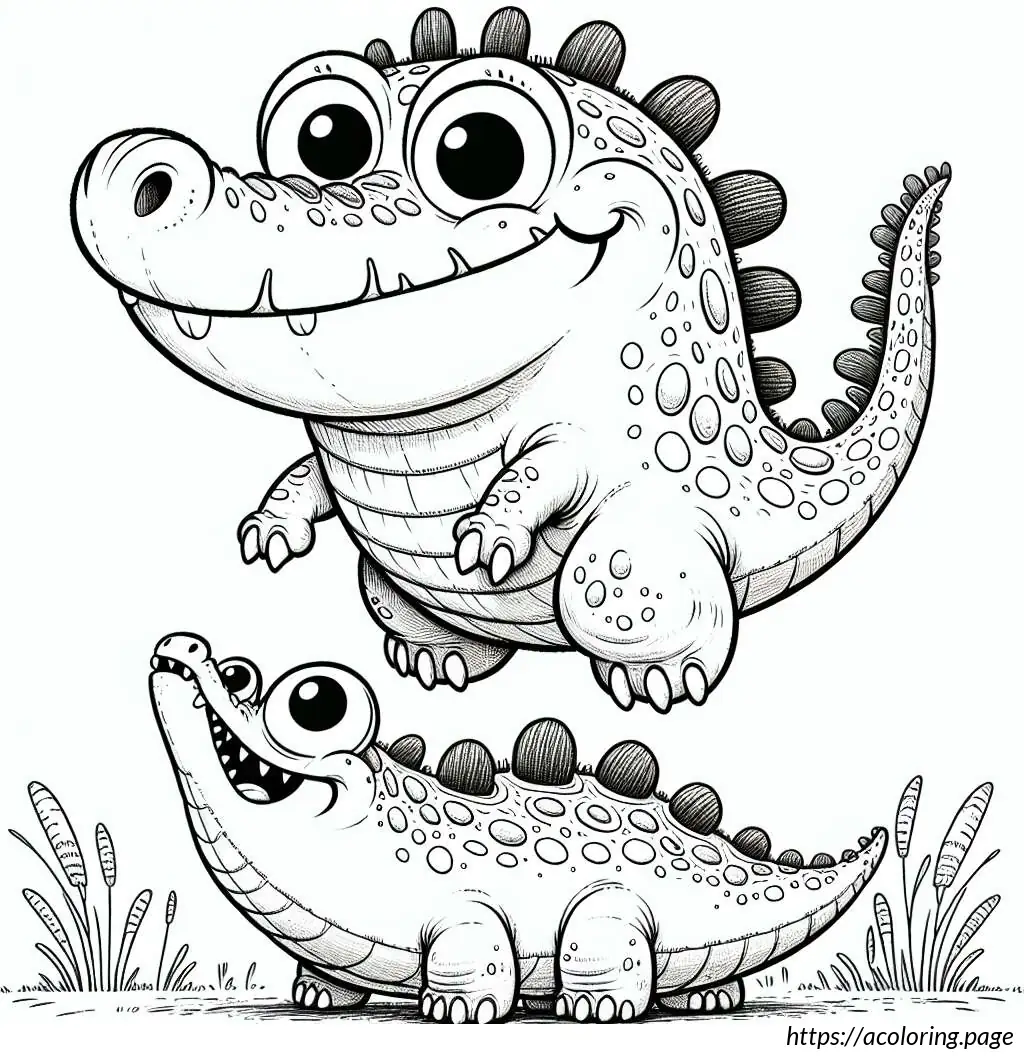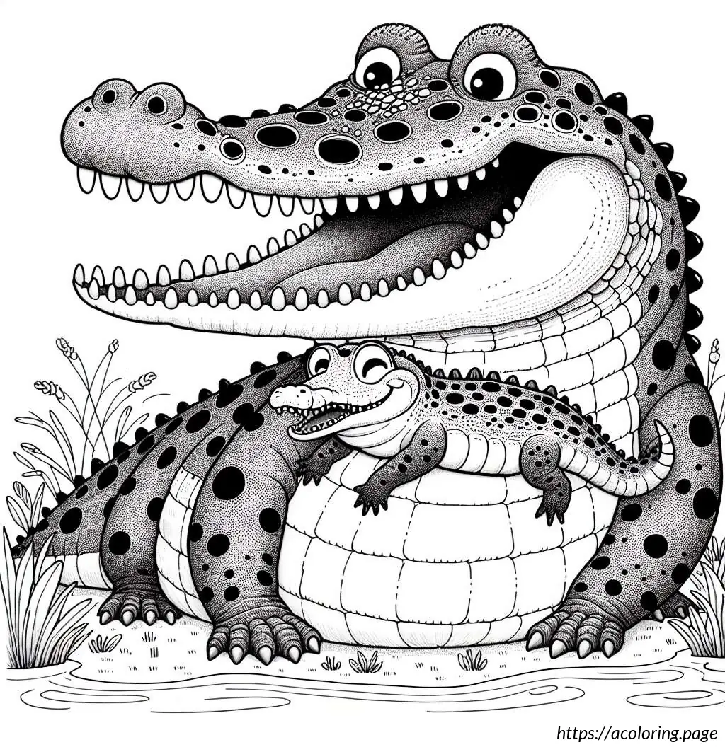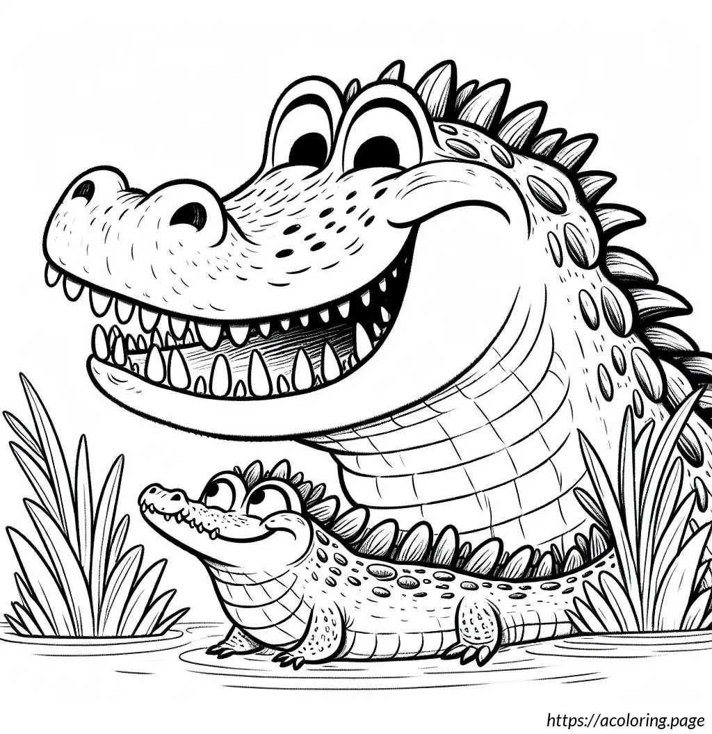 The image depicts a whimsical, cartoon-style drawing of two alligators. The larger alligator is on top, drawn with an exaggerated, spikey back and a broad, cheerful smile on its face. It has large, rounded eyes, adding to its friendly appearance. The smaller alligator, nested within the mouth of the larger one, mirrors the larger alligator”s smile and also sports a set of spikey features along its back. Both appear content, and their poses suggest a playful interaction rather than aggression.The scene is minimalistic, with only a few tufts of grass sketched at the bottom, and it is contained within a simple outline that suggests a riverbank or a similar natural setting. The style is bold and clear, likely designed to appeal to children or for use as a coloring page.