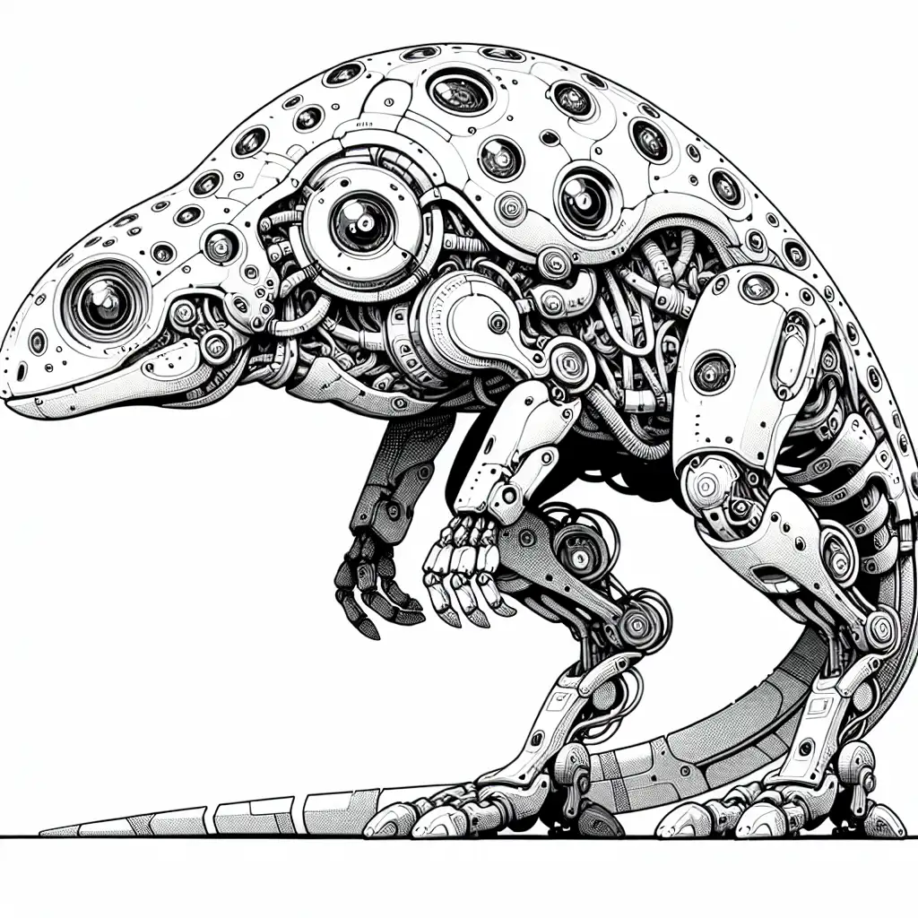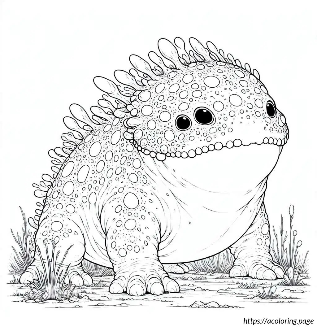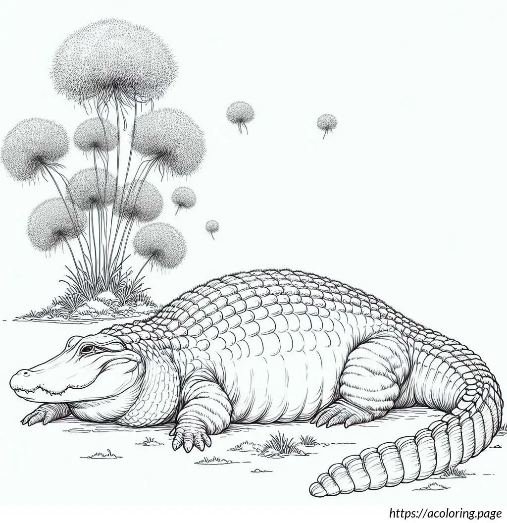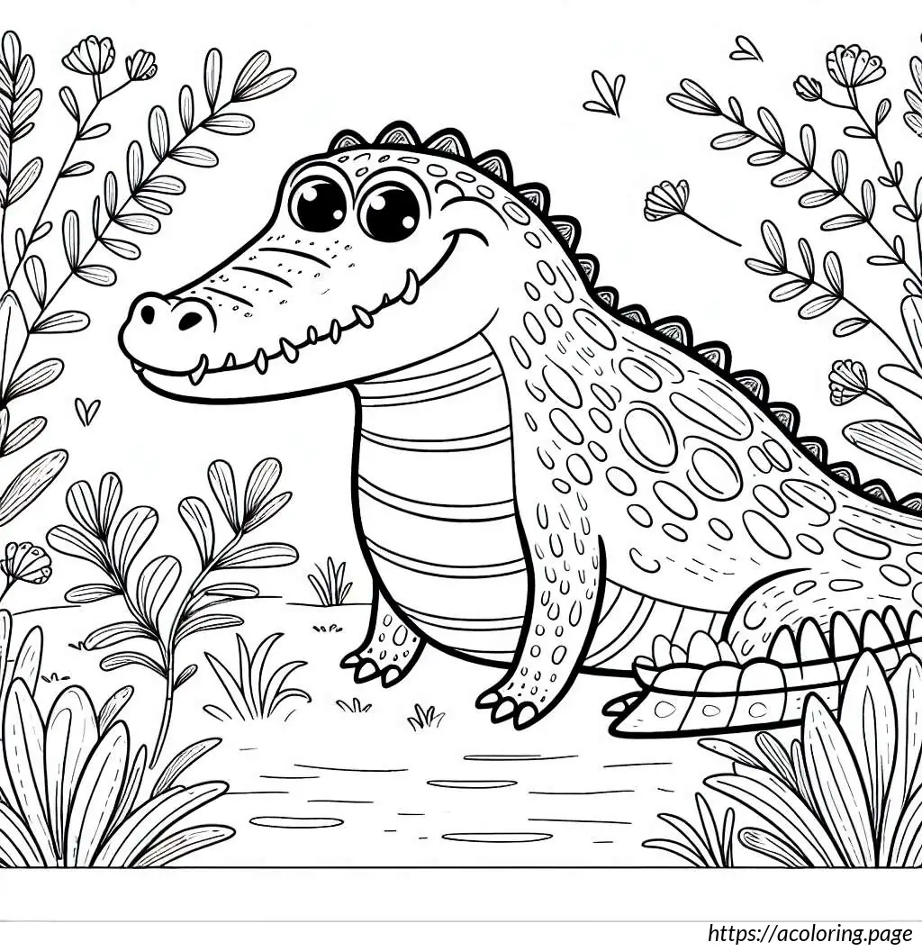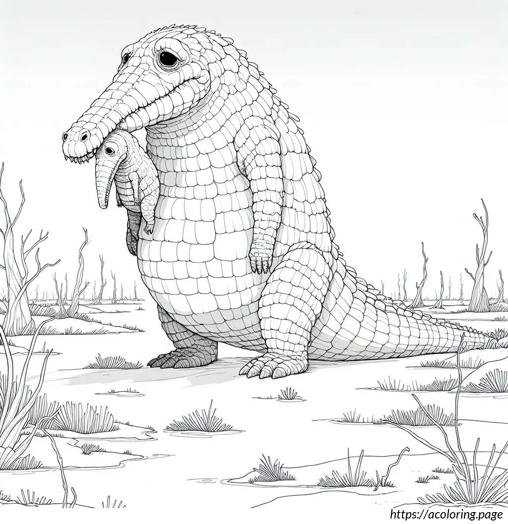 The image depicts a whimsical, cartoon-style drawing of two alligators. The larger alligator is on top, drawn with an exaggerated, spikey back and a broad, cheerful smile on its face. It has large, rounded eyes, adding to its friendly appearance. The smaller alligator, nested within the mouth of the larger one, mirrors the larger alligator”s smile and also sports a set of spikey features along its back. Both appear content, and their poses suggest a playful interaction rather than aggression.The scene is minimalistic, with only a few tufts of grass sketched at the bottom, and it is contained within a simple outline that suggests a riverbank or a similar natural setting. The style is bold and clear, likely designed to appeal to children or for use as a coloring page.
