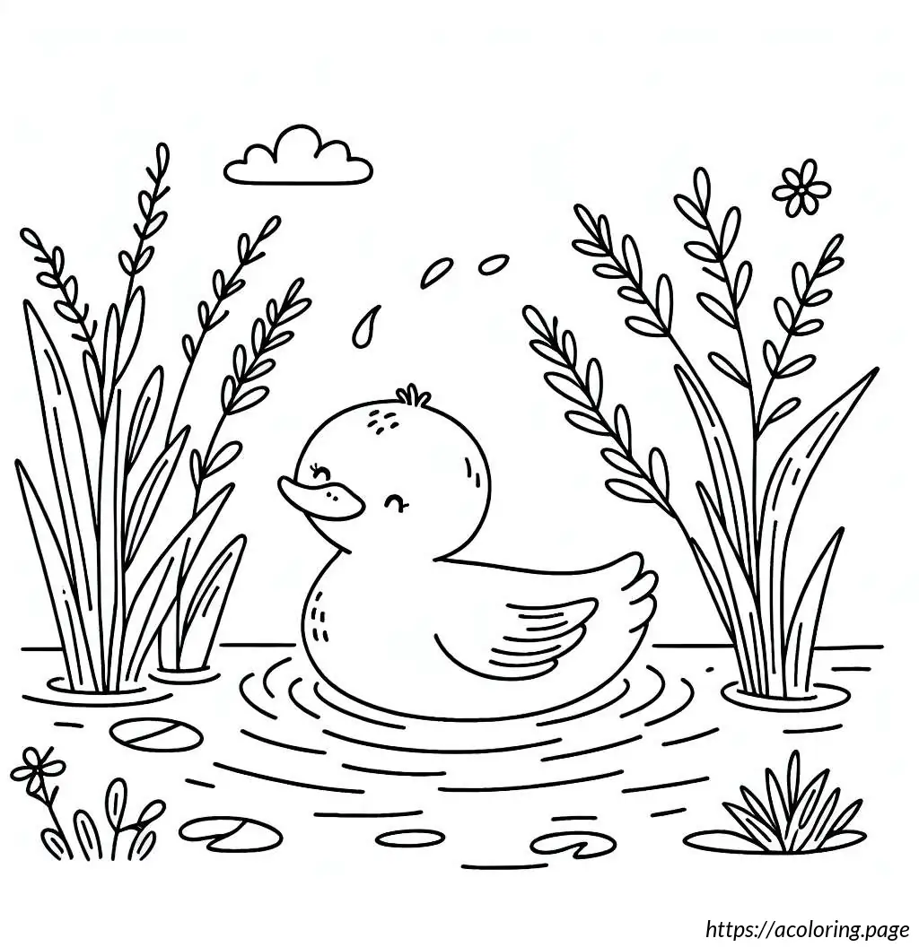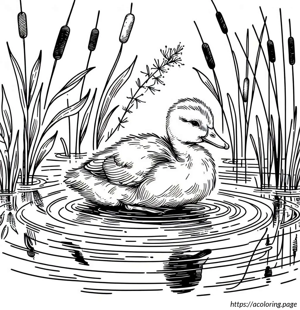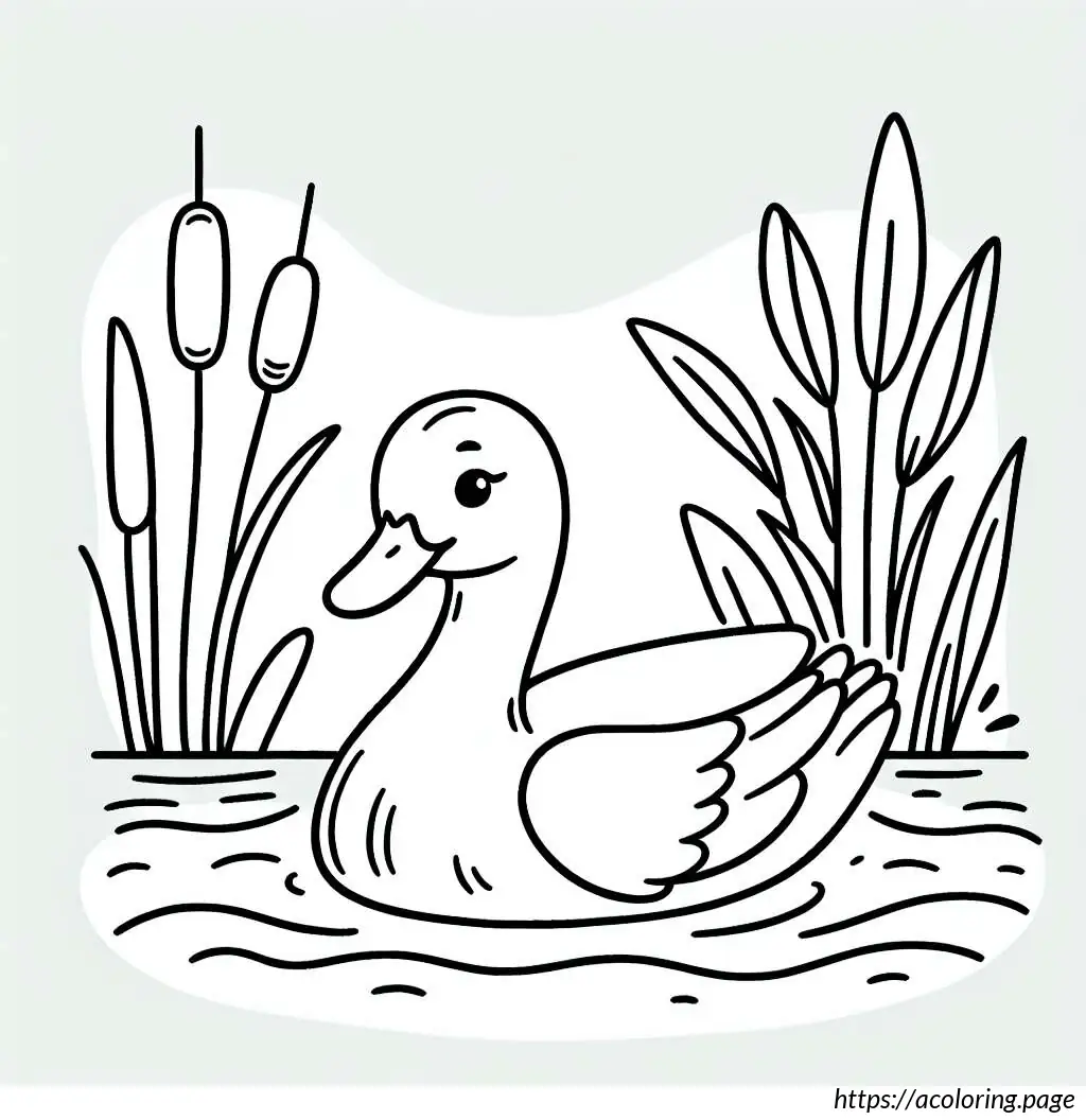 This image depicts a simple line drawing of a duck in water. The duck, looking serene and slightly amused, is shown slightly turned to the left side. Its facial expression suggests a calm or content mood, given the gentle, closed eye and a faint smile. There are a few waves illustrated under the duck, indicating it is in water. To the left side of the duck, there are three long-stemmed plants with oval-shaped tips, likely representing reeds or cattails typically found near water bodies. The overall style is cartoonish and minimalist, employing only line art without color fill.