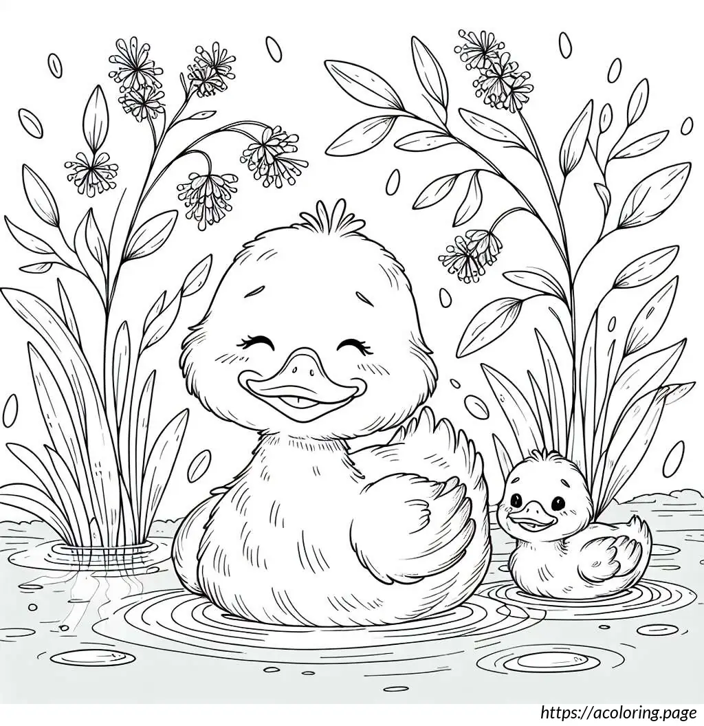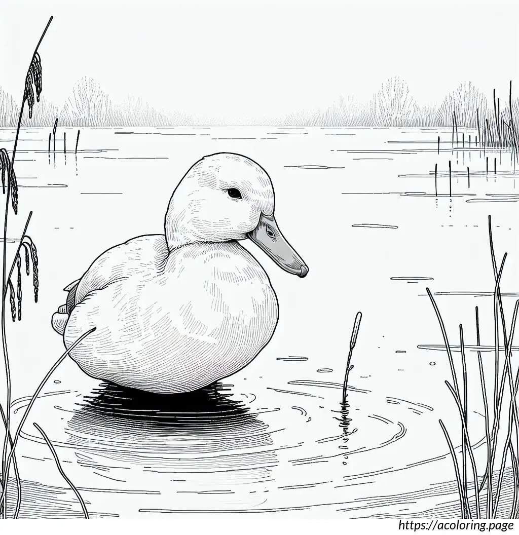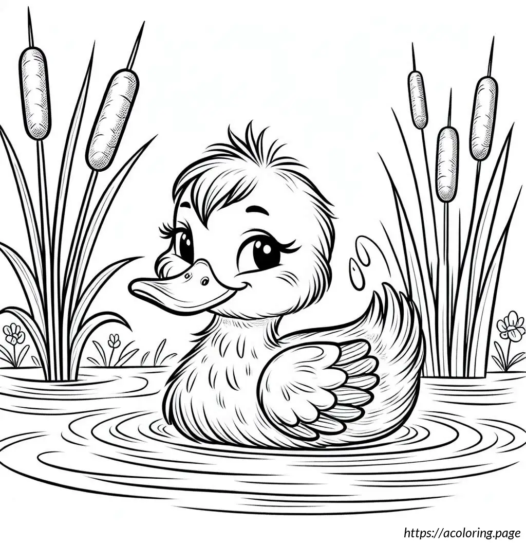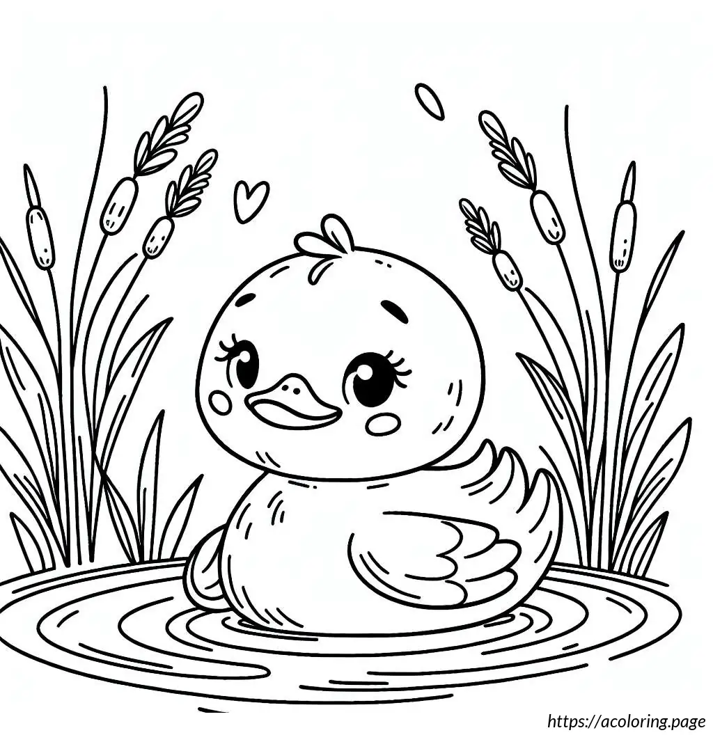 This image depicts a simple line drawing of a duck in water. The duck, looking serene and slightly amused, is shown slightly turned to the left side. Its facial expression suggests a calm or content mood, given the gentle, closed eye and a faint smile. There are a few waves illustrated under the duck, indicating it is in water. To the left side of the duck, there are three long-stemmed plants with oval-shaped tips, likely representing reeds or cattails typically found near water bodies. The overall style is cartoonish and minimalist, employing only line art without color fill.