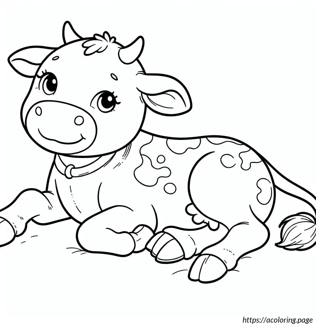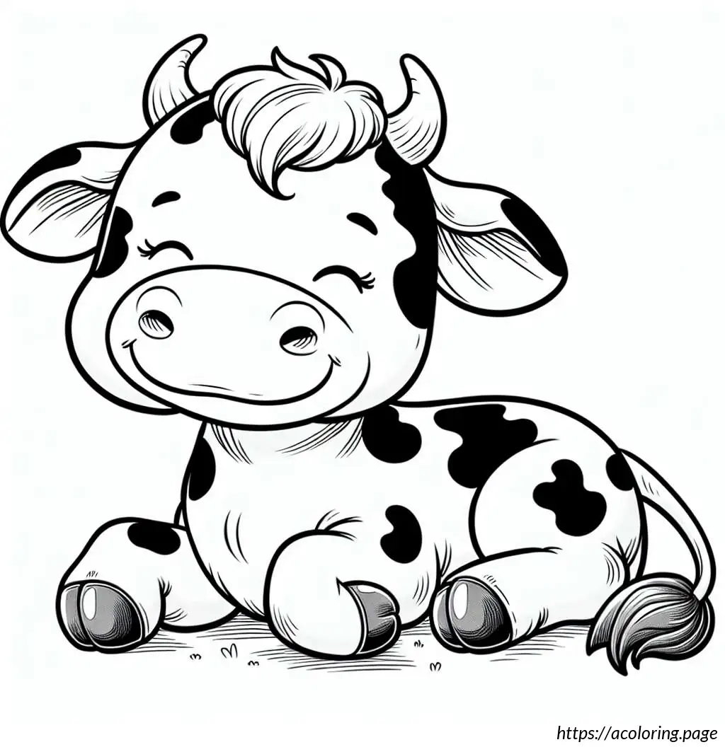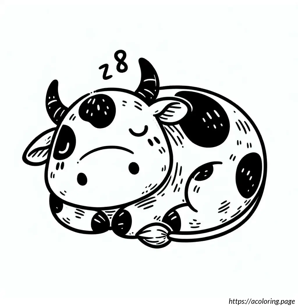 This image features a line drawing of a cute, cartoon-style cow. The cow is illustrated in a simplistic and playful manner, with its body in a reclining pose facing the viewer. Its head is turned with a gentle, sleep-like expression, characterized by closed eyes that have long eyelashes, adding to its adorable charm. The cow has discernible patches on its body, which is typical for cows, hinting at a familiar black-and-white pattern but without color since the image is in black line art. It has four visible legs, with the hooves simplified into small, rounded ends, and a tail that curls at the end. The cow also exhibits two small horns and floppy ears, adding to its whimsical appearance. The overall style is minimalistic, emphasizing contours without any internal detail or shading.