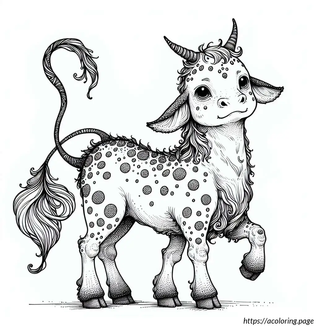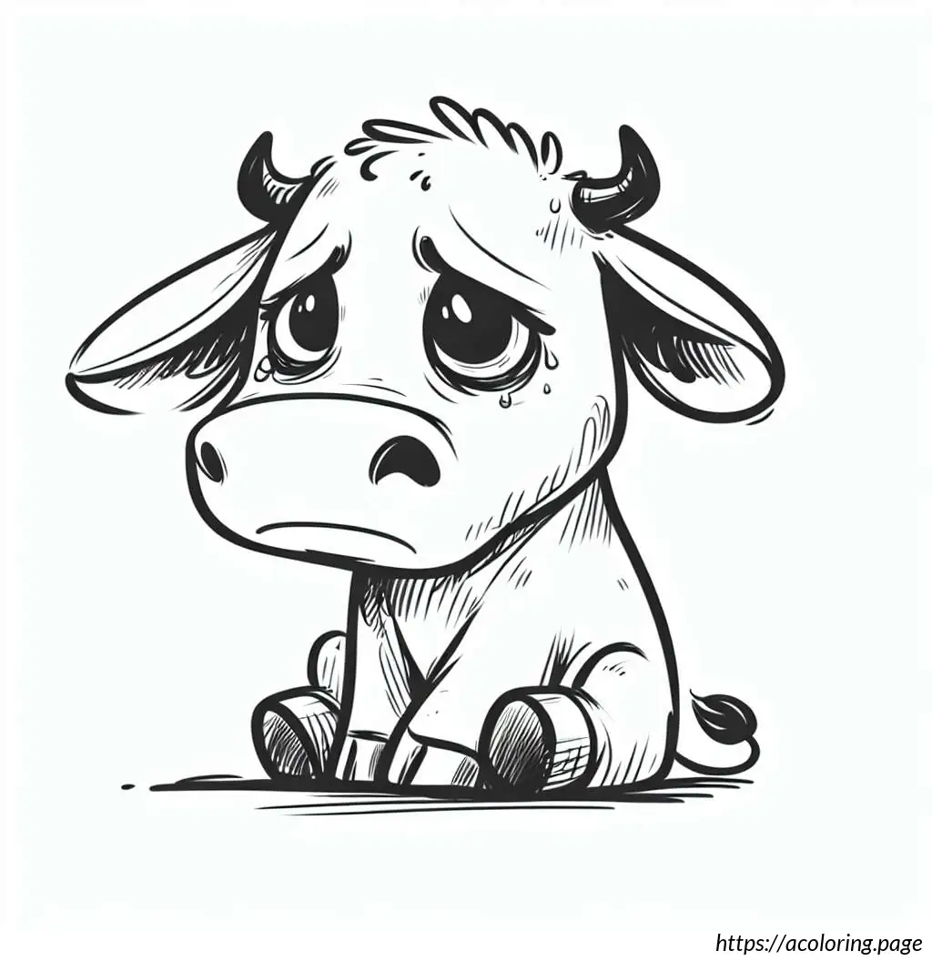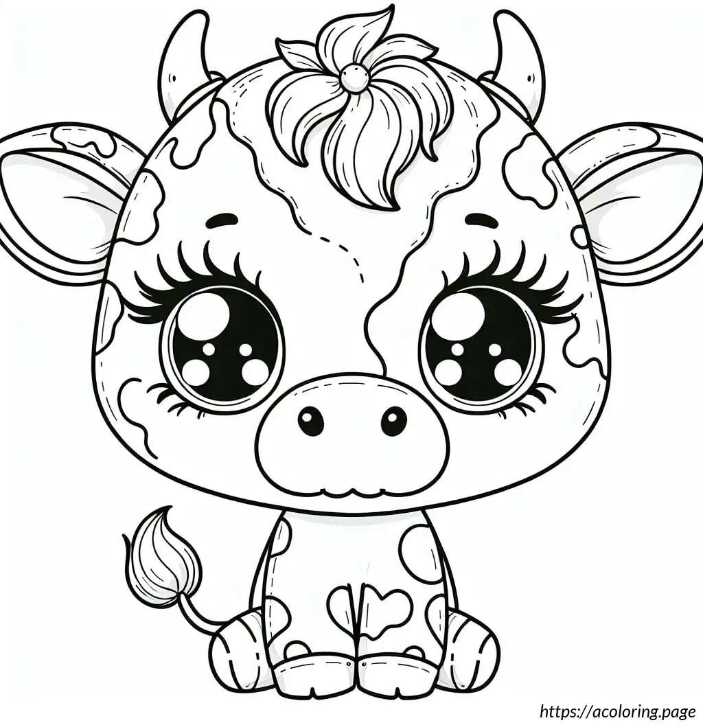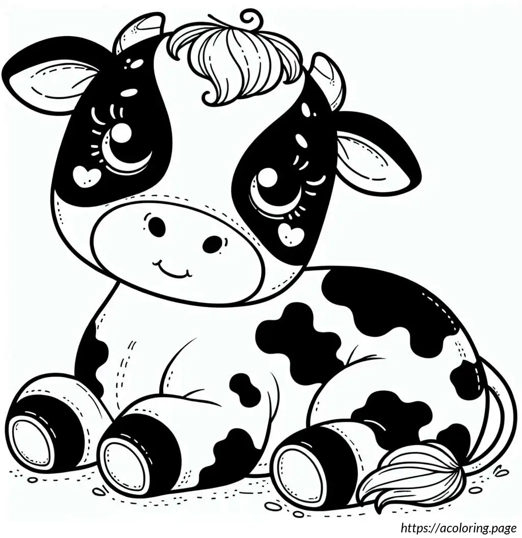 This image features a line drawing of a cute, cartoon-style cow. The cow is illustrated in a simplistic and playful manner, with its body in a reclining pose facing the viewer. Its head is turned with a gentle, sleep-like expression, characterized by closed eyes that have long eyelashes, adding to its adorable charm. The cow has discernible patches on its body, which is typical for cows, hinting at a familiar black-and-white pattern but without color since the image is in black line art. It has four visible legs, with the hooves simplified into small, rounded ends, and a tail that curls at the end. The cow also exhibits two small horns and floppy ears, adding to its whimsical appearance. The overall style is minimalistic, emphasizing contours without any internal detail or shading.