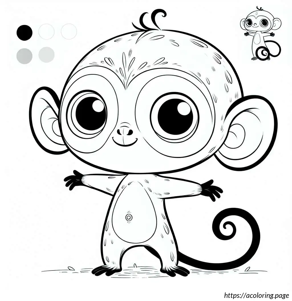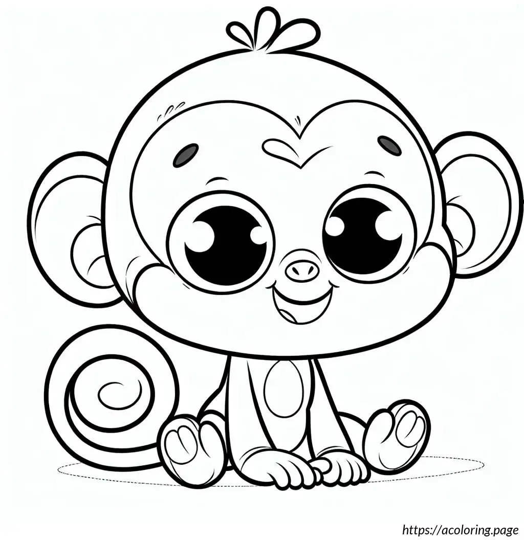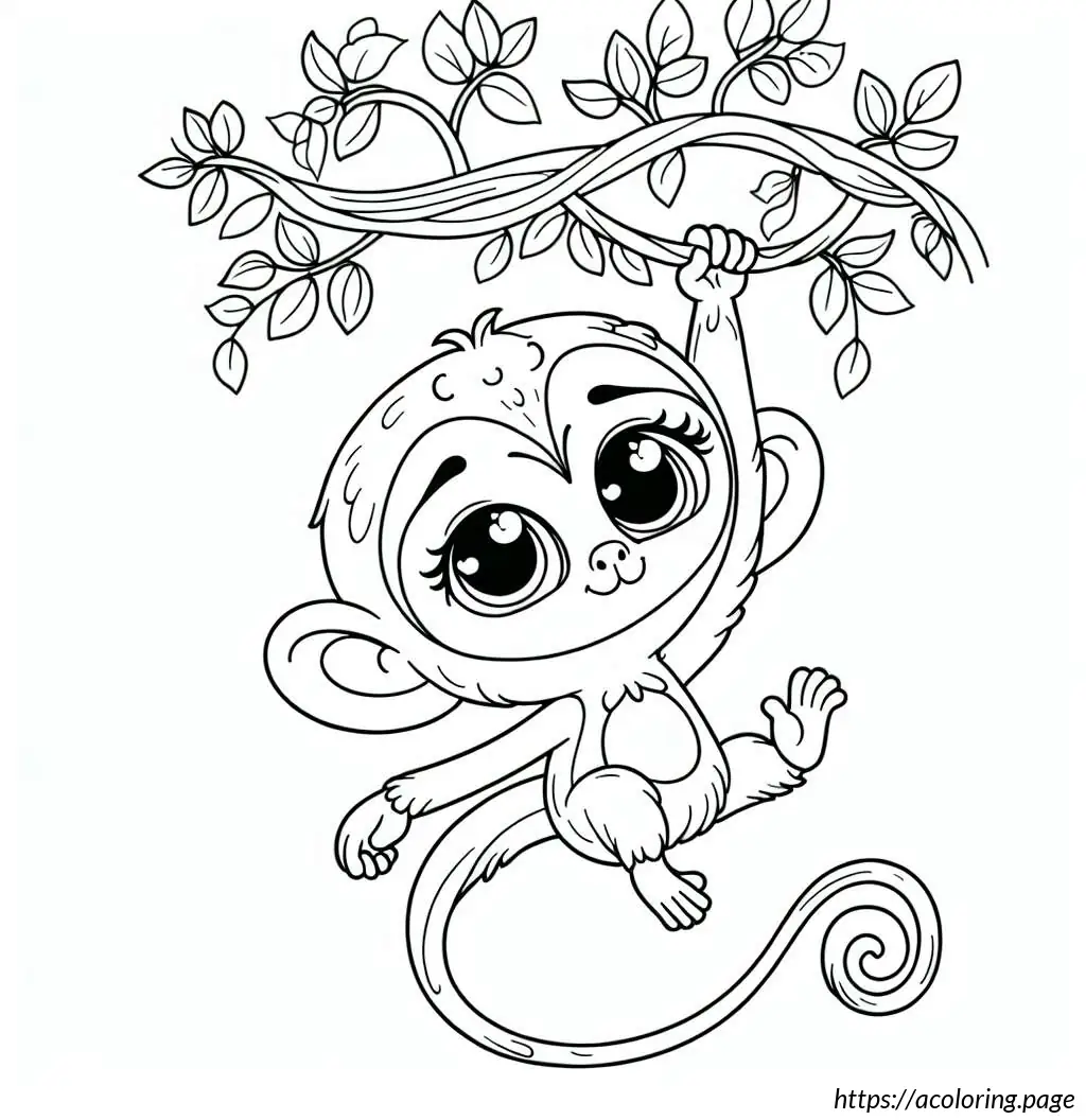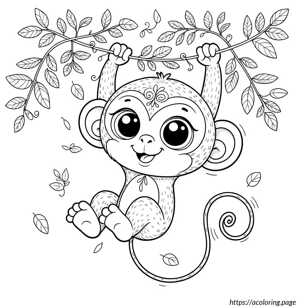 The image is a simple black and white line drawing of a cute monkey. The monkey is standing upright, facing the viewer. It has an oversized head with large eyes and a protruding nose, giving it a friendly, cartoony appearance. The monkey’s ears are positioned on either side of its head, mimicking the position of human ears. It has a small tuft of hair on top of its head.The monkey’s arms are raised and spread out, grasping onto vines, suggesting that it is hanging or swinging from them. Its body is somewhat elongated with a large, rounded belly marked by a simple circle, perhaps representing its navel. The monkey”s legs are short, ending in small, defined feet. Its tail curls up in a playful spiral at the end.Overall, the style of the drawing is very simplistic and appears to be aimed at children, perfect for coloring activities.