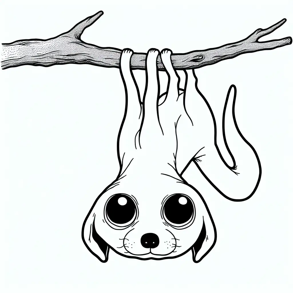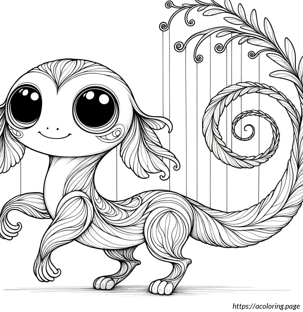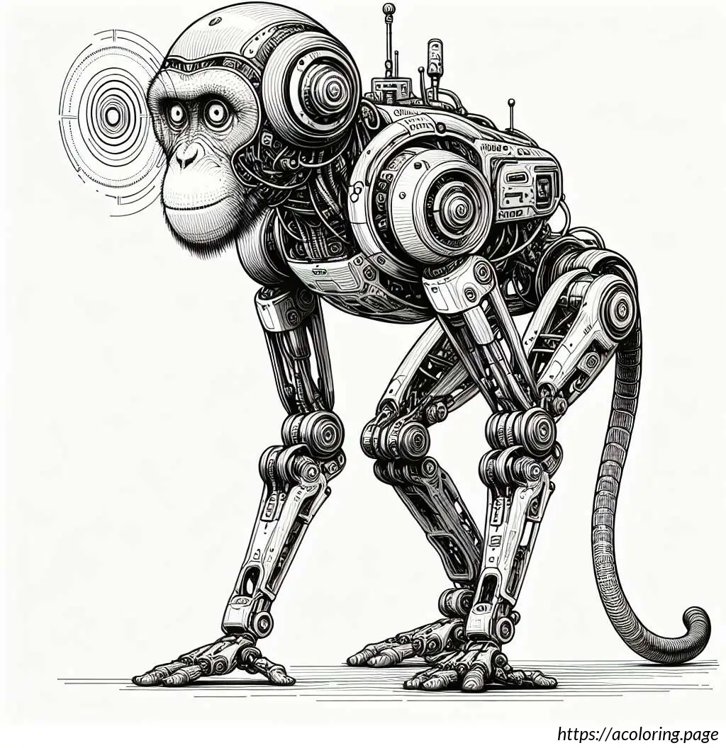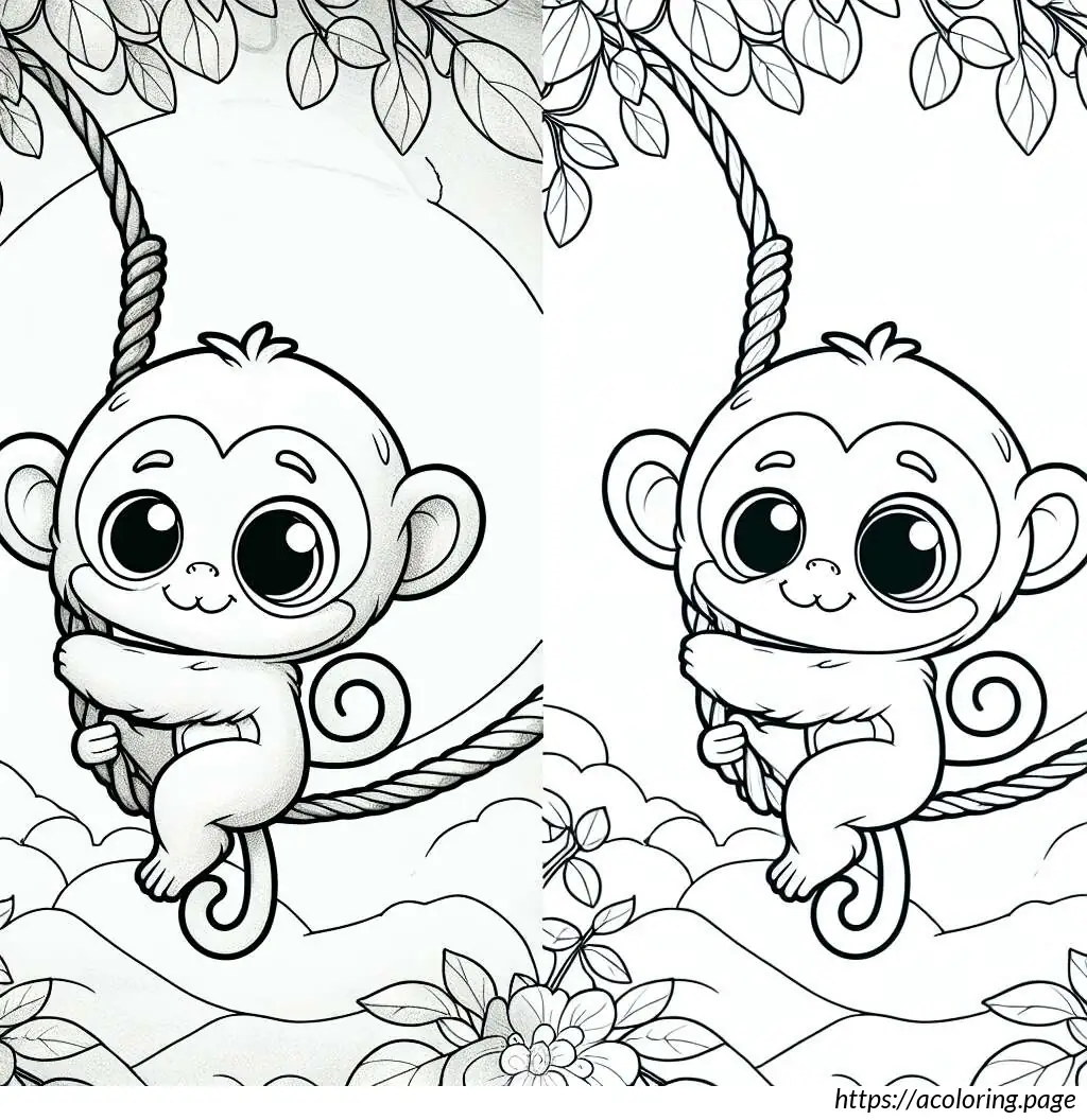 The image is a simple black and white line drawing of a cute monkey. The monkey is standing upright, facing the viewer. It has an oversized head with large eyes and a protruding nose, giving it a friendly, cartoony appearance. The monkey’s ears are positioned on either side of its head, mimicking the position of human ears. It has a small tuft of hair on top of its head.The monkey’s arms are raised and spread out, grasping onto vines, suggesting that it is hanging or swinging from them. Its body is somewhat elongated with a large, rounded belly marked by a simple circle, perhaps representing its navel. The monkey”s legs are short, ending in small, defined feet. Its tail curls up in a playful spiral at the end.Overall, the style of the drawing is very simplistic and appears to be aimed at children, perfect for coloring activities.