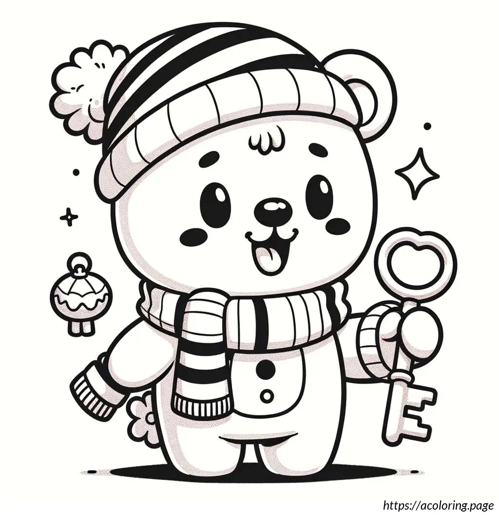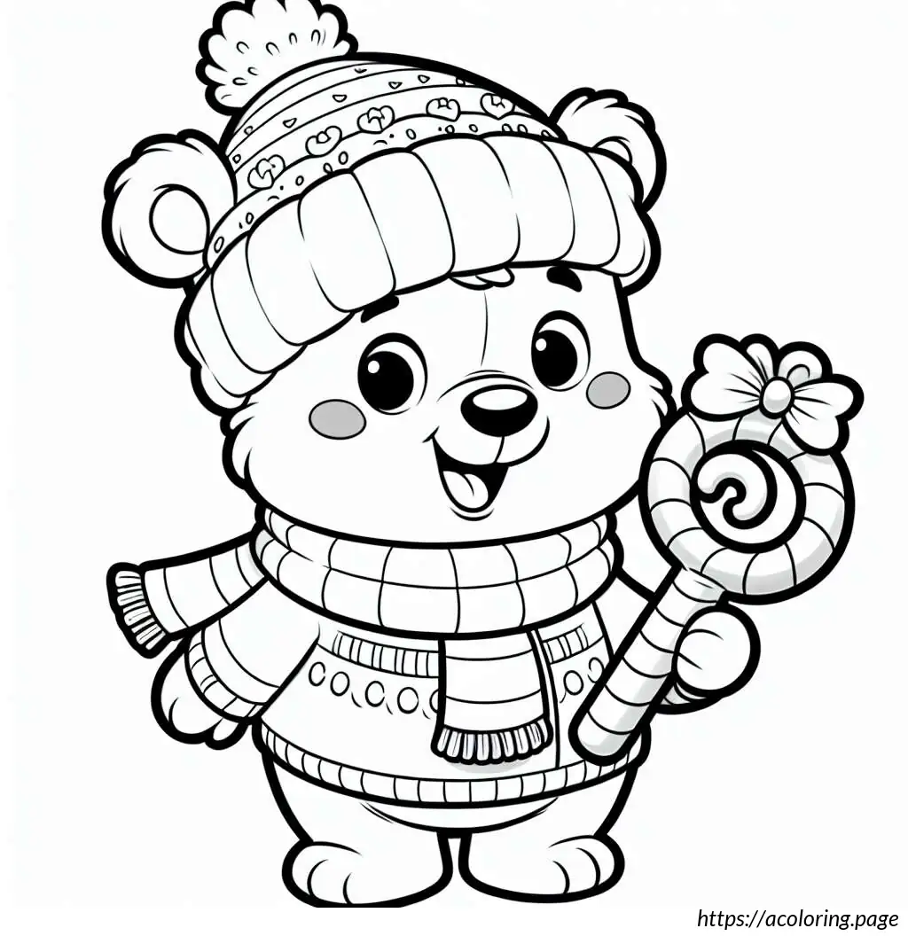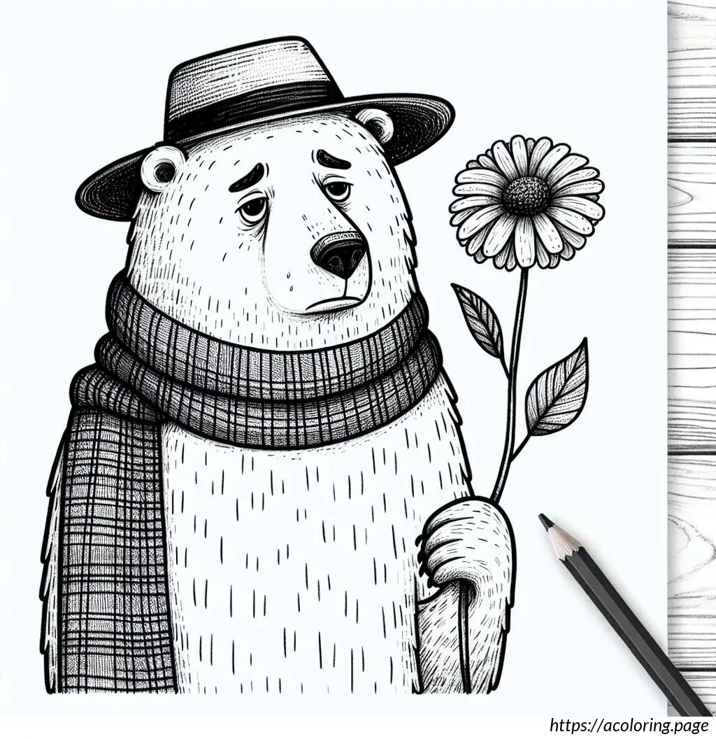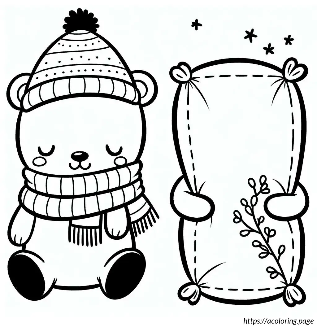 The image shows a cartoon drawing of a bear-like figure. It appears to be wearing a scarf and a sleeping cap with a pom-pom on the tip. The character is hugging a pillow that is almost as tall as itself, with a flower design at the base of the pillow. The drawing is a simple black and white line art, suitable for coloring. The bear is smiling and has closed eyes, suggesting a peaceful or content demeanor. The overall look is cute and playful, ideal for children’s coloring activities.