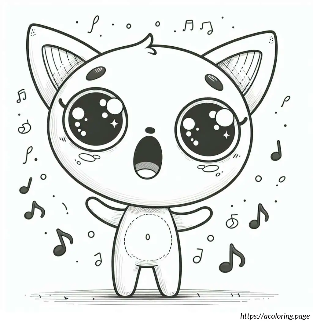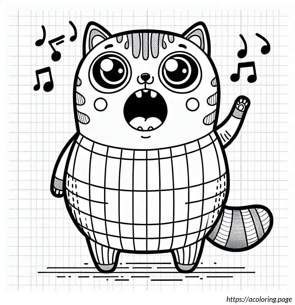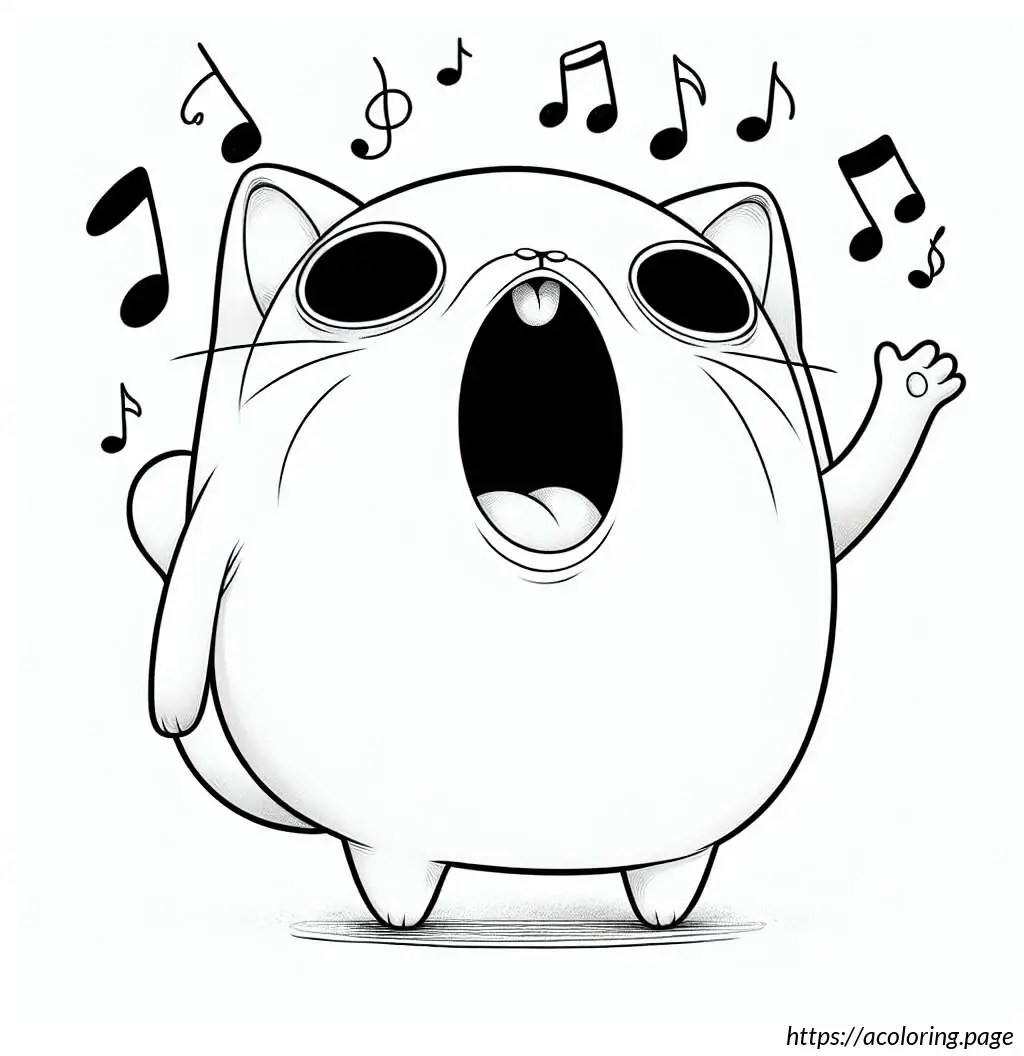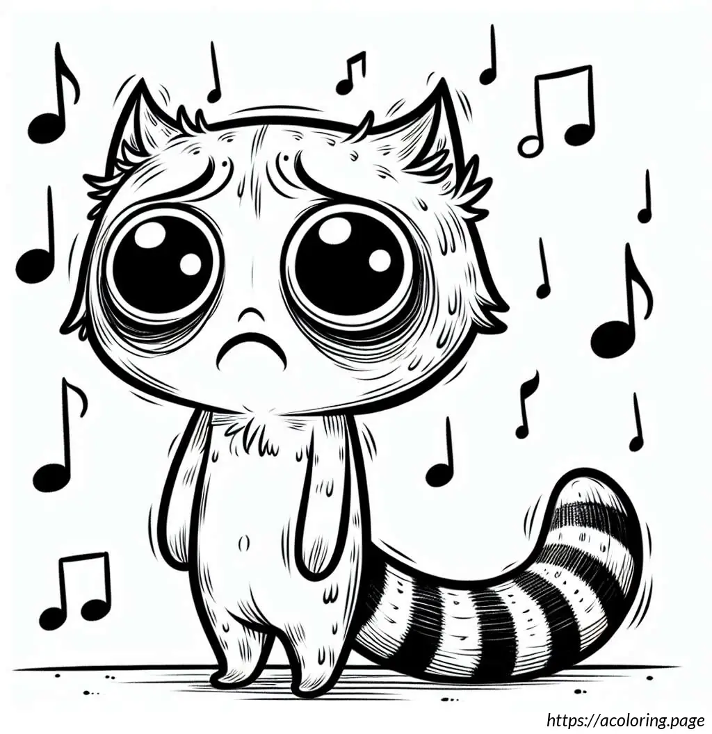 The image shows a cartoon character that is drawn in a simple, black-and-white outline style. The character appears to be singing or vocalizing, as indicated by the presence of musical notes floating above its head. It has a large, pear-shaped body with two spiky points at the top, resembling cat-like ears. Its face features large, round eyes, a prominent open mouth displaying a single row of teeth, and a small outlined nose above the mouth. The character has two arms raised, one of which is significantly stripy like a raccoon”s tail, which extends from the back. It has two small legs. The overall expression and posture suggest that the character is in a lively or enthusiastic state.