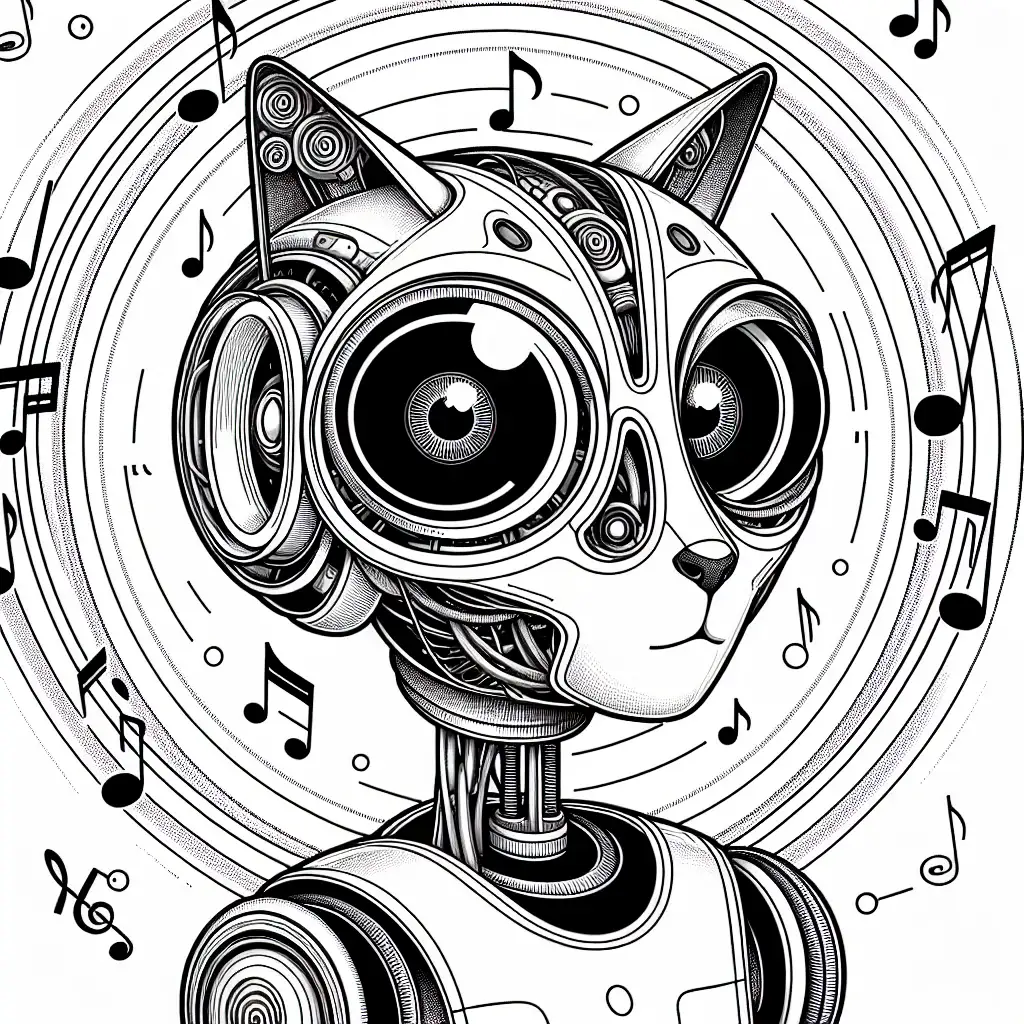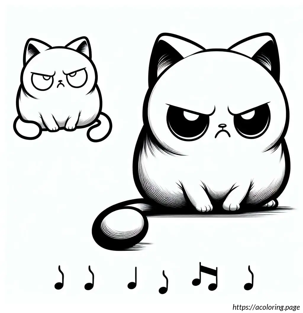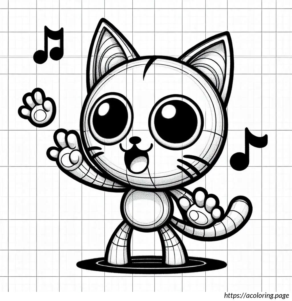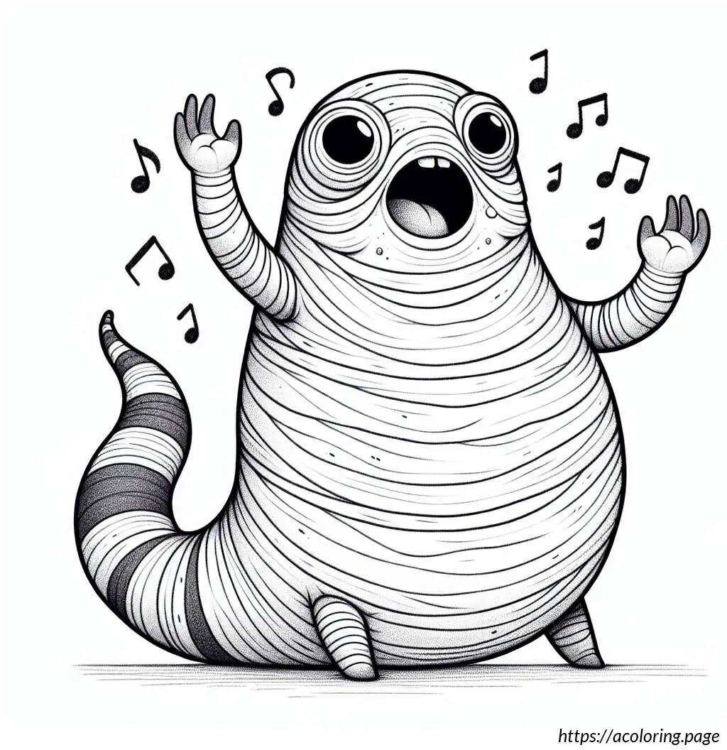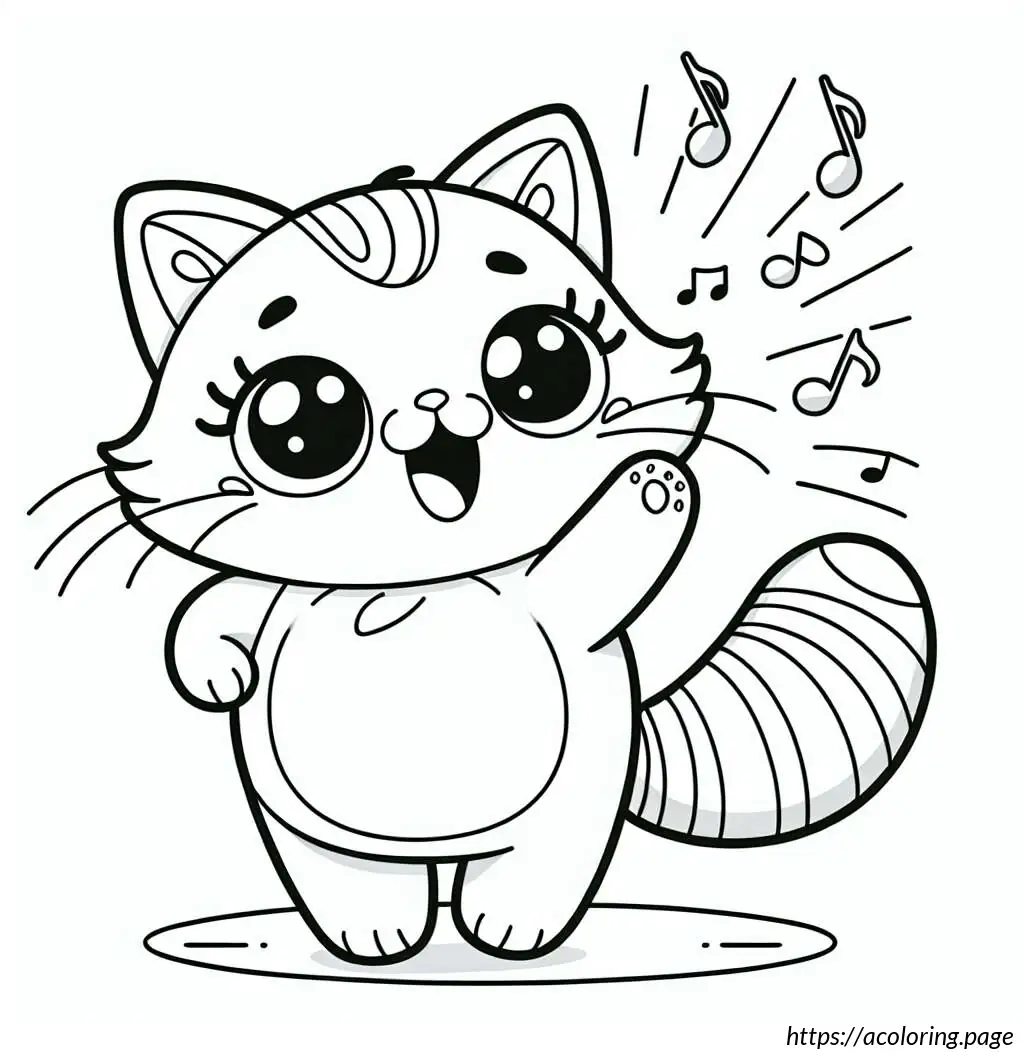 The image shows a cartoon character that is drawn in a simple, black-and-white outline style. The character appears to be singing or vocalizing, as indicated by the presence of musical notes floating above its head. It has a large, pear-shaped body with two spiky points at the top, resembling cat-like ears. Its face features large, round eyes, a prominent open mouth displaying a single row of teeth, and a small outlined nose above the mouth. The character has two arms raised, one of which is significantly stripy like a raccoon”s tail, which extends from the back. It has two small legs. The overall expression and posture suggest that the character is in a lively or enthusiastic state.