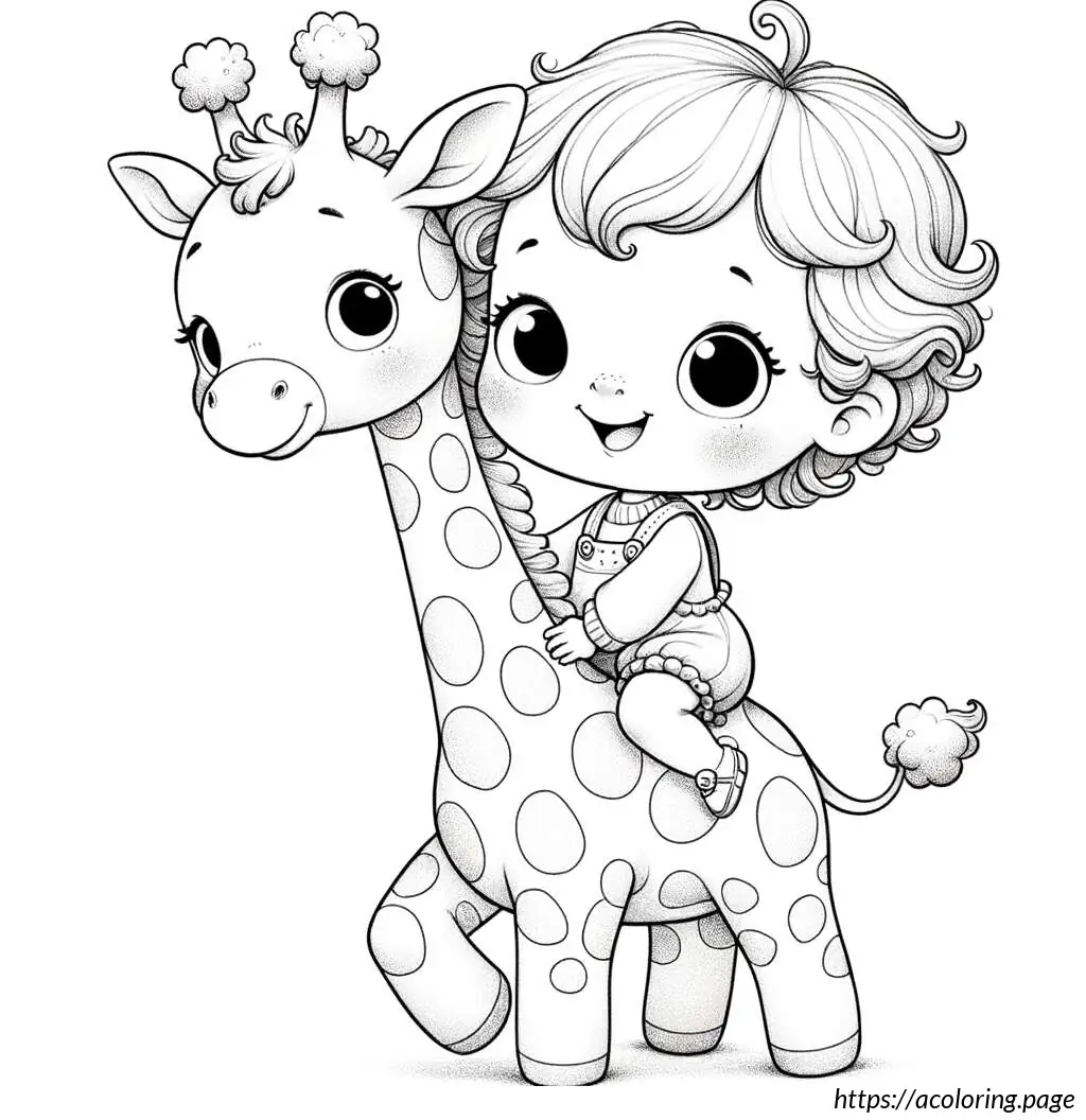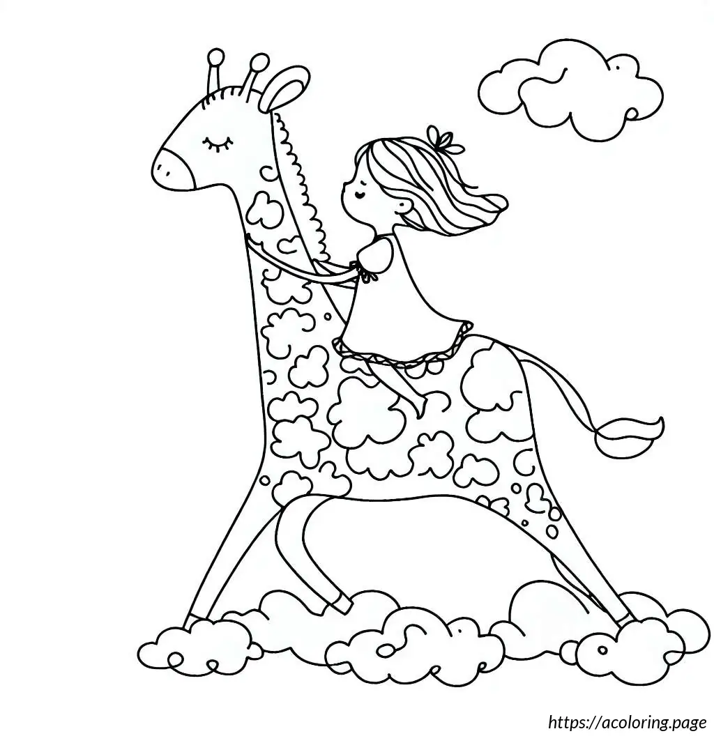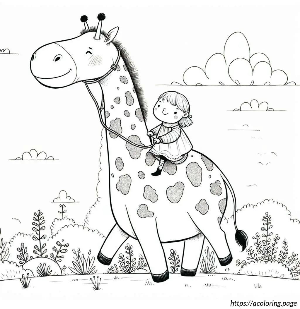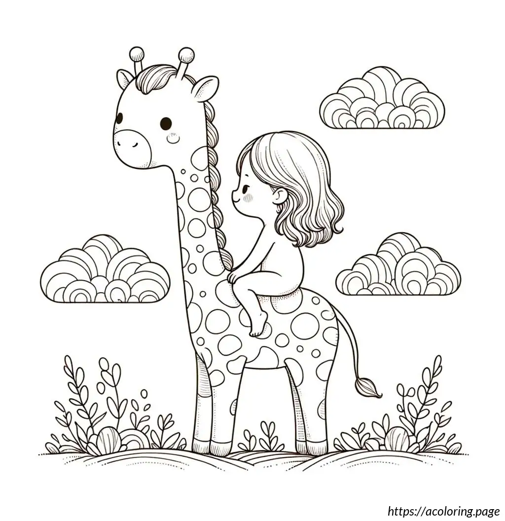 This image is a cartoon-style black and white line drawing of a young child riding a giraffe. The child has curly hair and appears joyful, wearing a two-piece outfit and holding onto the giraffeās neck for support. The giraffe has a friendly expression, marked by a smiling mouth and large, gentle eyes. It features typical giraffe characteristics like long neck and legs, and its body is adorned with cloud-like patches. The overall feel of the image is playful and whimsical, suitable for childrenās book illustrations or educational materials.