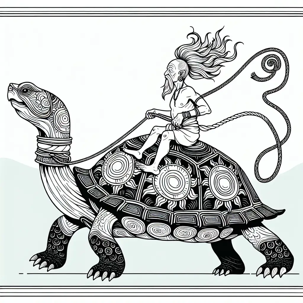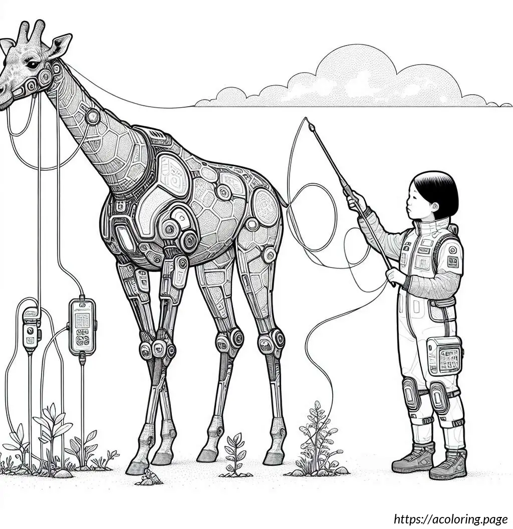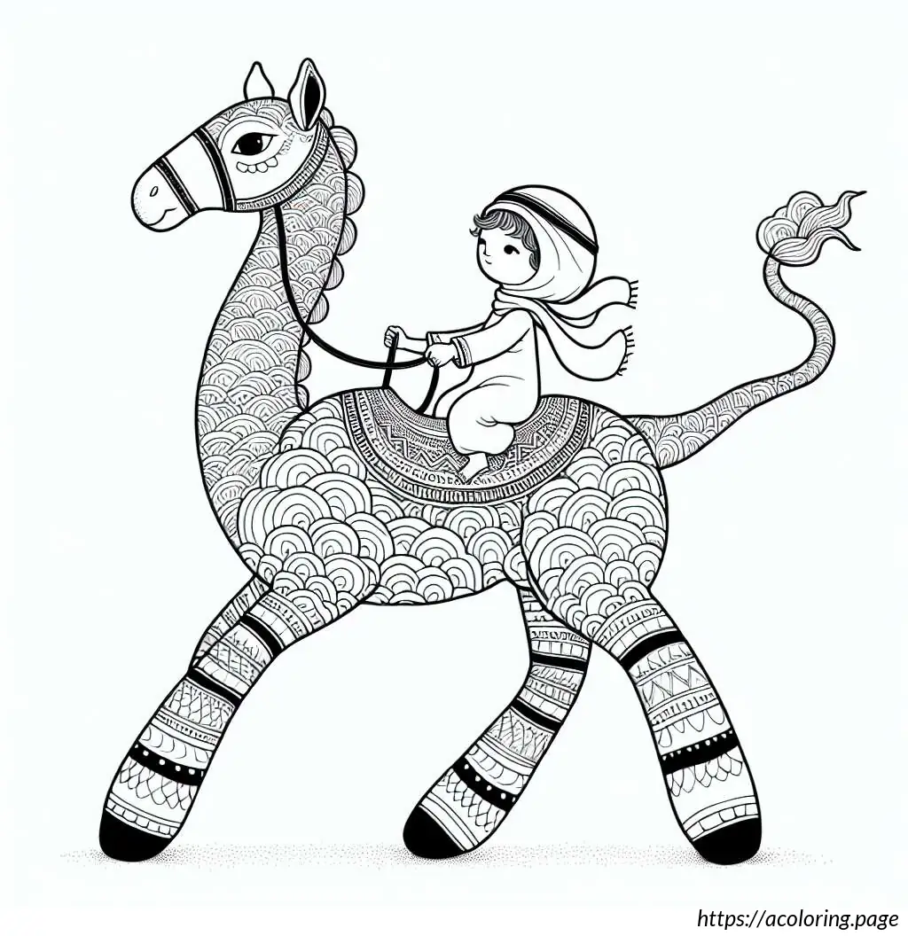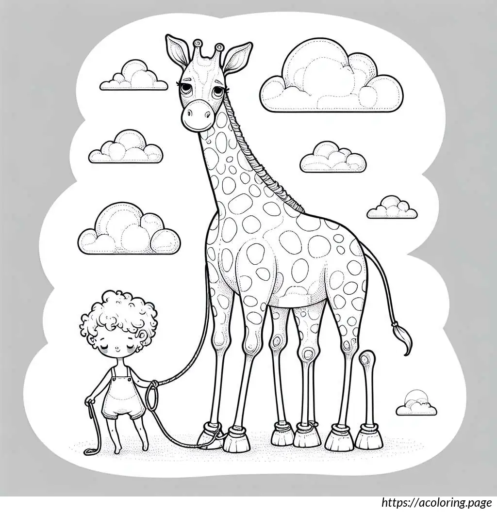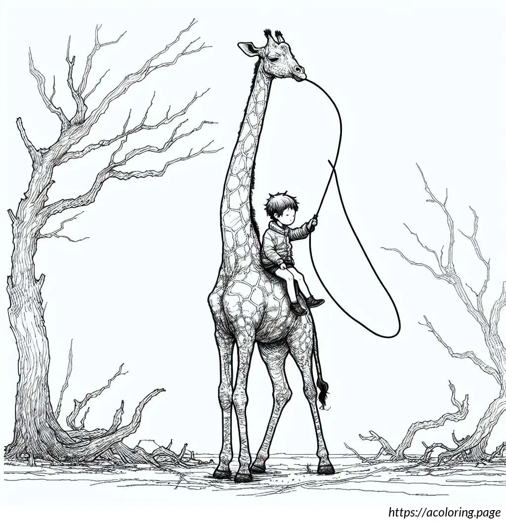 This image is a cartoon-style black and white line drawing of a young child riding a giraffe. The child has curly hair and appears joyful, wearing a two-piece outfit and holding onto the giraffeās neck for support. The giraffe has a friendly expression, marked by a smiling mouth and large, gentle eyes. It features typical giraffe characteristics like long neck and legs, and its body is adorned with cloud-like patches. The overall feel of the image is playful and whimsical, suitable for childrenās book illustrations or educational materials.