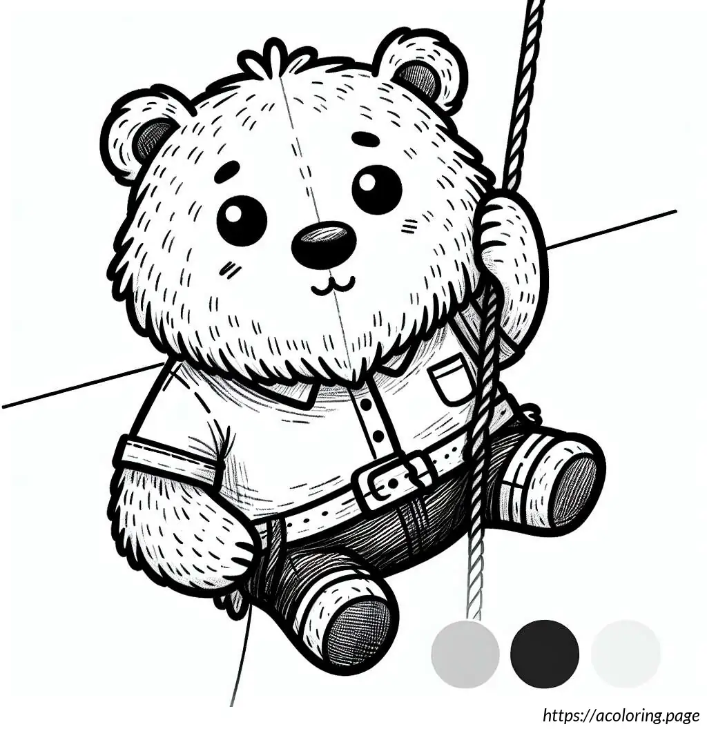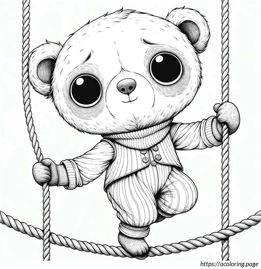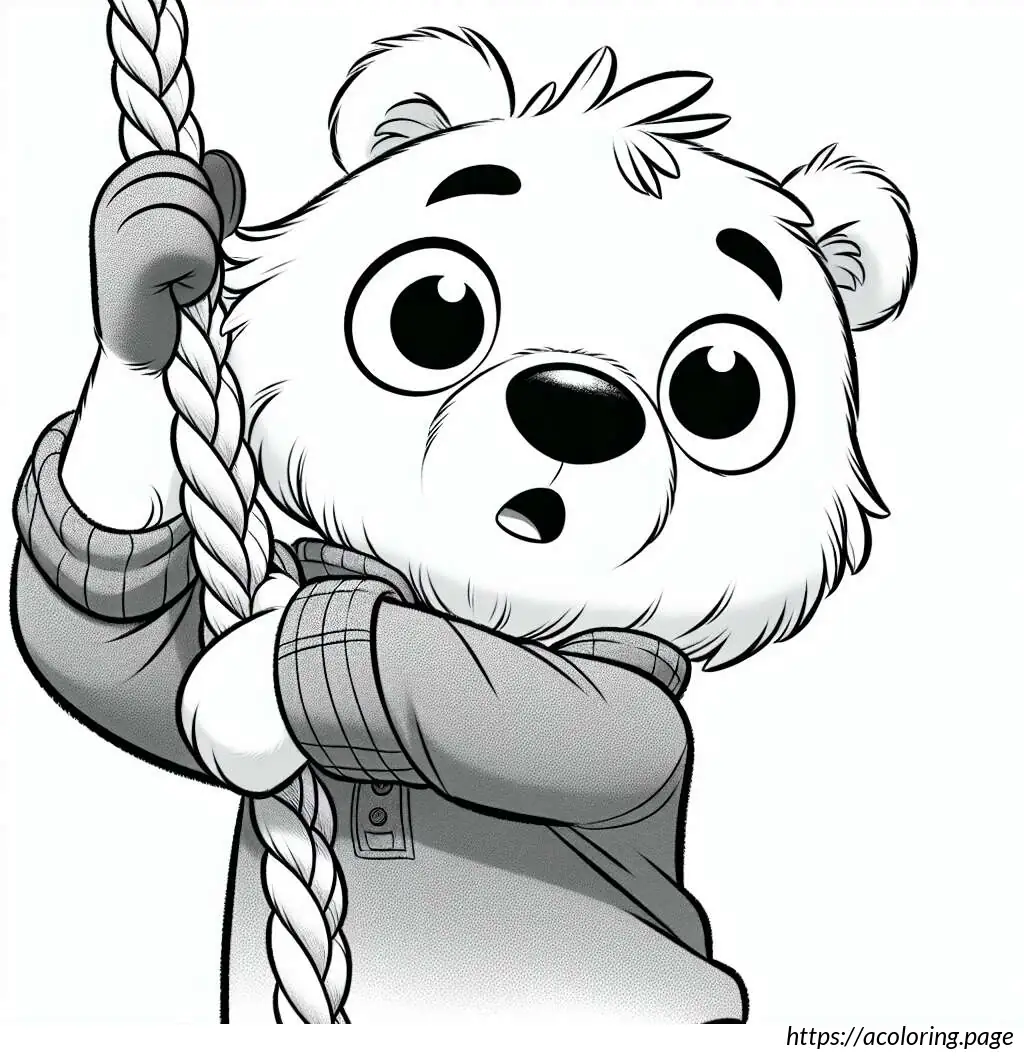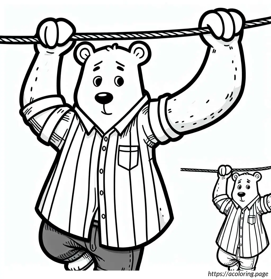 This is a black and white line drawing of a cartoon bear. The bear appears to be hanging on to a rope with one paw while looking directly forward with a surprised expression. The bear features large eyes, a prominent black nose, and a small mouth. It is wearing a long-sleeved shirt, and you can see stitching details on the cuffs of its sleeves. The bear”s fur is depicted with a textured edge to enhance the fuzzy appearance. The background is plain, with no additional details or colors.