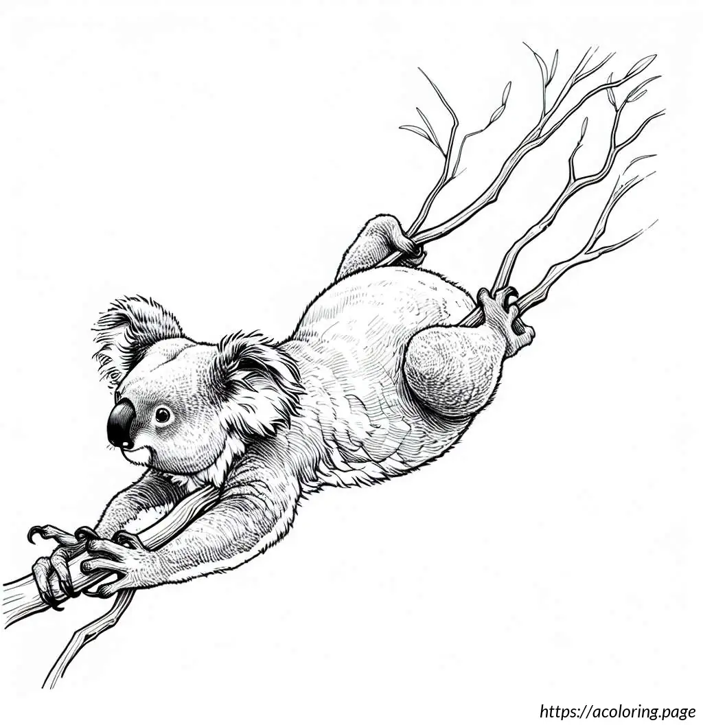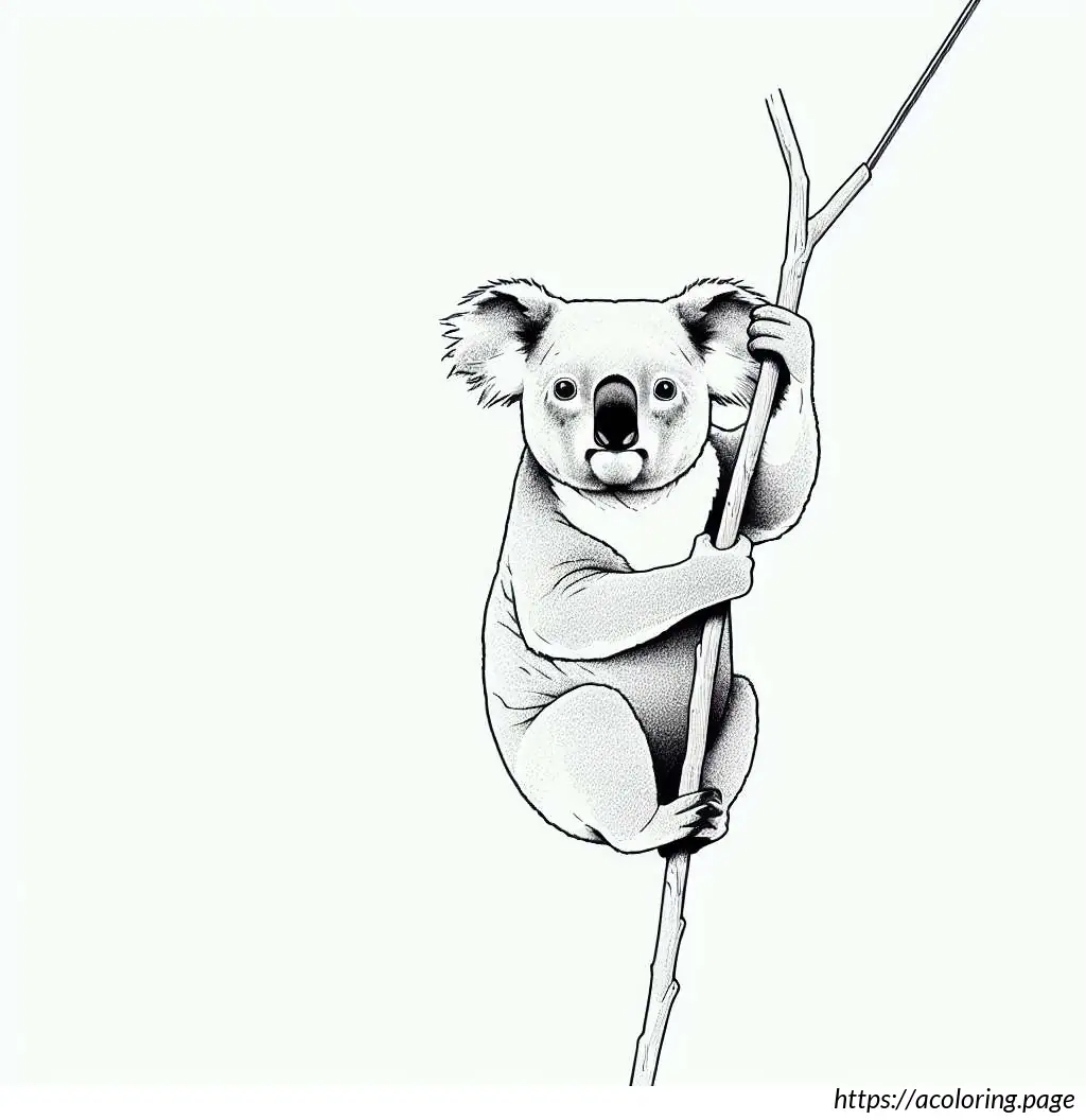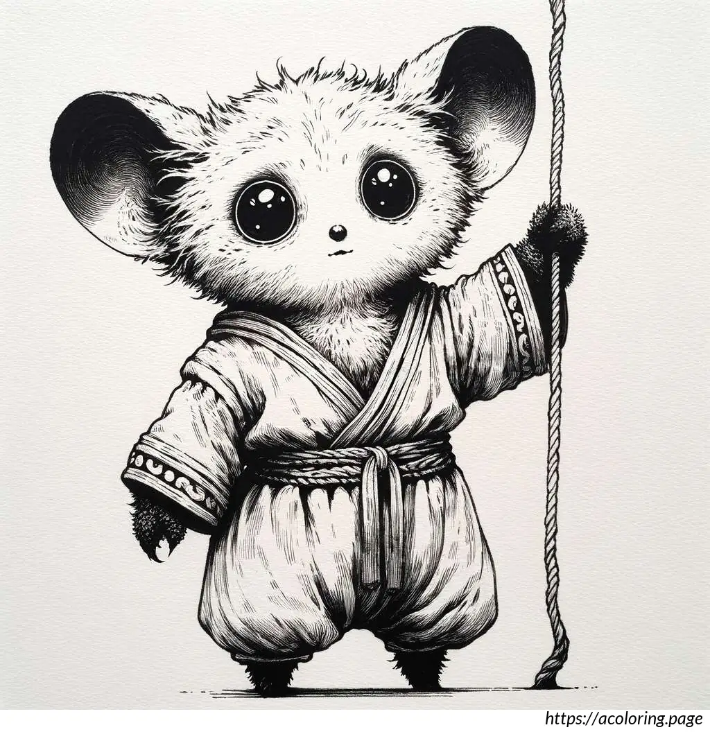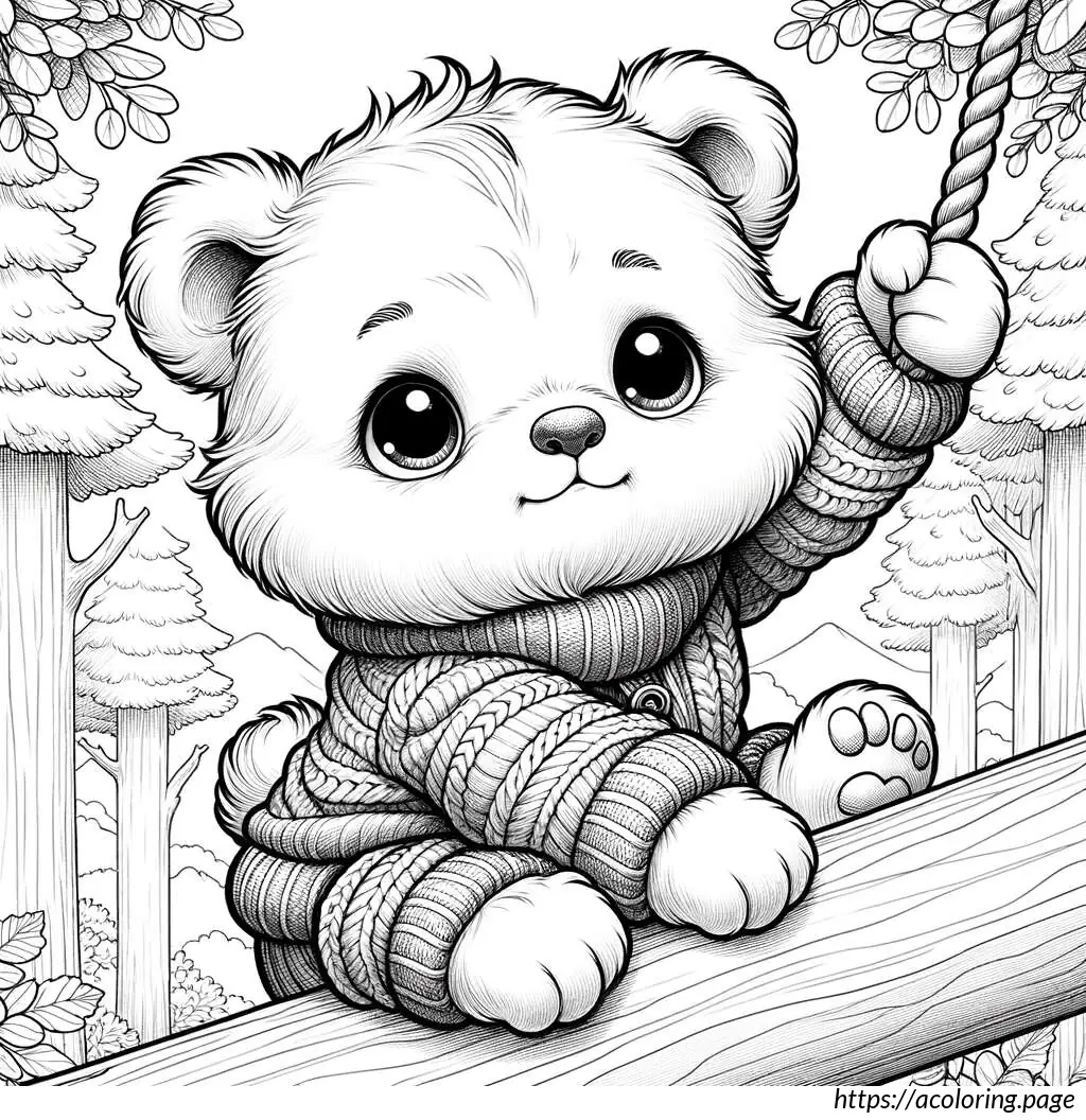 This is a black and white line drawing of a cartoon bear. The bear appears to be hanging on to a rope with one paw while looking directly forward with a surprised expression. The bear features large eyes, a prominent black nose, and a small mouth. It is wearing a long-sleeved shirt, and you can see stitching details on the cuffs of its sleeves. The bear”s fur is depicted with a textured edge to enhance the fuzzy appearance. The background is plain, with no additional details or colors.