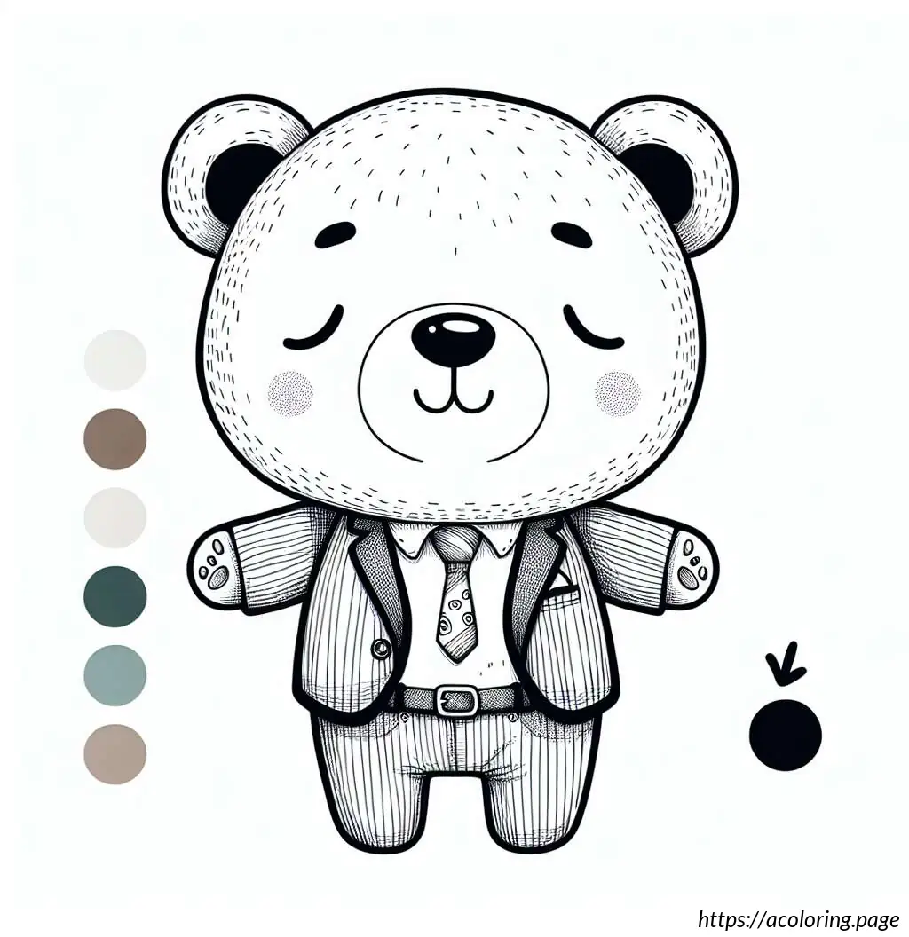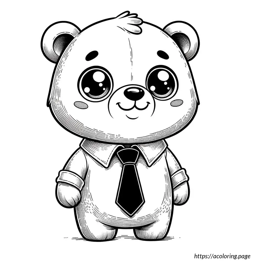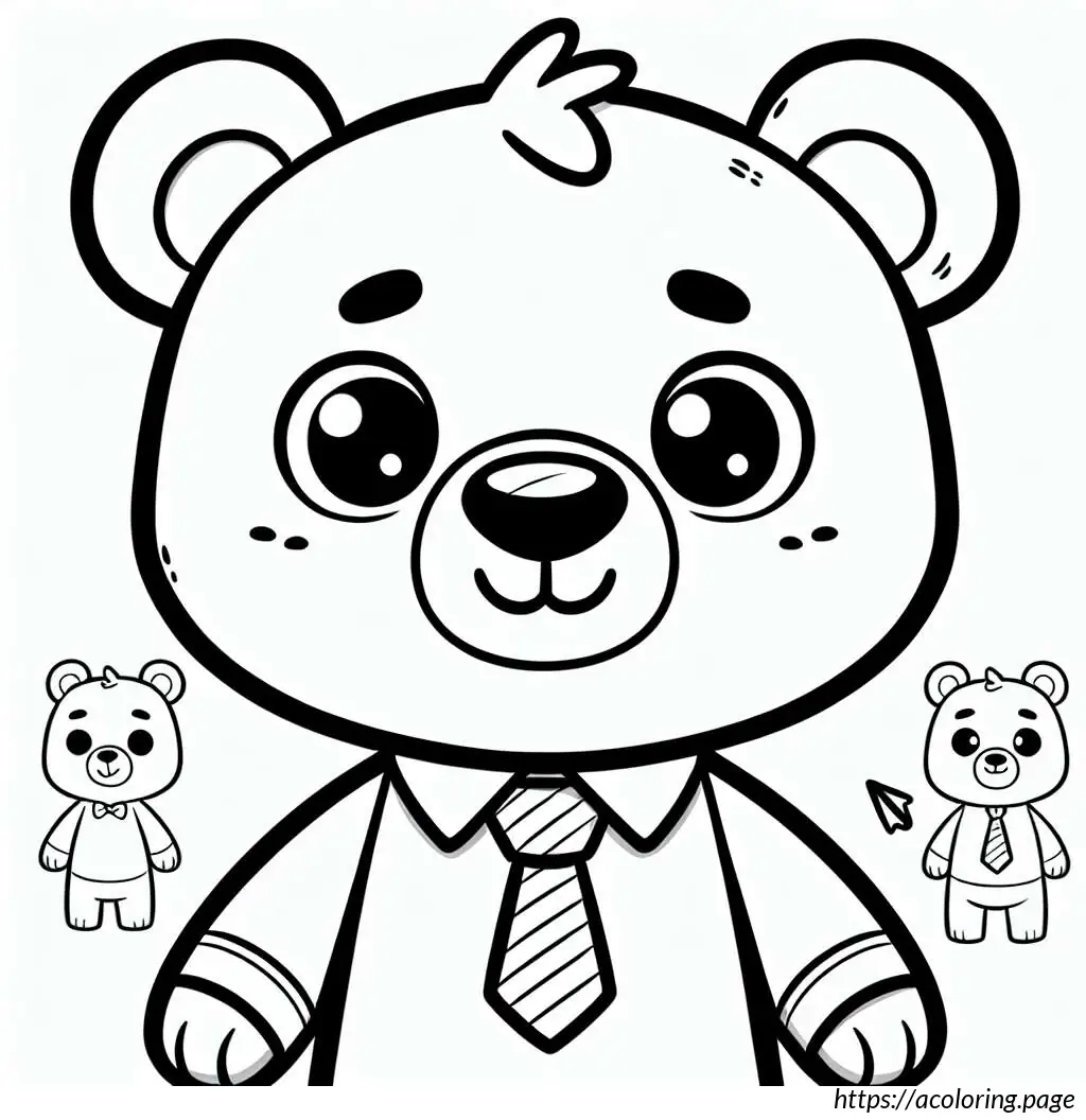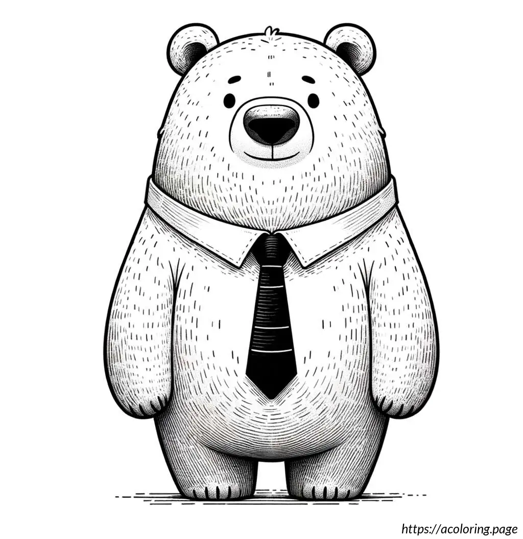 The image features a cartoon drawing of a bear standing upright with a friendly smiling face. The bear appears quite simple yet charming with oversized features typical of cartoon characters. Its face includes large closed, happy eyes and a round snout with a single nostril. The ears are small and rounded, positioned near the top of its head.The bear is wearing a necktie, suggesting a formal or business-like attire, adding a humorous touch to the character. It has its arms stretched out slightly to the sides, enhancing its approachable and cheerful appearance. The hands and feet of the bear are simplified, without distinct fingers or toes, keeping in line with the overall minimalist and playful style.The drawing is entirely in black and white, implying it might be suitable for coloring activities. The outlines are bold and clear, making it easy to distinguish the different parts and features of the cartoon bear.