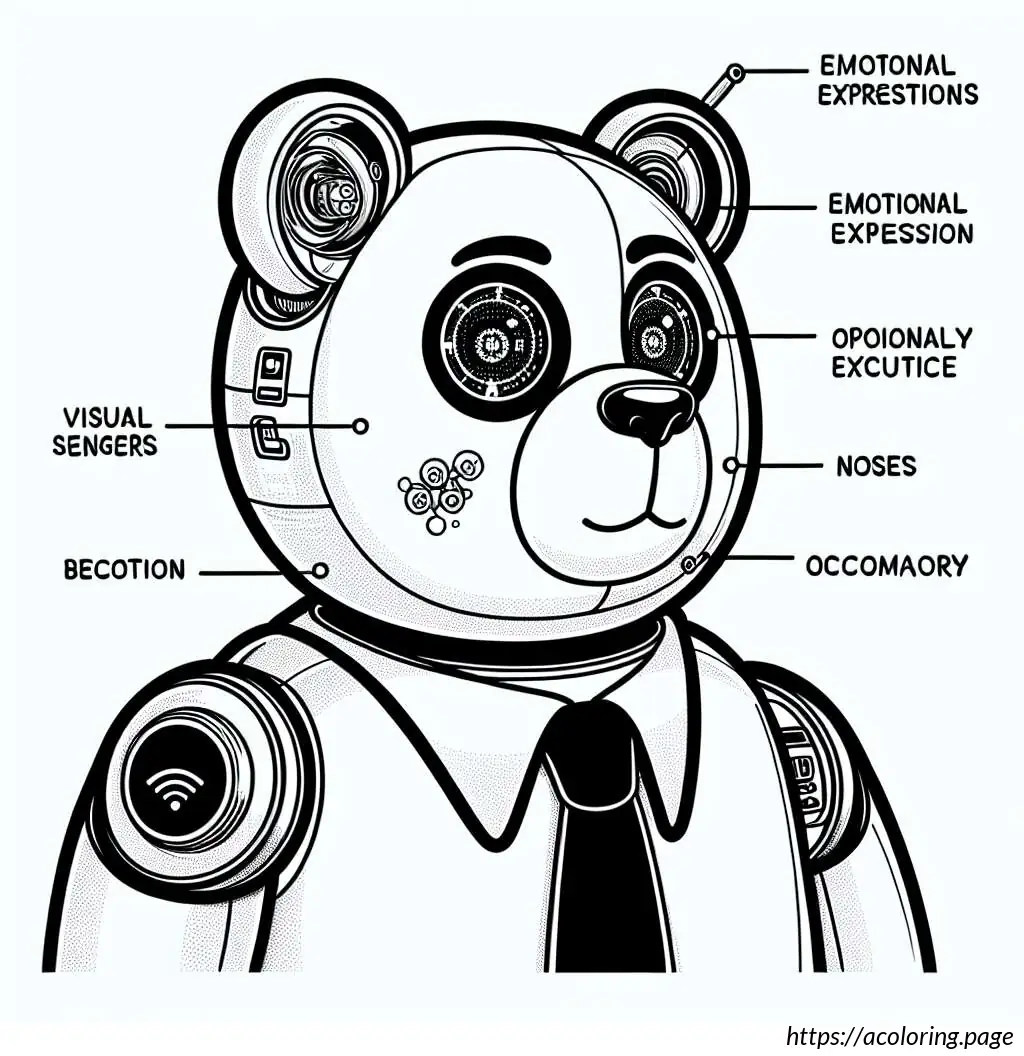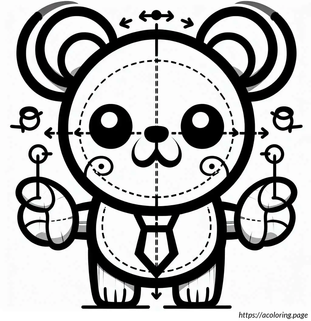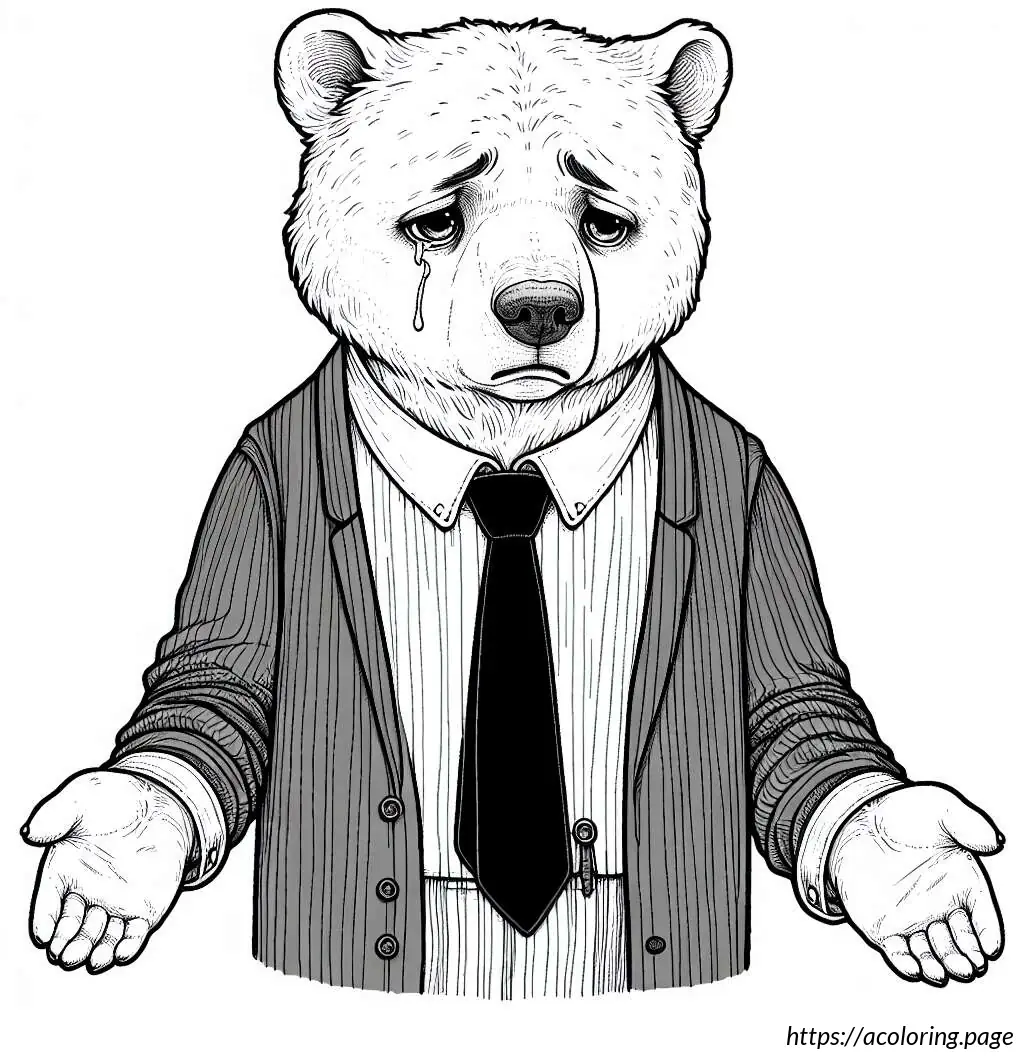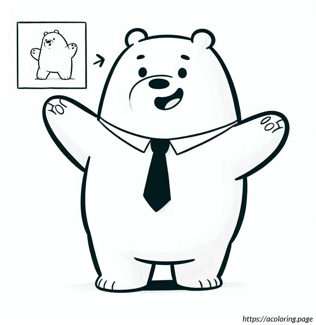 The image features a cartoon drawing of a bear standing upright with a friendly smiling face. The bear appears quite simple yet charming with oversized features typical of cartoon characters. Its face includes large closed, happy eyes and a round snout with a single nostril. The ears are small and rounded, positioned near the top of its head.The bear is wearing a necktie, suggesting a formal or business-like attire, adding a humorous touch to the character. It has its arms stretched out slightly to the sides, enhancing its approachable and cheerful appearance. The hands and feet of the bear are simplified, without distinct fingers or toes, keeping in line with the overall minimalist and playful style.The drawing is entirely in black and white, implying it might be suitable for coloring activities. The outlines are bold and clear, making it easy to distinguish the different parts and features of the cartoon bear.