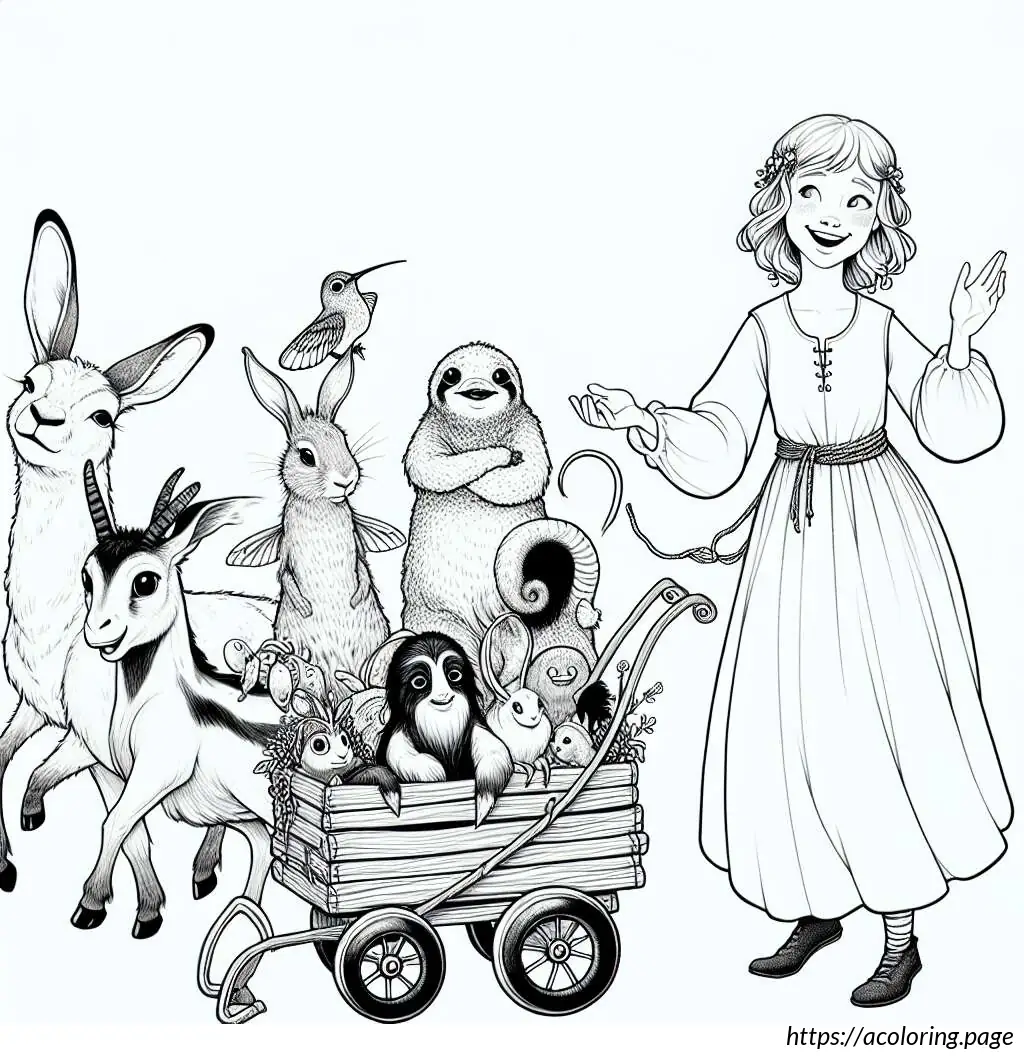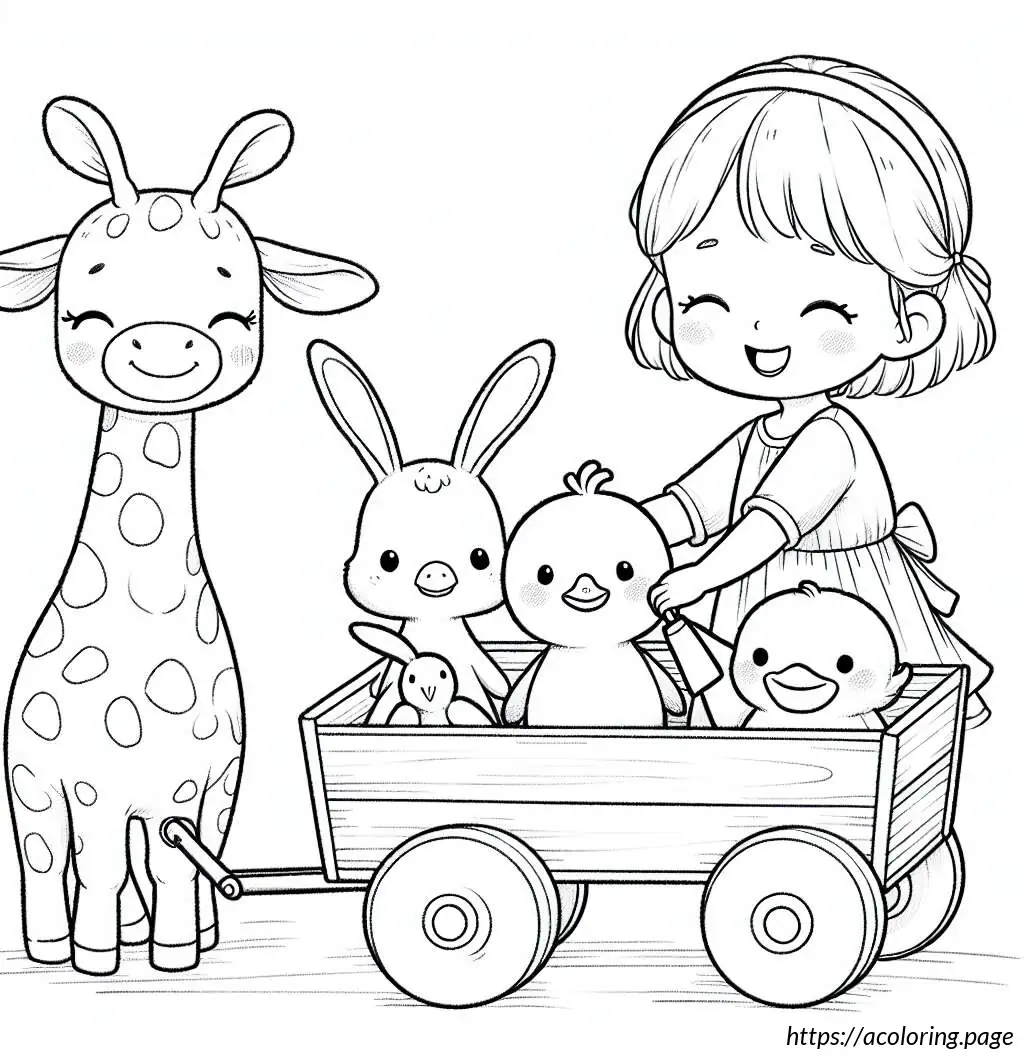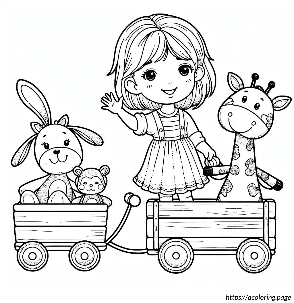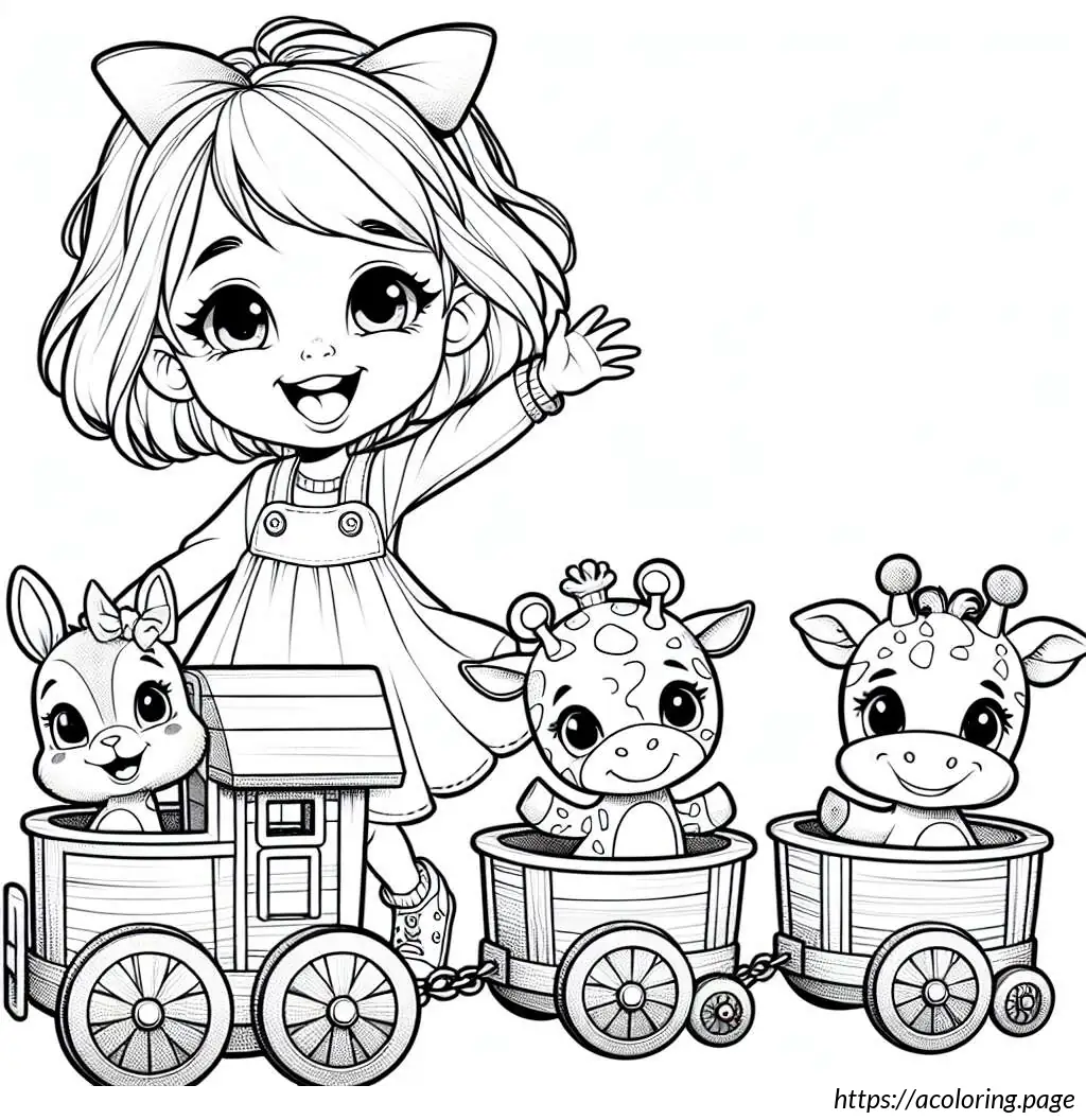 This image is a black and white line drawing. It depicts a young, smiling girl pulling a train of three small carts. Each cart contains a different anthropomorphic animal character. From left to right, the animals are a bunny with upright ears and a small crown, a giraffe with spots and small horns, and a cow with horns and a calm expression. The girl appears joyful, waving with one hand while pulling the carts with the other. All characters are stylized in a simple, cartoonish manner, which gives the artwork a playful and child-friendly appearance.