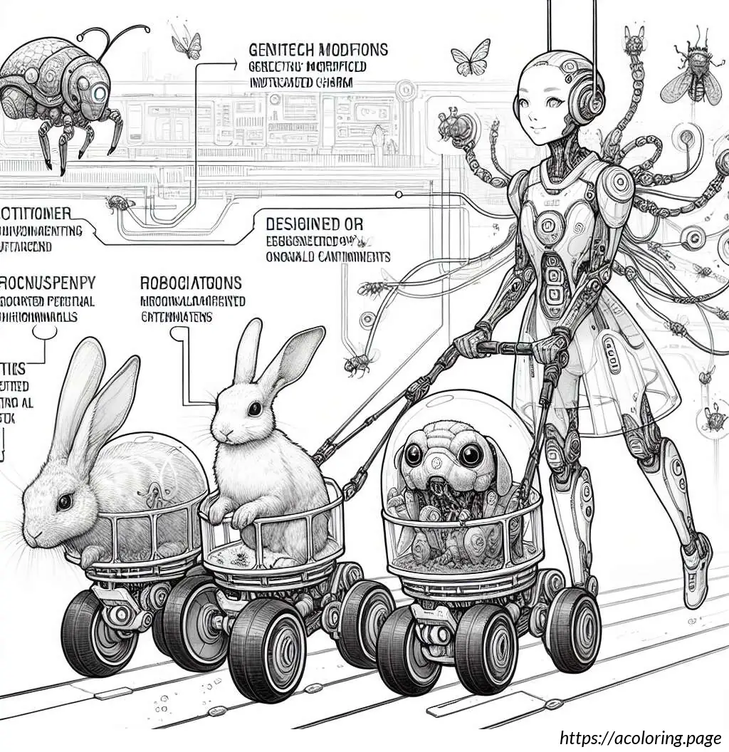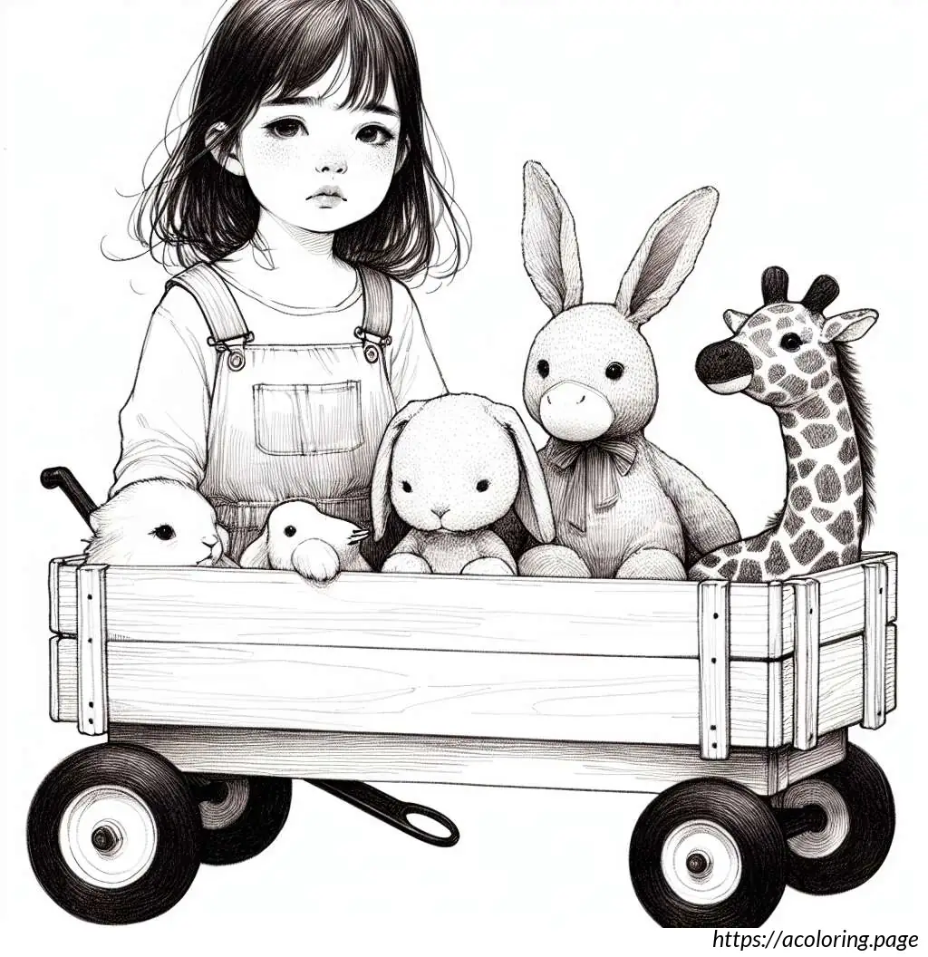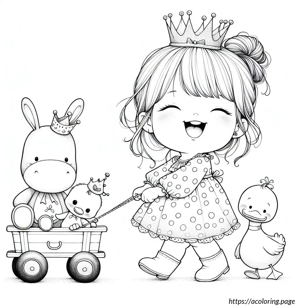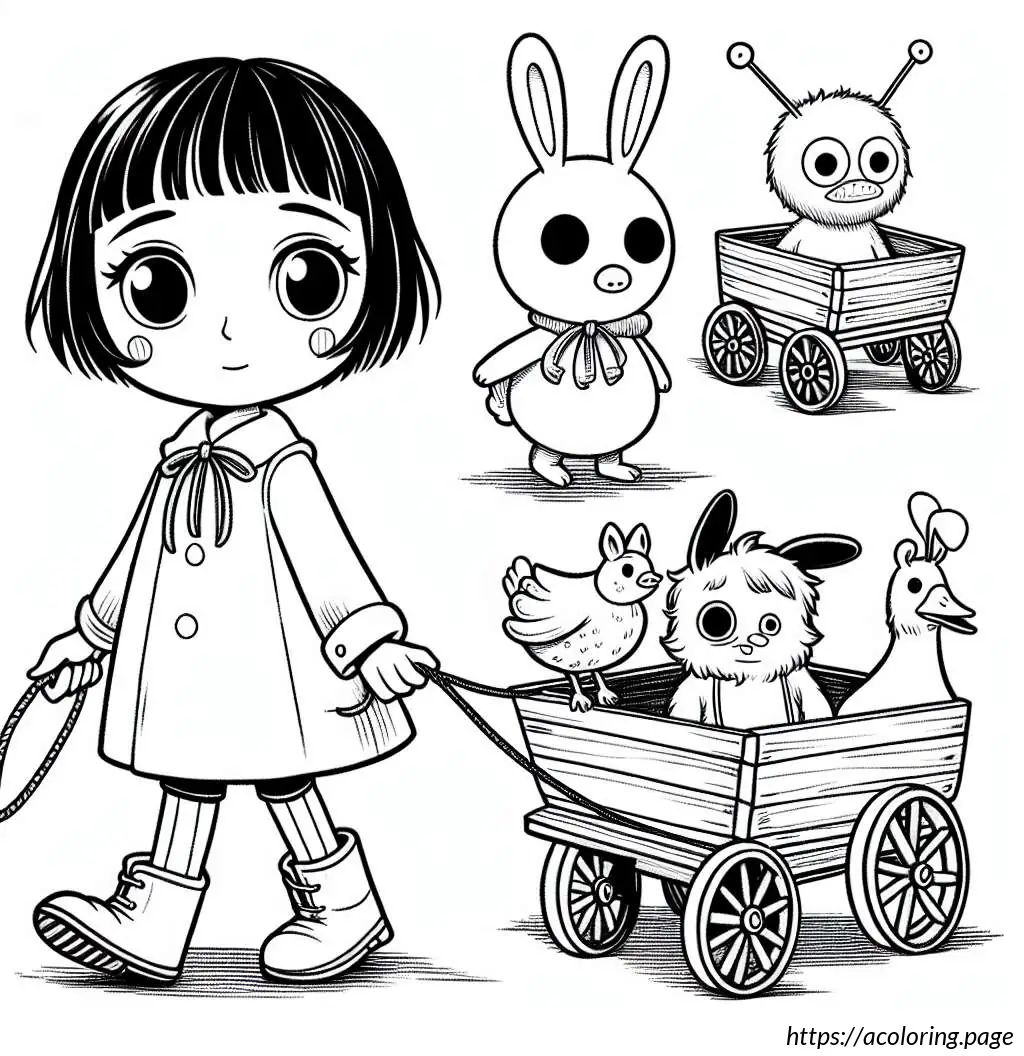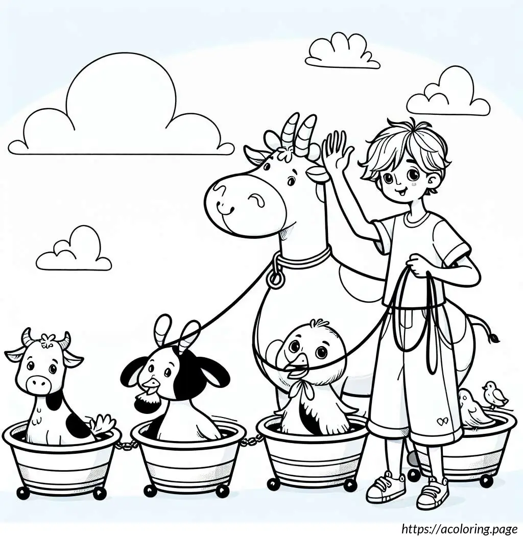 This image is a black and white line drawing. It depicts a young, smiling girl pulling a train of three small carts. Each cart contains a different anthropomorphic animal character. From left to right, the animals are a bunny with upright ears and a small crown, a giraffe with spots and small horns, and a cow with horns and a calm expression. The girl appears joyful, waving with one hand while pulling the carts with the other. All characters are stylized in a simple, cartoonish manner, which gives the artwork a playful and child-friendly appearance.