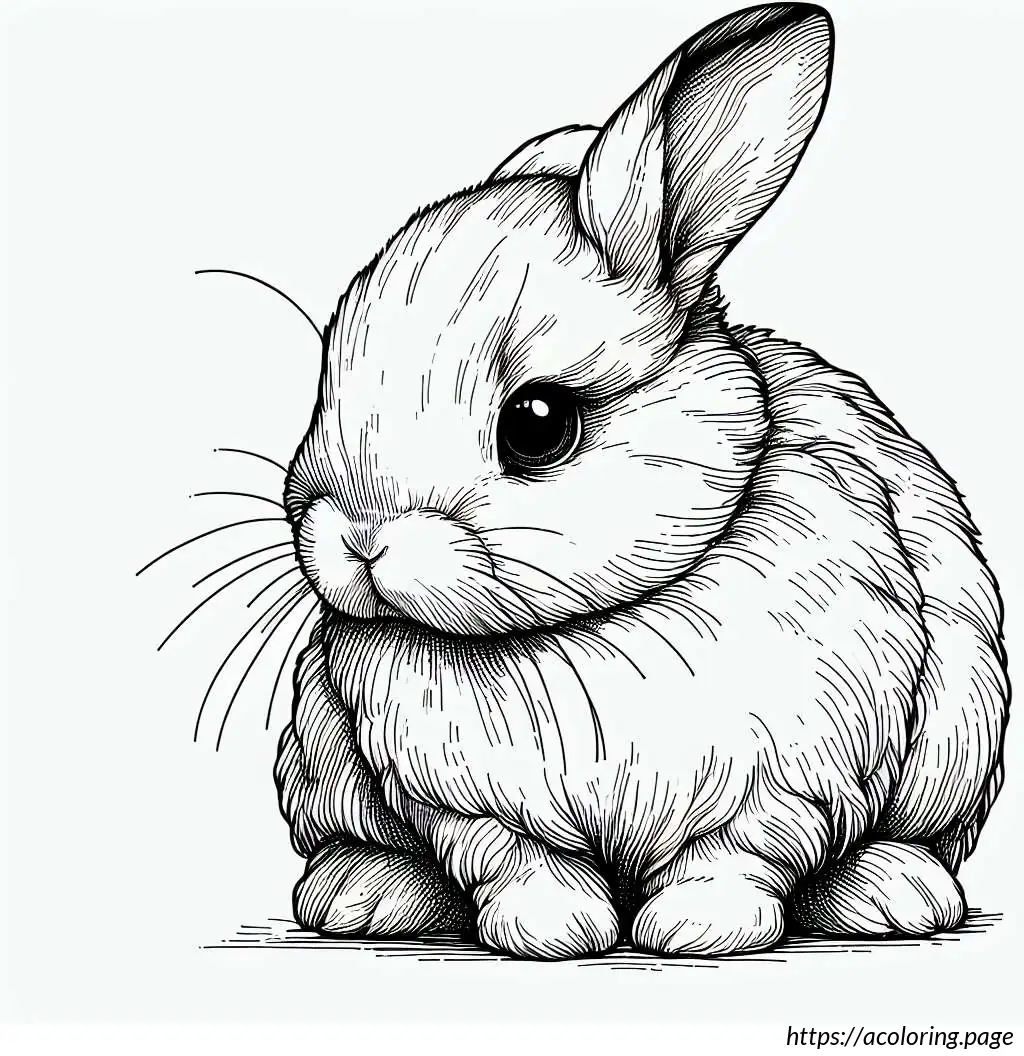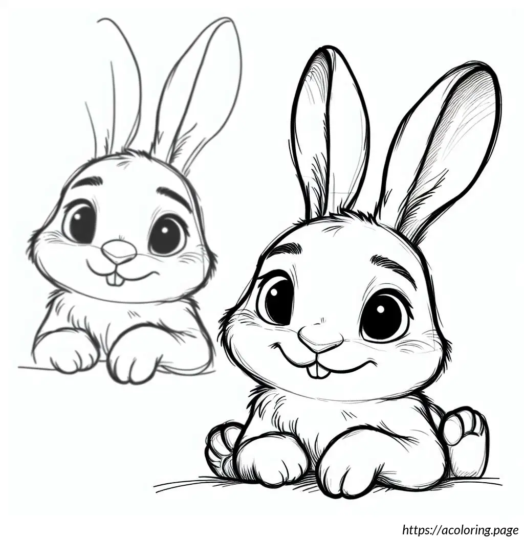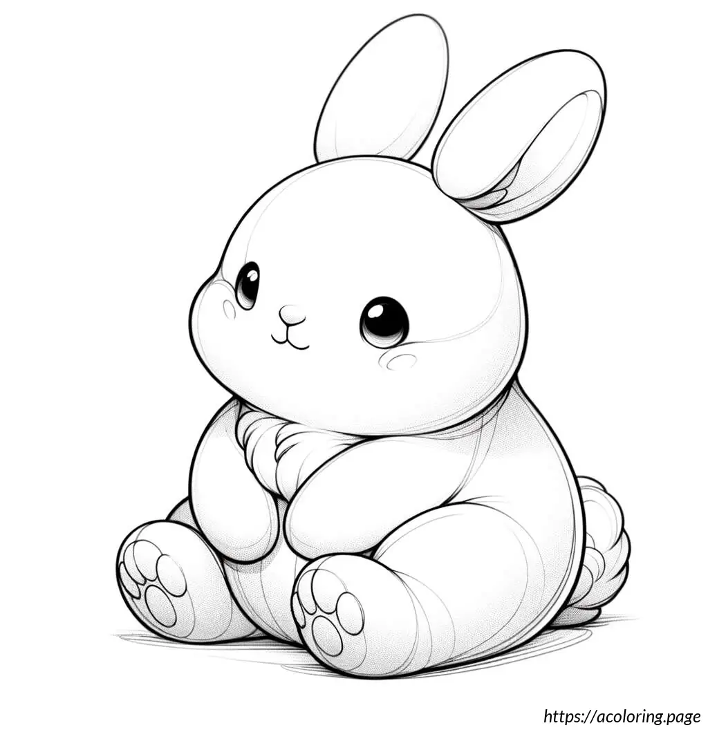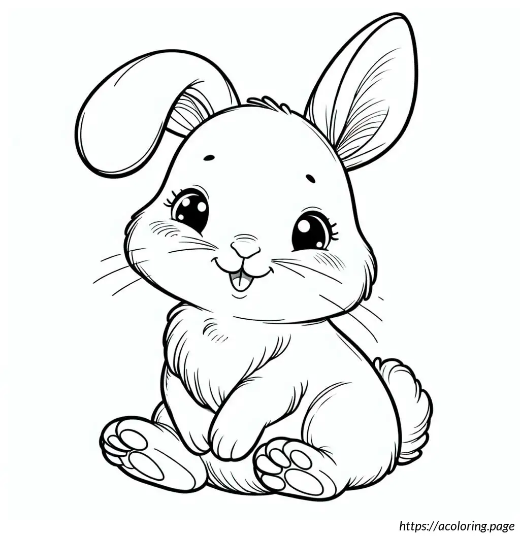 This image features a cartoon-style drawing of a rabbit. The rabbit is depicted in a sitting position, facing slightly towards the right side of the image. It has expressive eyes, a prominent nose, and a jovial smile that brings a friendly demeanor to its appearance. The rabbit”s fur is illustrated with gentle lines suggesting a soft texture. Its ears are large and droop down with the visible inner lining, characteristic of a typical rabbit”s ears. The drawing style is simplistic and lacks color, making it suitable for coloring activities. The outlines are bold and clear, which helps in distinguishing different body parts such as the paws and the fluffy tail.