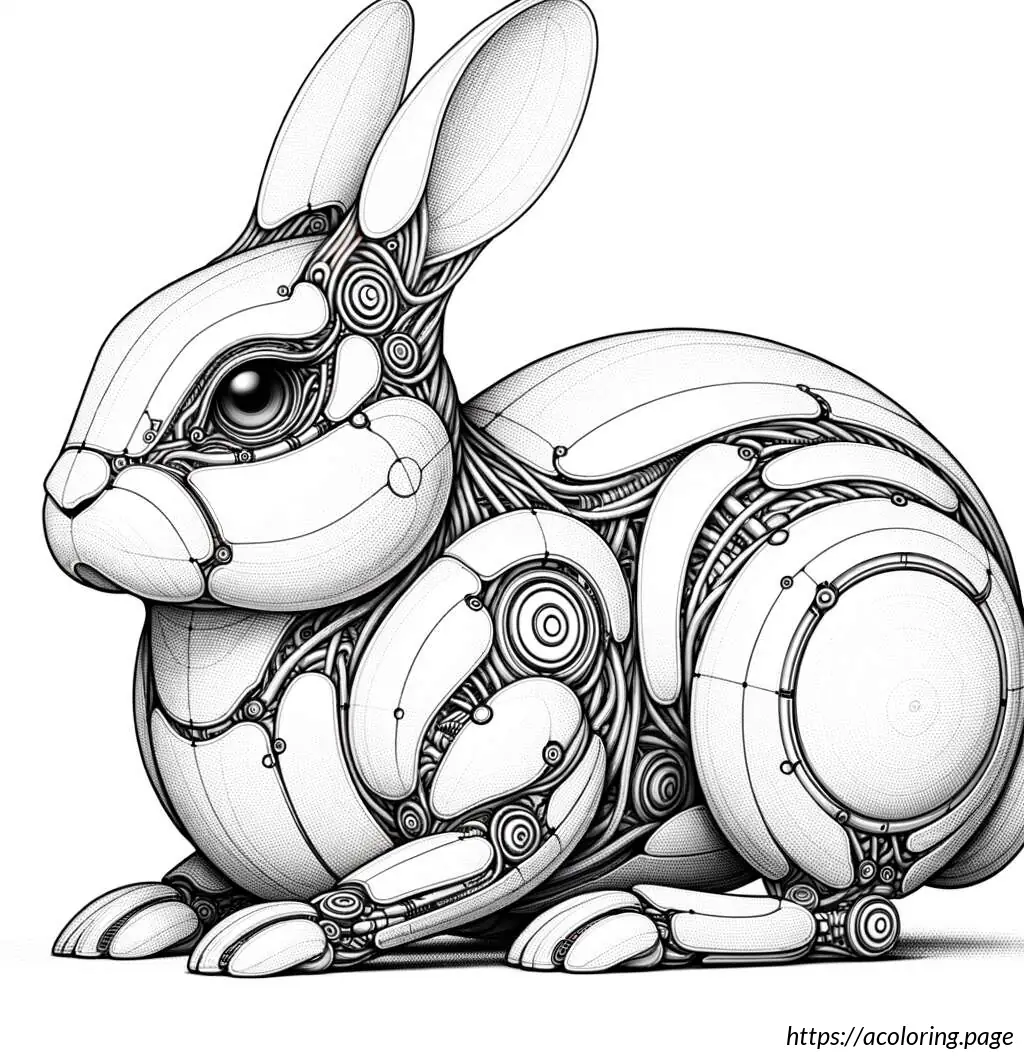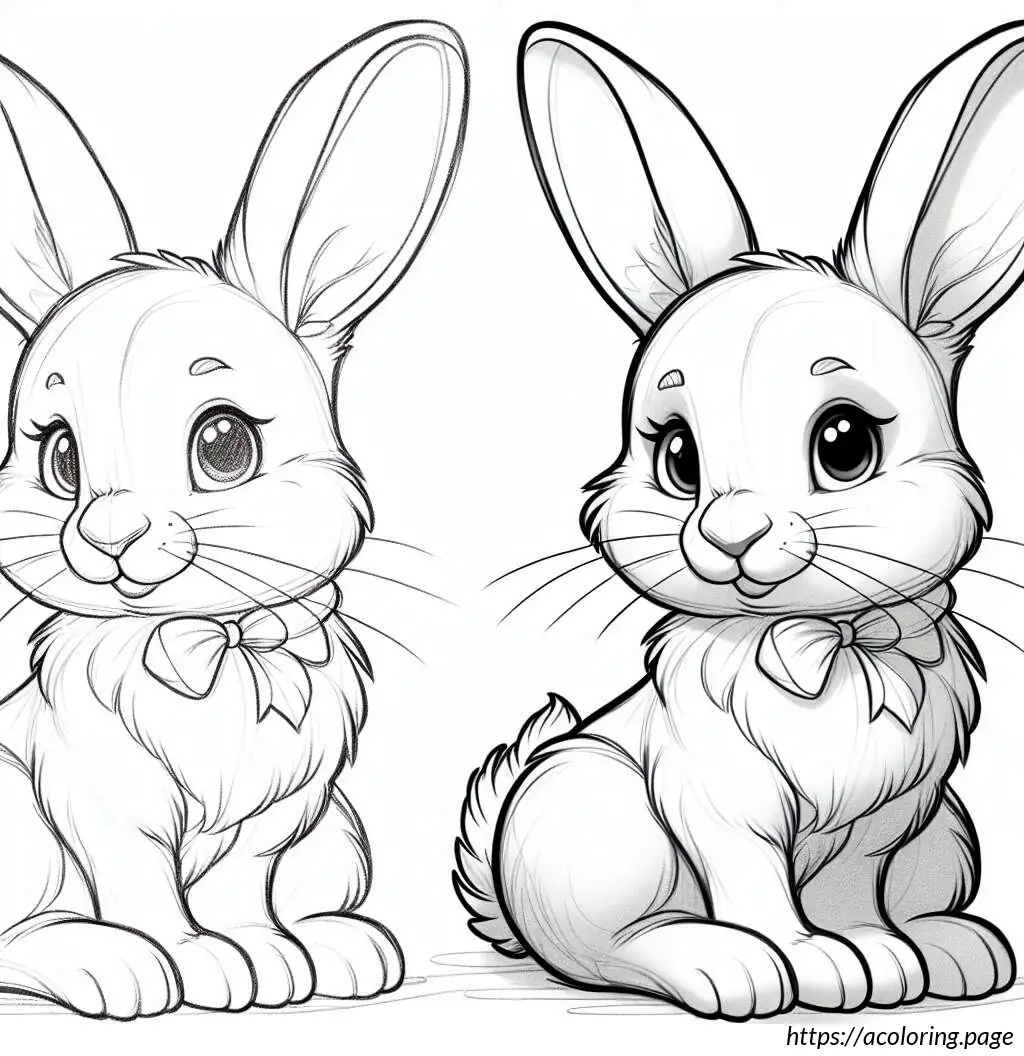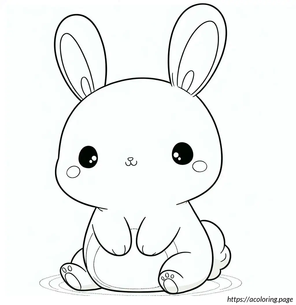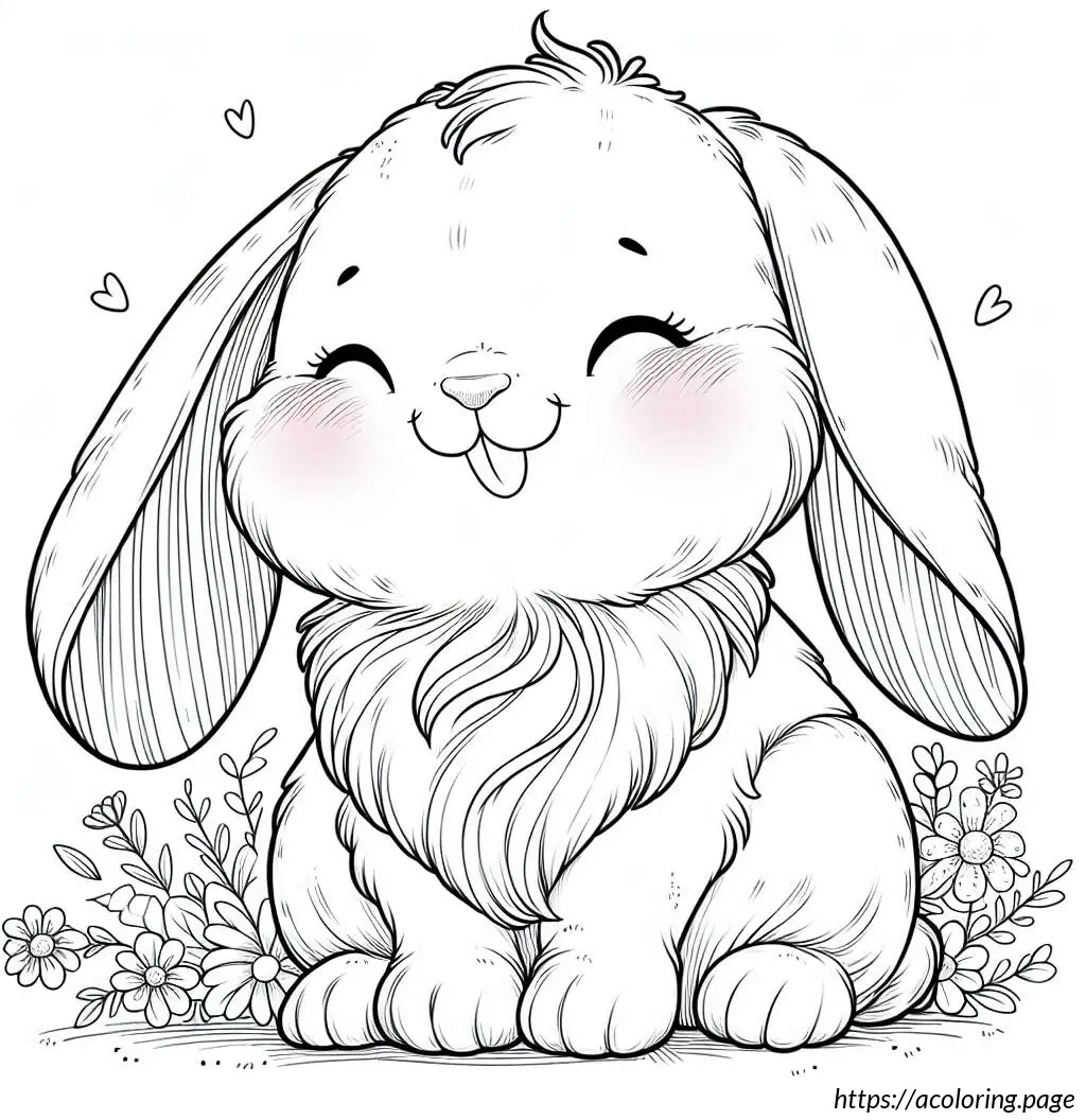 This image features a cartoon-style drawing of a rabbit. The rabbit is depicted in a sitting position, facing slightly towards the right side of the image. It has expressive eyes, a prominent nose, and a jovial smile that brings a friendly demeanor to its appearance. The rabbit”s fur is illustrated with gentle lines suggesting a soft texture. Its ears are large and droop down with the visible inner lining, characteristic of a typical rabbit”s ears. The drawing style is simplistic and lacks color, making it suitable for coloring activities. The outlines are bold and clear, which helps in distinguishing different body parts such as the paws and the fluffy tail.
