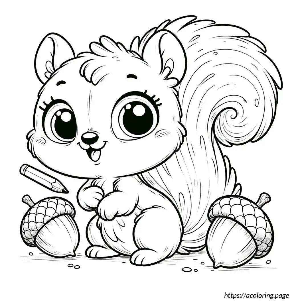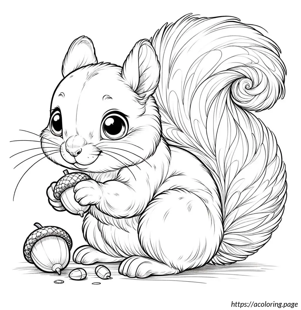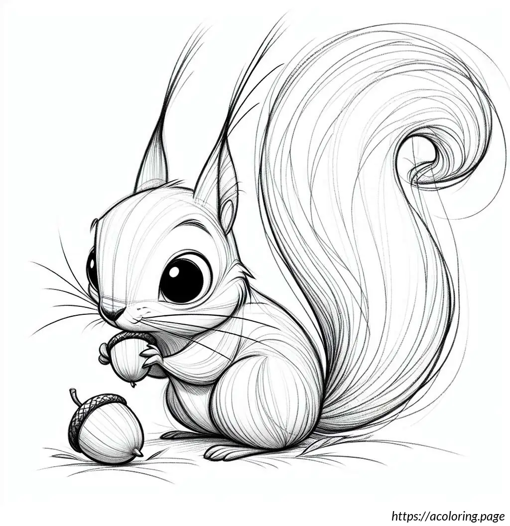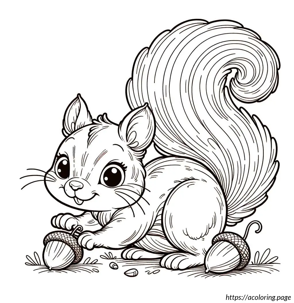 This image is a line drawing of a cute, cartoon-style squirrel. The squirrel is shown in a playful pose with its head turned towards the ground as it interacts with two acorns in front of it. One acorn is under its chin, and it appears to be nibbling or sniffing it, while the other is just a bit farther away. Its large, bushy tail curls gracefully up and around, adding a dynamic flourish to the image. The features of the squirrel are simplified and stylized, with large, expressive eyes that enhance the cartoonish and friendly character of the drawing. This drawing could be used for various purposes like a children”s book illustration, educational material, or a simple, joyful decoration.
