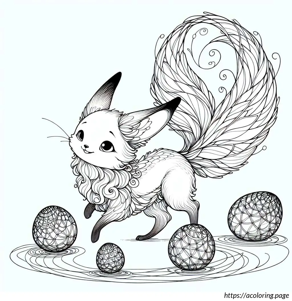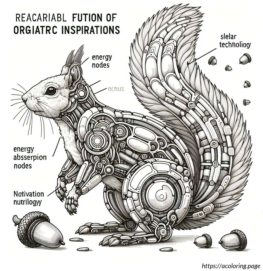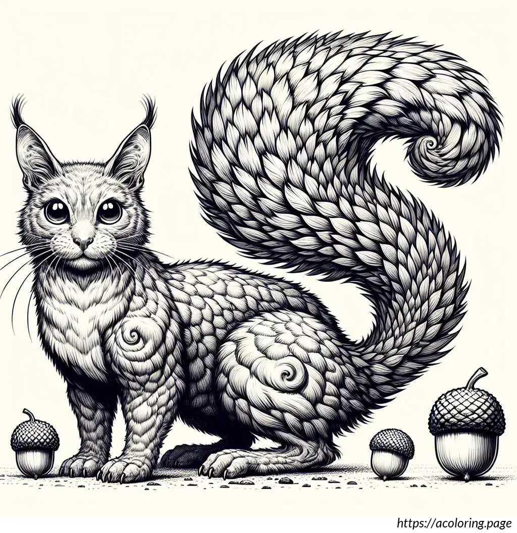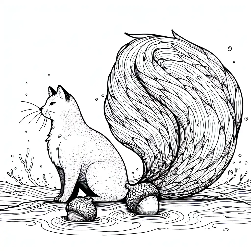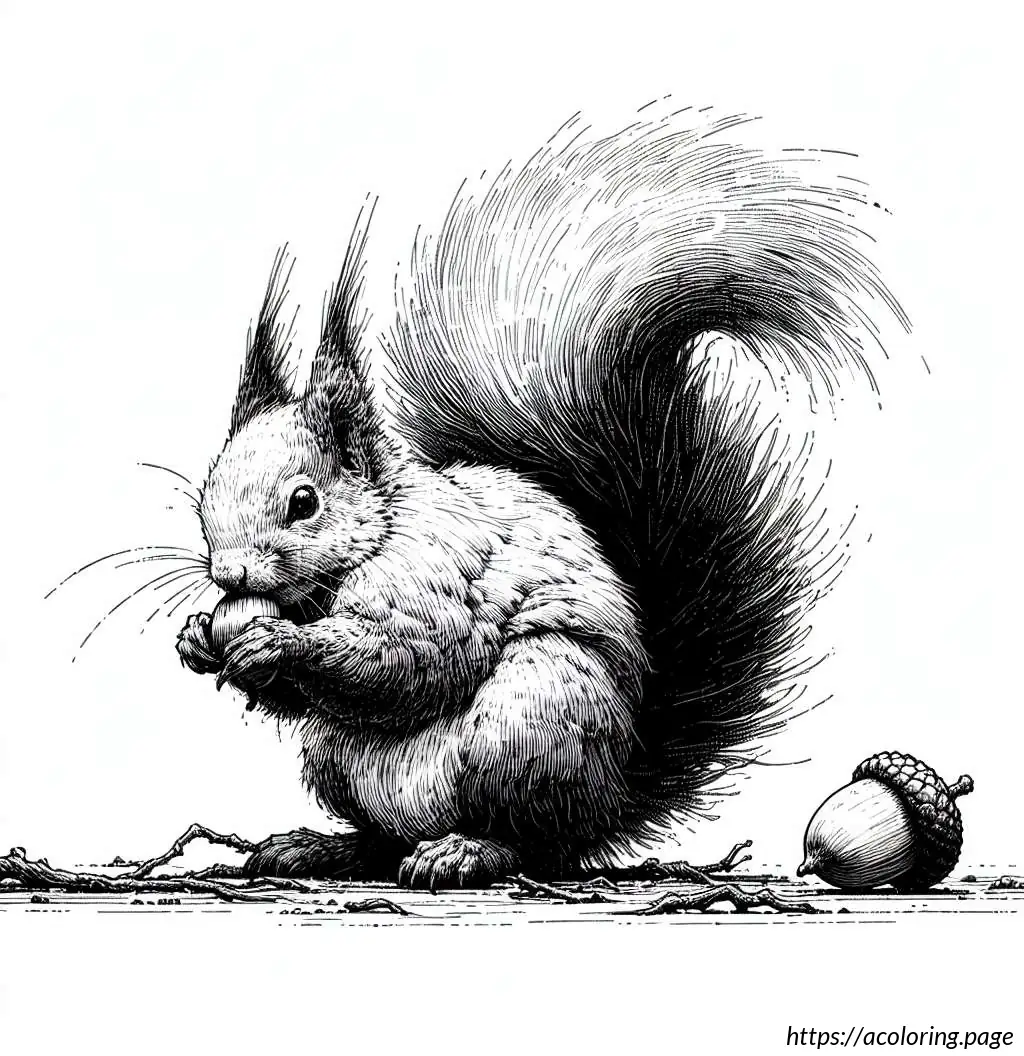 This image is a line drawing of a cute, cartoon-style squirrel. The squirrel is shown in a playful pose with its head turned towards the ground as it interacts with two acorns in front of it. One acorn is under its chin, and it appears to be nibbling or sniffing it, while the other is just a bit farther away. Its large, bushy tail curls gracefully up and around, adding a dynamic flourish to the image. The features of the squirrel are simplified and stylized, with large, expressive eyes that enhance the cartoonish and friendly character of the drawing. This drawing could be used for various purposes like a children”s book illustration, educational material, or a simple, joyful decoration.