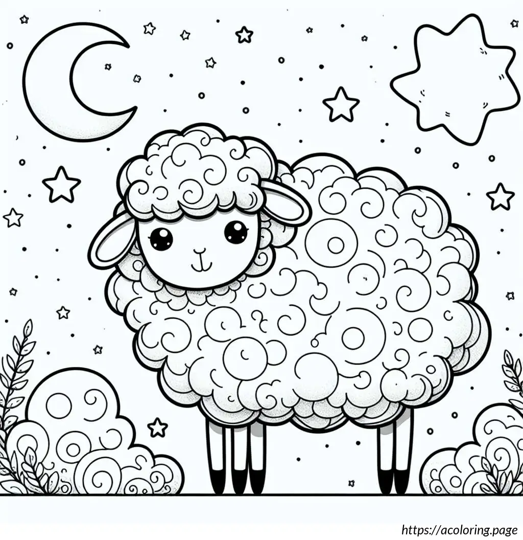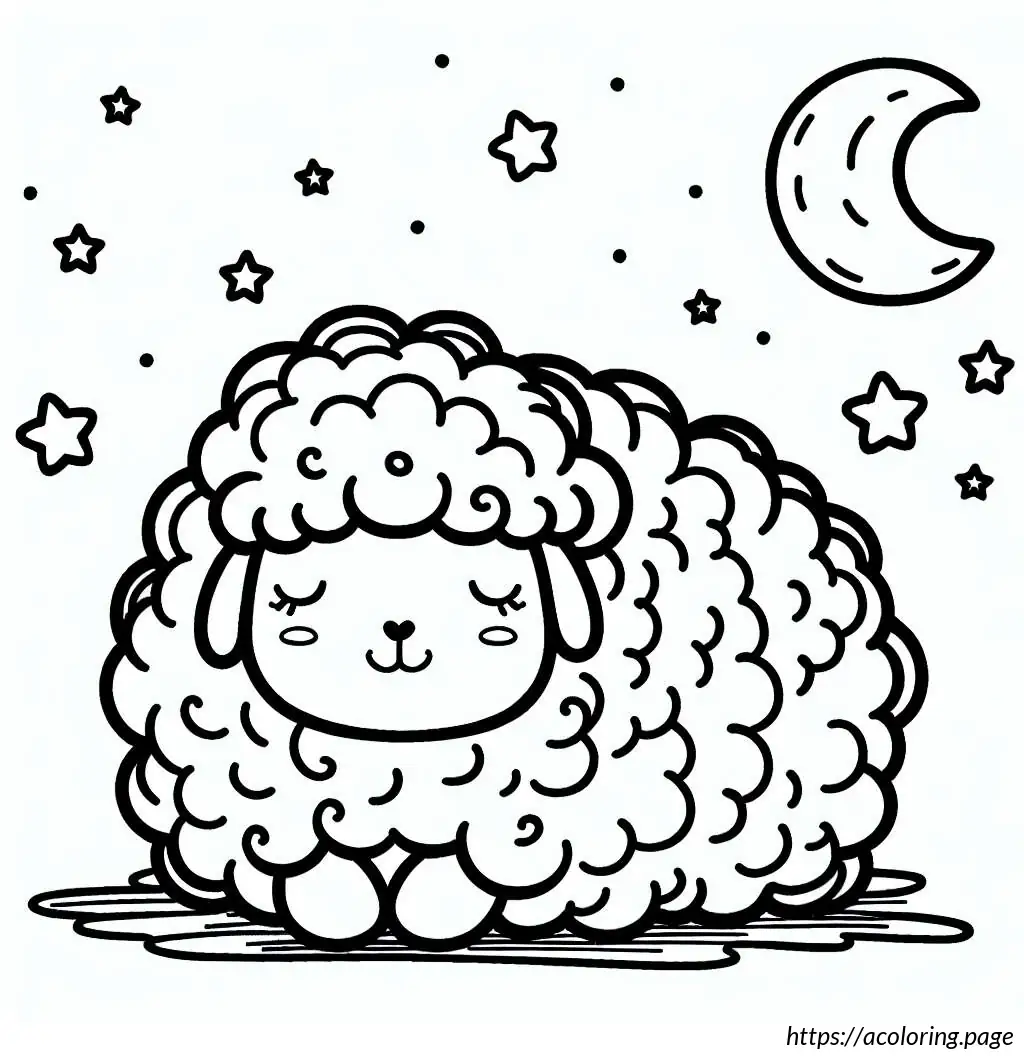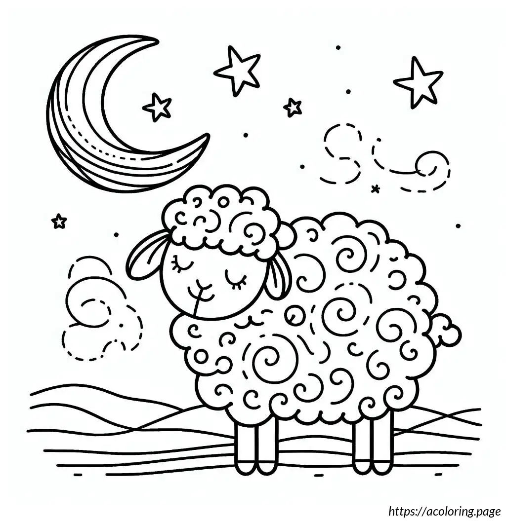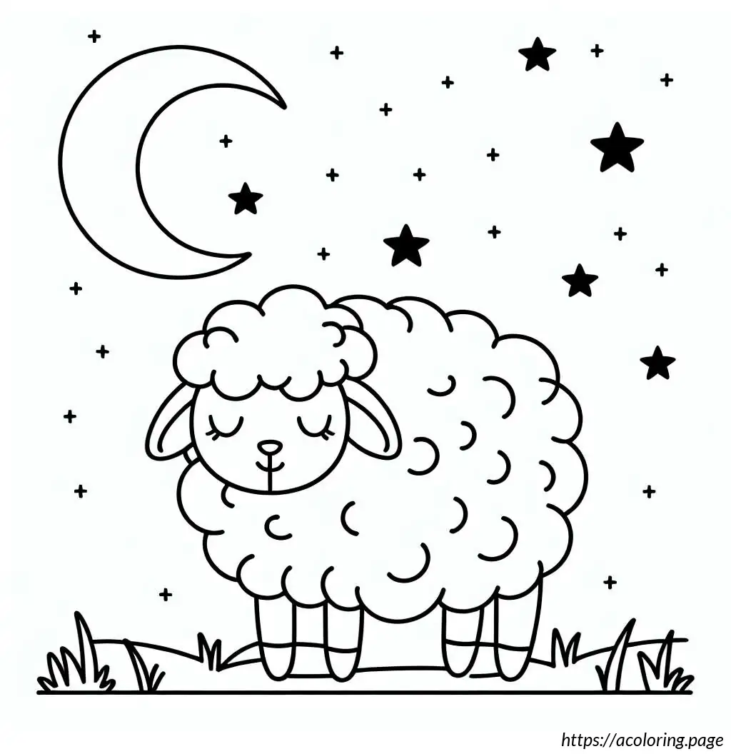 The image is a simple black and white line drawing, primarily designed for coloring. It features a cartoon-style sheep standing on a patch of ground. The sheep has a large, fluffy body with a distinct round face and sleepily closed eyes. The textures are represented with wavy lines suggesting wool. The sheep appears content, with a small smile visible underneath its nose.Above the sheep, there is a night sky depicted. This includes a crescent moon to the left and three stars of varying sizes spread across the top. The background is plain, which emphasizes the sheep and celestial objects. The entire scene has a peaceful, sleepy theme, likely evoking thoughts of bedtime or night time.