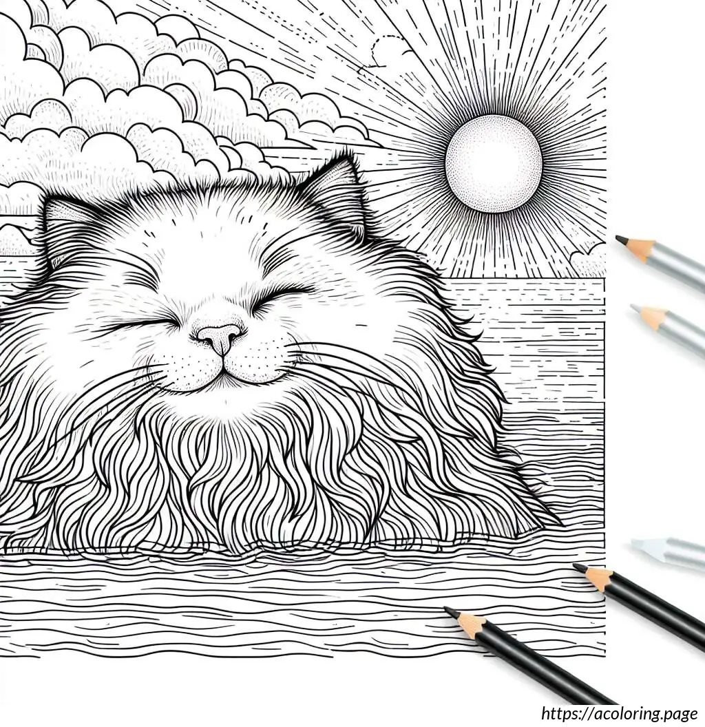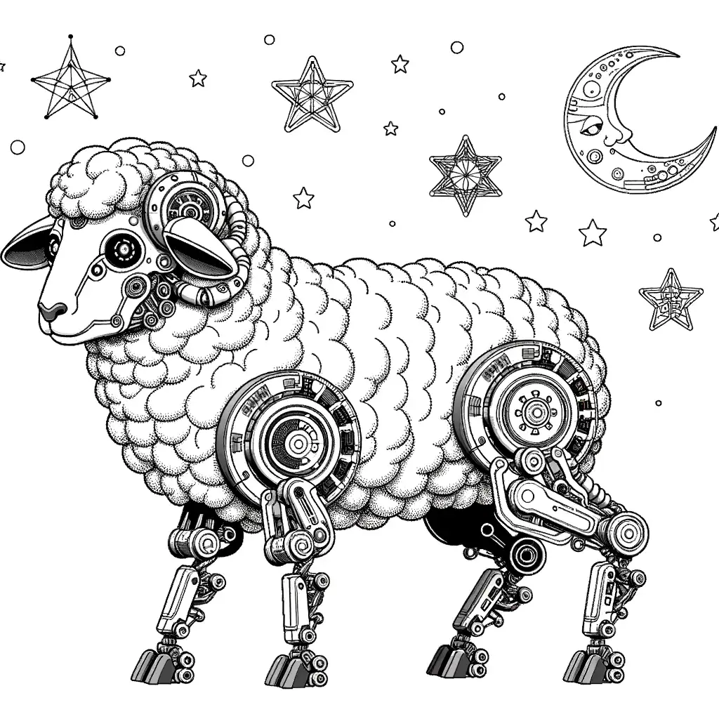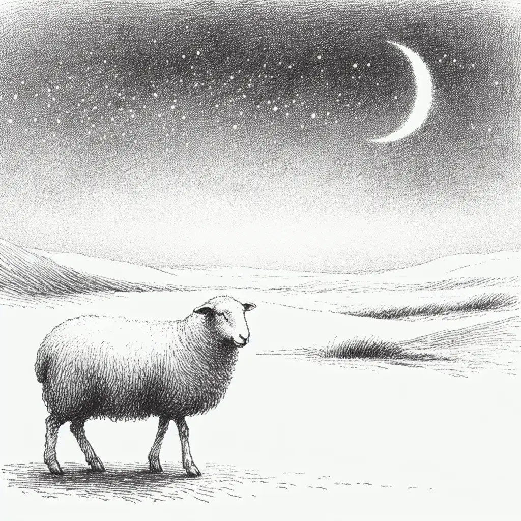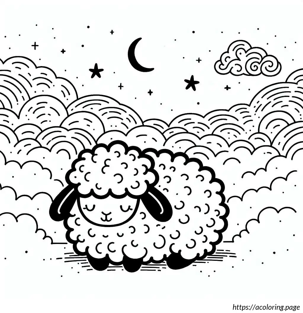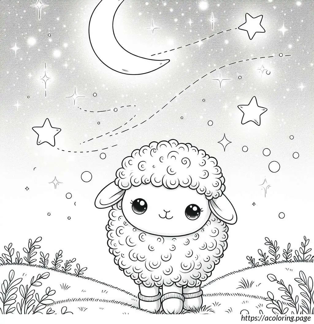 The image is a simple black and white line drawing, primarily designed for coloring. It features a cartoon-style sheep standing on a patch of ground. The sheep has a large, fluffy body with a distinct round face and sleepily closed eyes. The textures are represented with wavy lines suggesting wool. The sheep appears content, with a small smile visible underneath its nose.Above the sheep, there is a night sky depicted. This includes a crescent moon to the left and three stars of varying sizes spread across the top. The background is plain, which emphasizes the sheep and celestial objects. The entire scene has a peaceful, sleepy theme, likely evoking thoughts of bedtime or night time.
