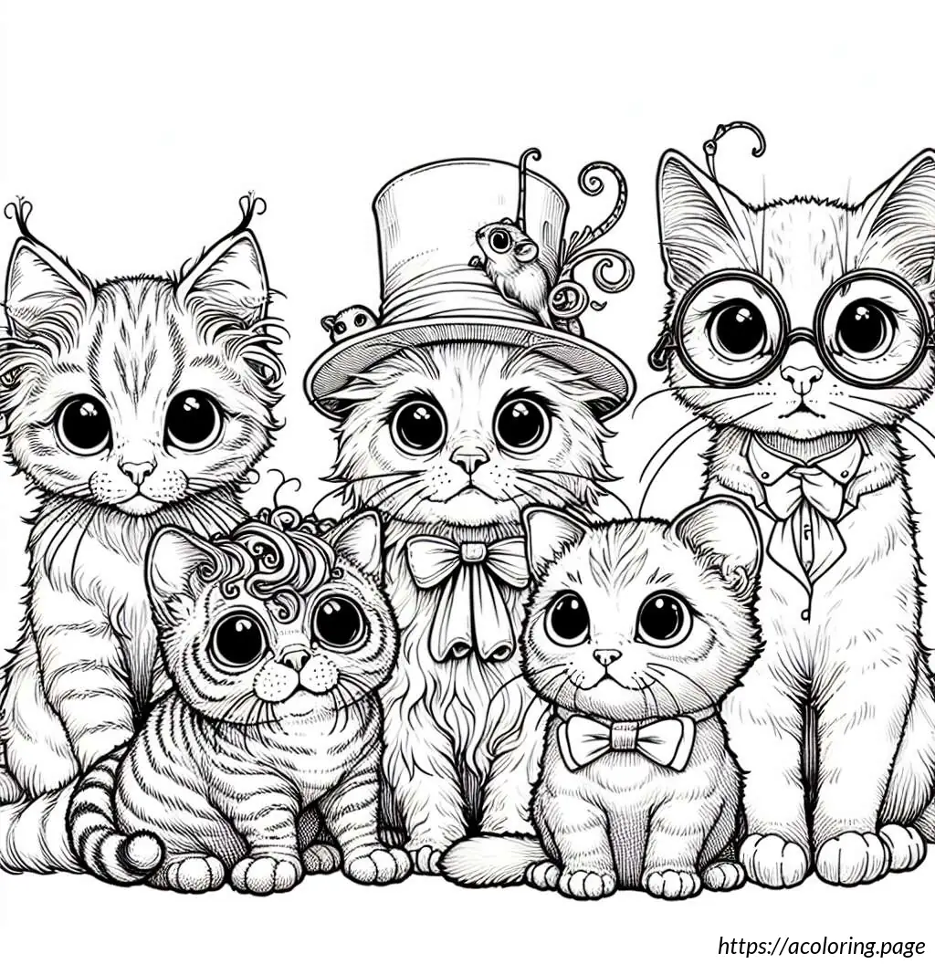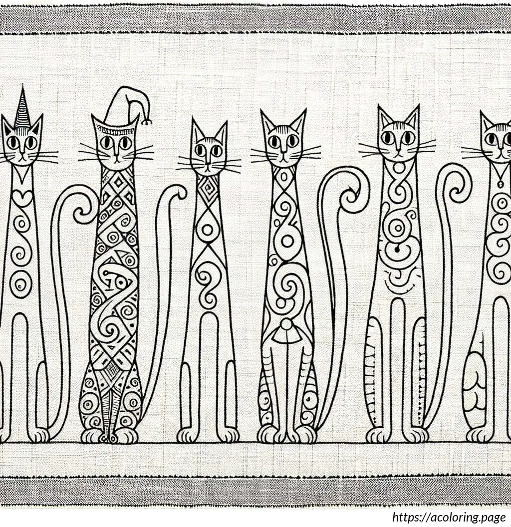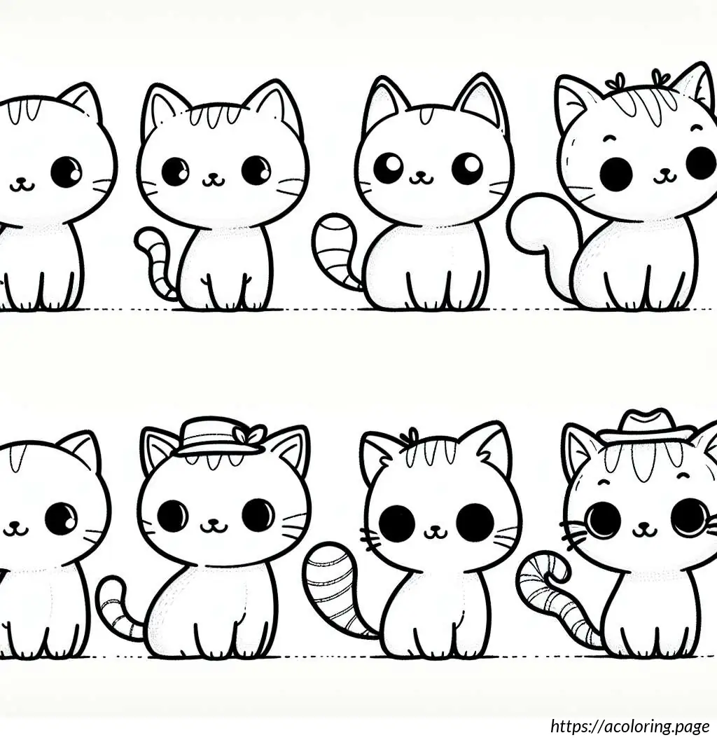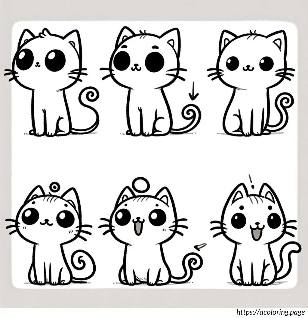 The image features a line of five cartoon cats drawn in black and white. Each cat has a unique expression and slight differences in appearance1. The cat on the far left is wearing a small hat, has a curly tail, and looks slightly surprised with its eyes wide open and whiskers pointing upwards.2. The second cat from the left is standing straight, with both eyes looking to the left and a neutral expression. This cat’s tail is also curled.3. The middle cat looks very surprised, with large round eyes looking straight ahead and its mouth open.4. The second cat from the right has a straightforward expression with slightly squinted eyes and its mouth closed. The tail of this cat gently curves behind it.5. The cat on the far right appears jovial, with a simple smile and its tongue sticking out, alongside an upright tail that curves at the top.All the cats have pointed ears and little paws, and each has its own distinctive set of facial whiskers. The drawing style is simplistic and whimsical, making the image playful and amusing.