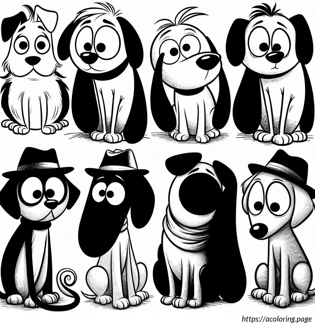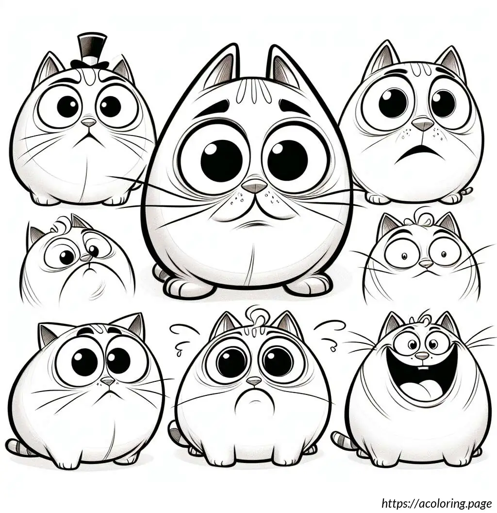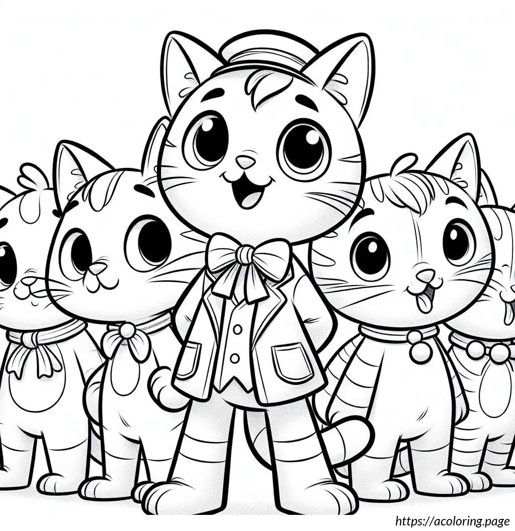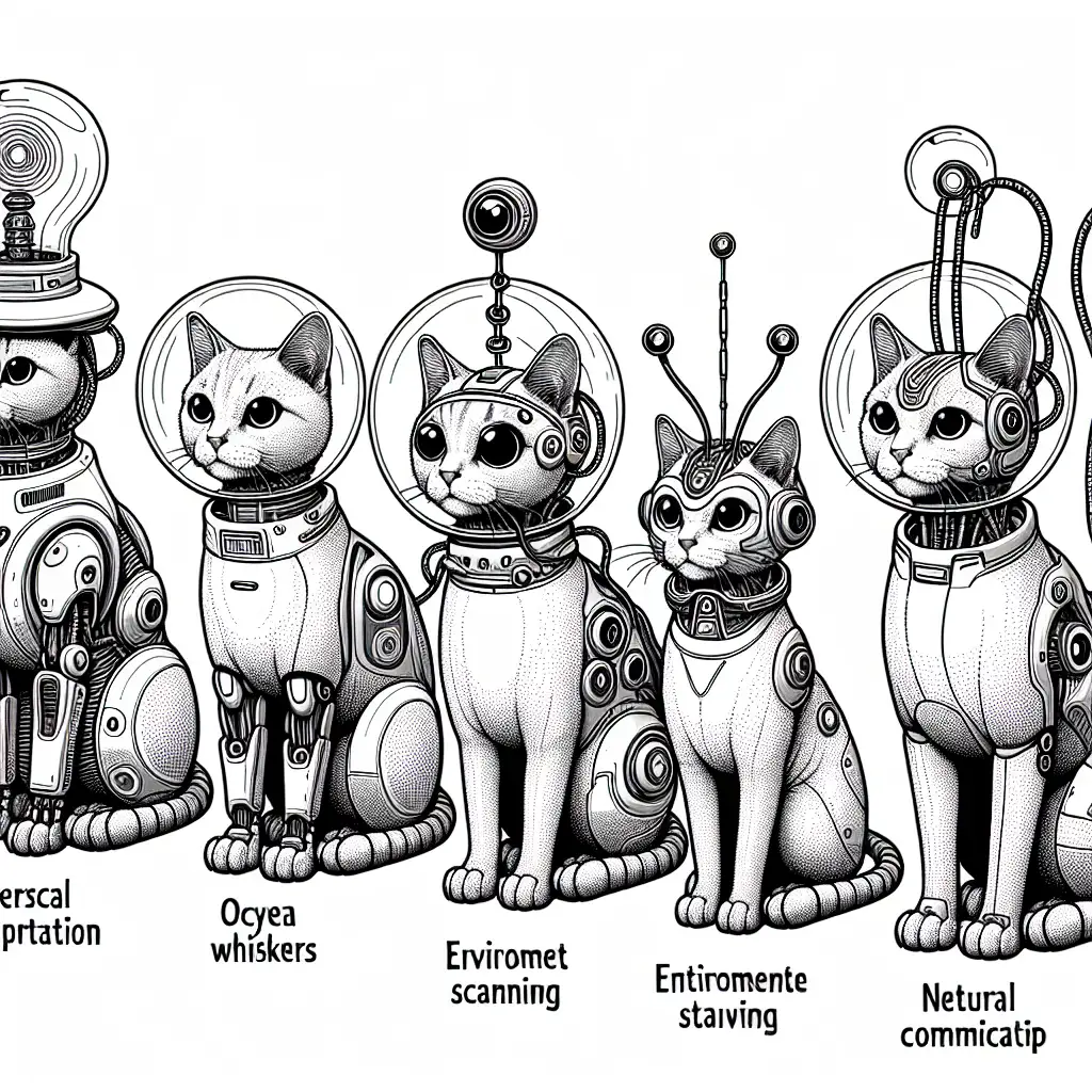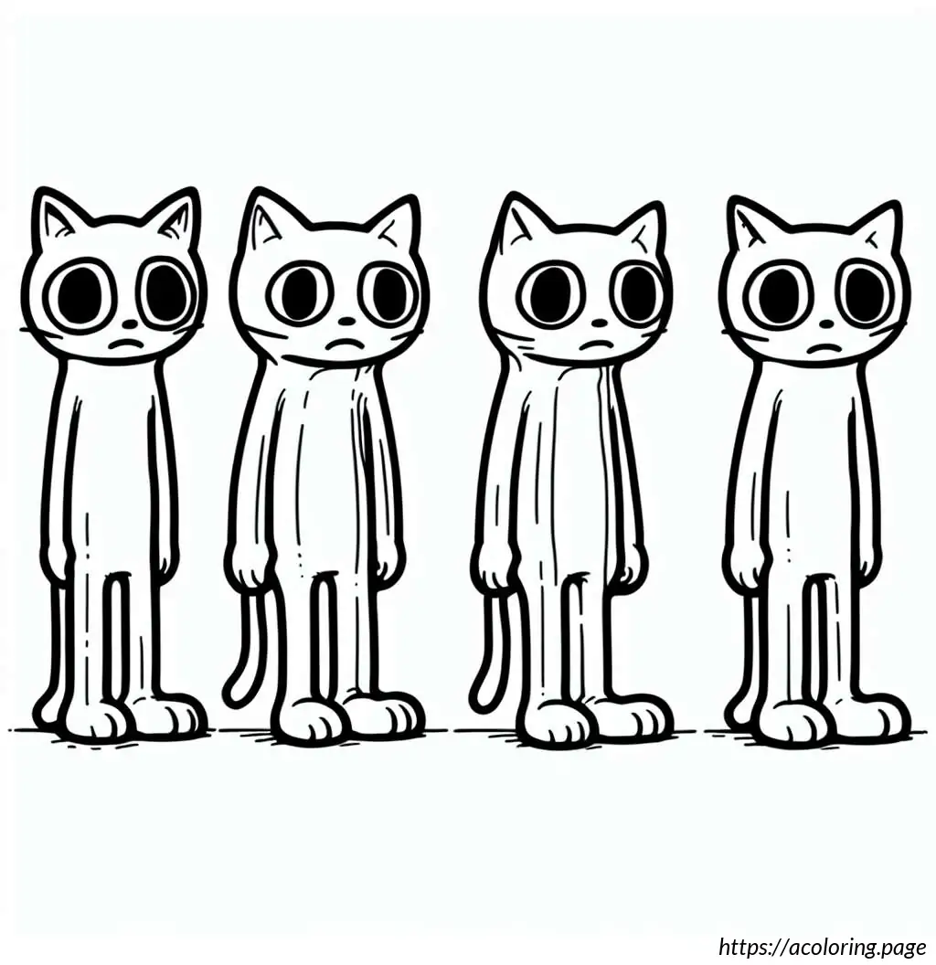 The image features a line of five cartoon cats drawn in black and white. Each cat has a unique expression and slight differences in appearance1. The cat on the far left is wearing a small hat, has a curly tail, and looks slightly surprised with its eyes wide open and whiskers pointing upwards.2. The second cat from the left is standing straight, with both eyes looking to the left and a neutral expression. This cat’s tail is also curled.3. The middle cat looks very surprised, with large round eyes looking straight ahead and its mouth open.4. The second cat from the right has a straightforward expression with slightly squinted eyes and its mouth closed. The tail of this cat gently curves behind it.5. The cat on the far right appears jovial, with a simple smile and its tongue sticking out, alongside an upright tail that curves at the top.All the cats have pointed ears and little paws, and each has its own distinctive set of facial whiskers. The drawing style is simplistic and whimsical, making the image playful and amusing.