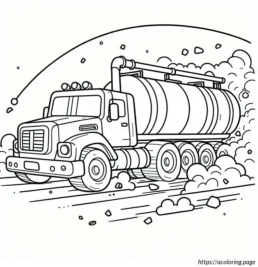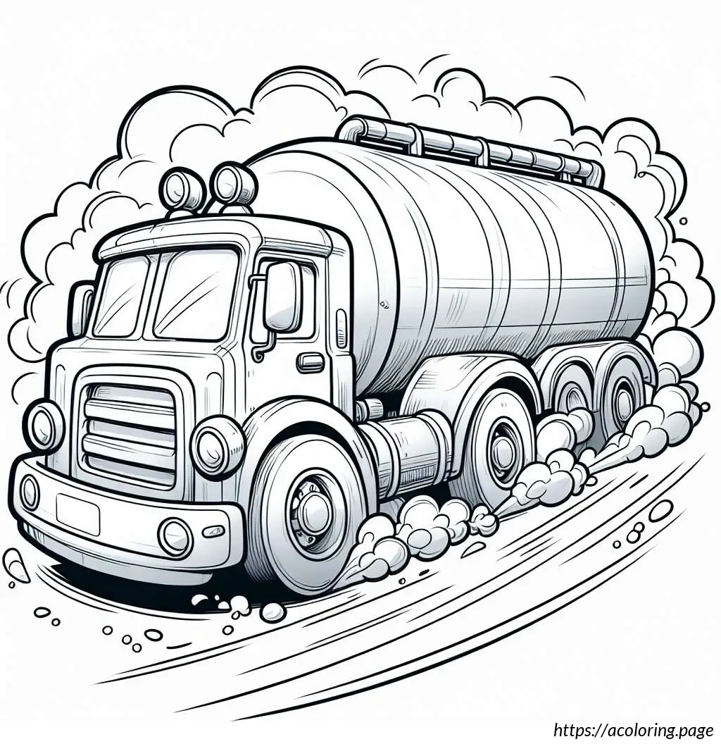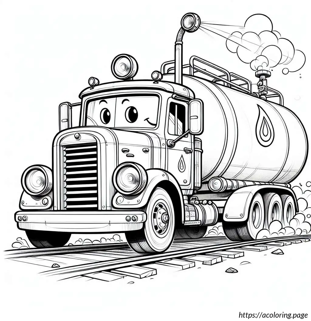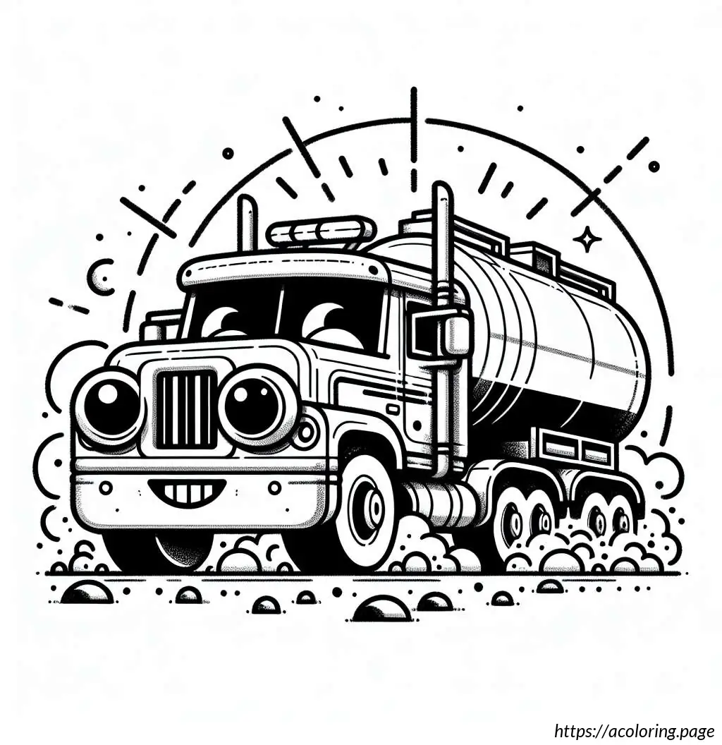 This image is a black and white line drawing of a comically styled tanker truck. The truck appears to be in motion as indicated by the small stones and dust clouds near its tires, suggesting it”s moving at a high speed. The truck features a friendly, cartoonish face on the front with large, expressive eyes and a smiling grille that resembles a mouth.The cabin of the truck is rounded with a large windshield and an exhaust stack poking out on top, releasing a small puff of smoke. The tanker section of the truck is elongated, with a series of windows that resemble a ladder on its side. Its rear is capped with a section that has smoke or steam puffing out, contributing to the dynamic motion effect.The sun or a bright light source is represented by a starburst effect located above and behind the truck”s cabin, adding a sense of urgency or intensity to the scene. The overall style is playful and energetic, typical of illustrations aimed at children.