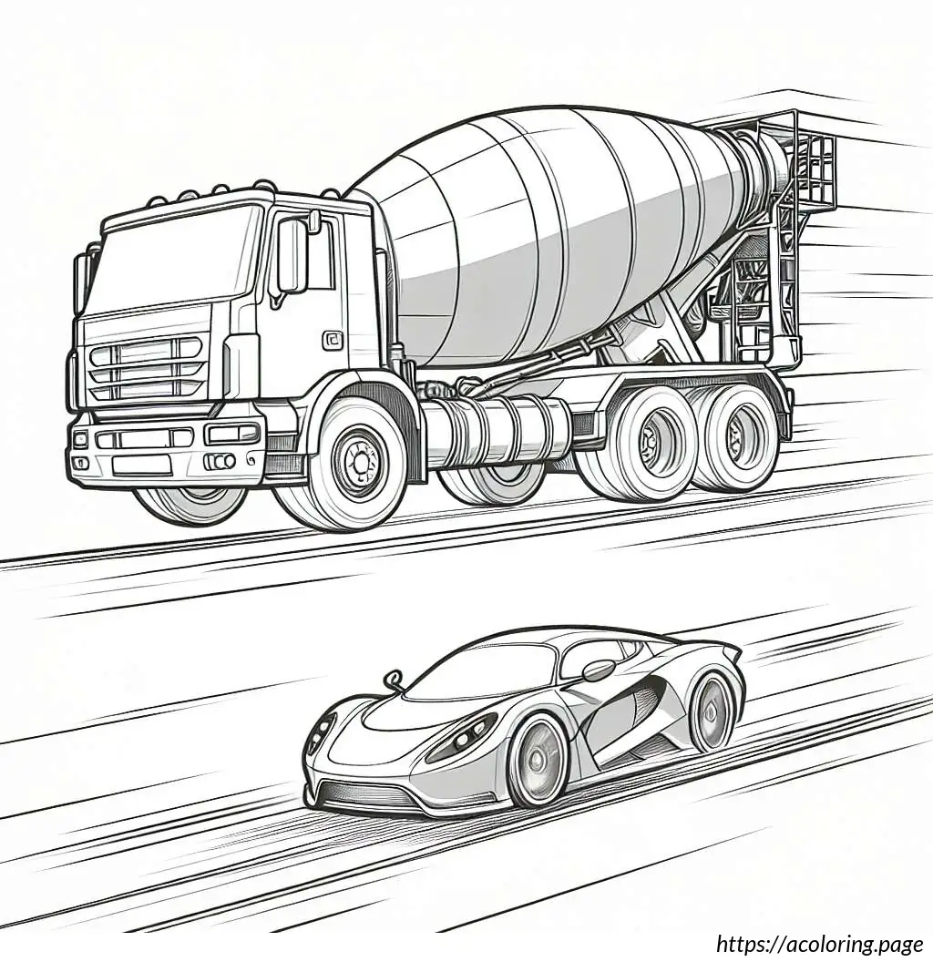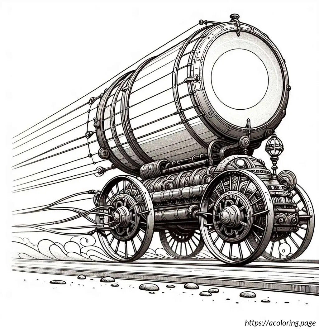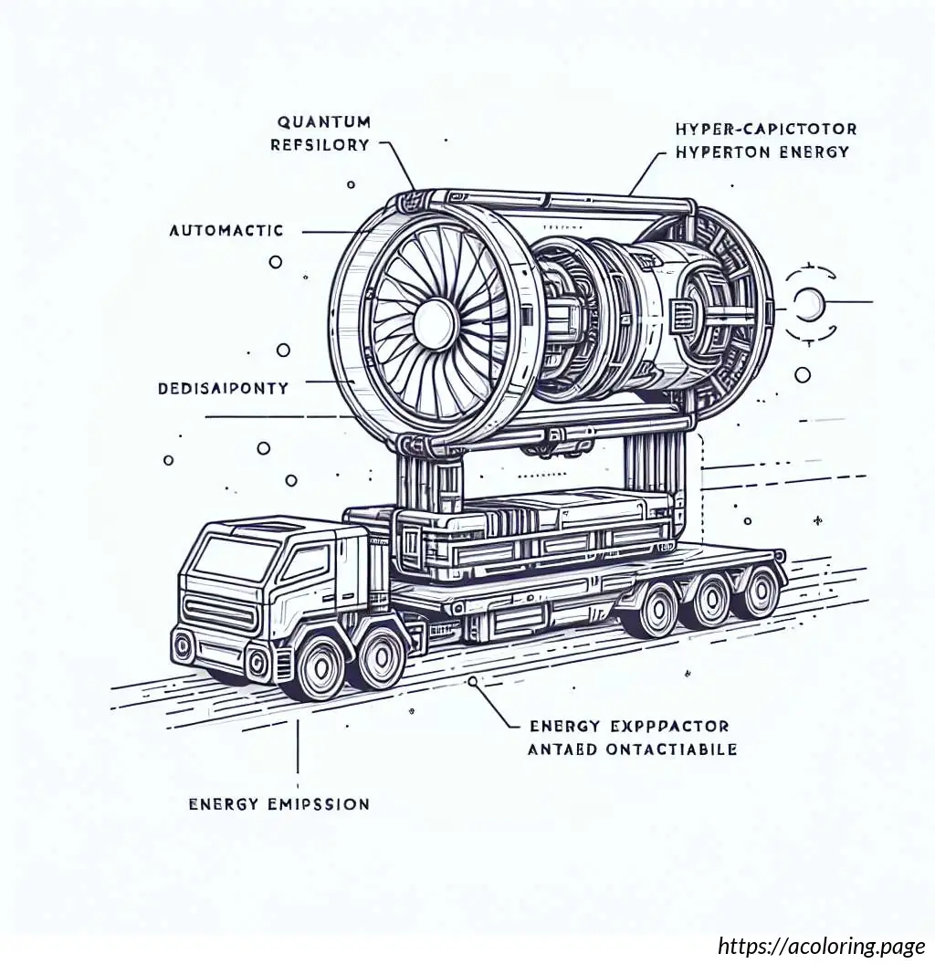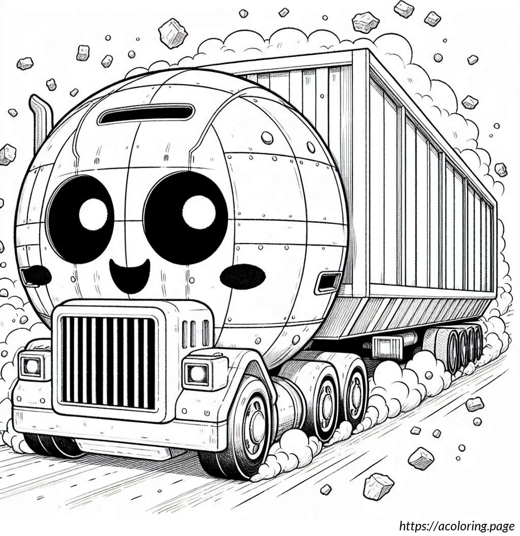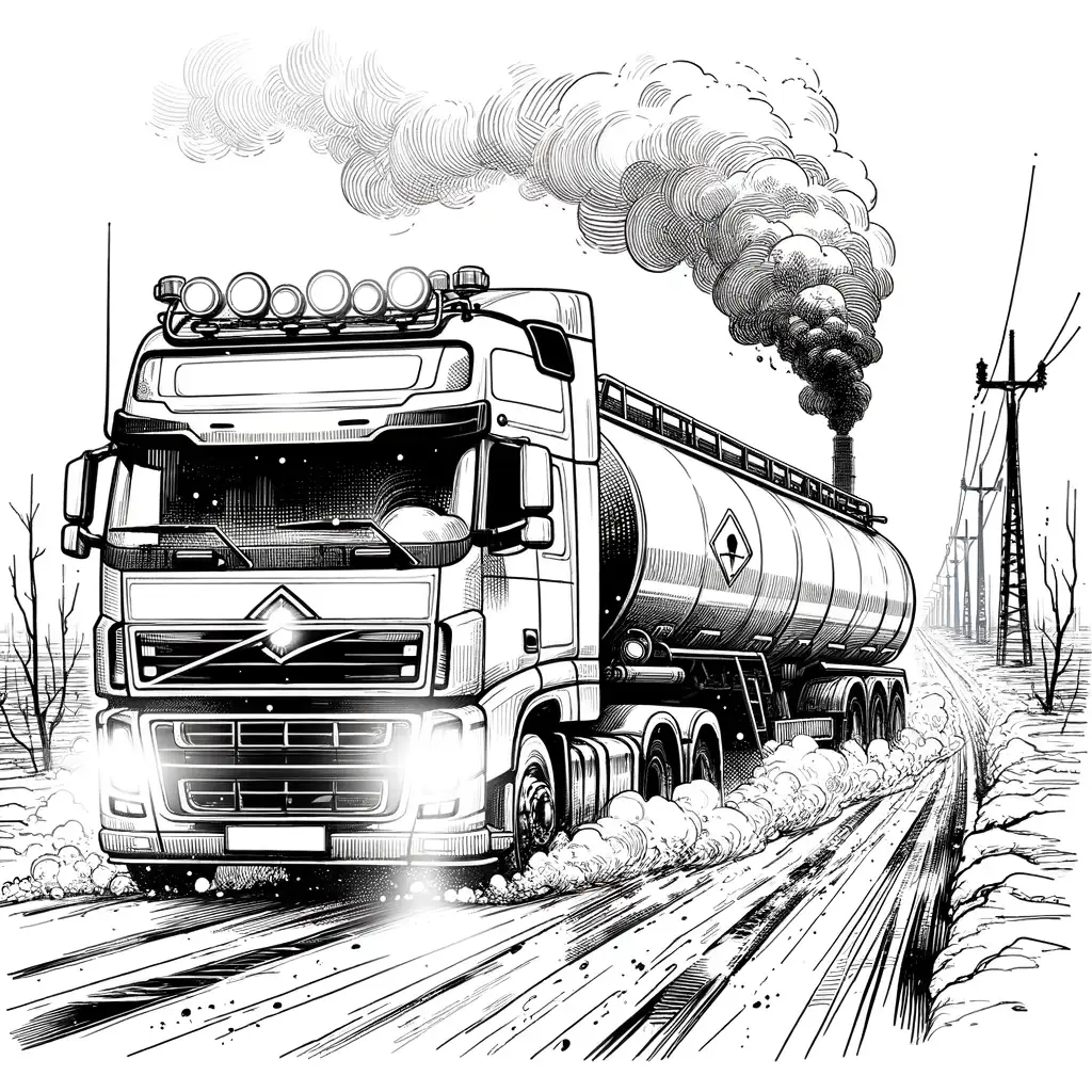 This image is a black and white line drawing of a comically styled tanker truck. The truck appears to be in motion as indicated by the small stones and dust clouds near its tires, suggesting it”s moving at a high speed. The truck features a friendly, cartoonish face on the front with large, expressive eyes and a smiling grille that resembles a mouth.The cabin of the truck is rounded with a large windshield and an exhaust stack poking out on top, releasing a small puff of smoke. The tanker section of the truck is elongated, with a series of windows that resemble a ladder on its side. Its rear is capped with a section that has smoke or steam puffing out, contributing to the dynamic motion effect.The sun or a bright light source is represented by a starburst effect located above and behind the truck”s cabin, adding a sense of urgency or intensity to the scene. The overall style is playful and energetic, typical of illustrations aimed at children.