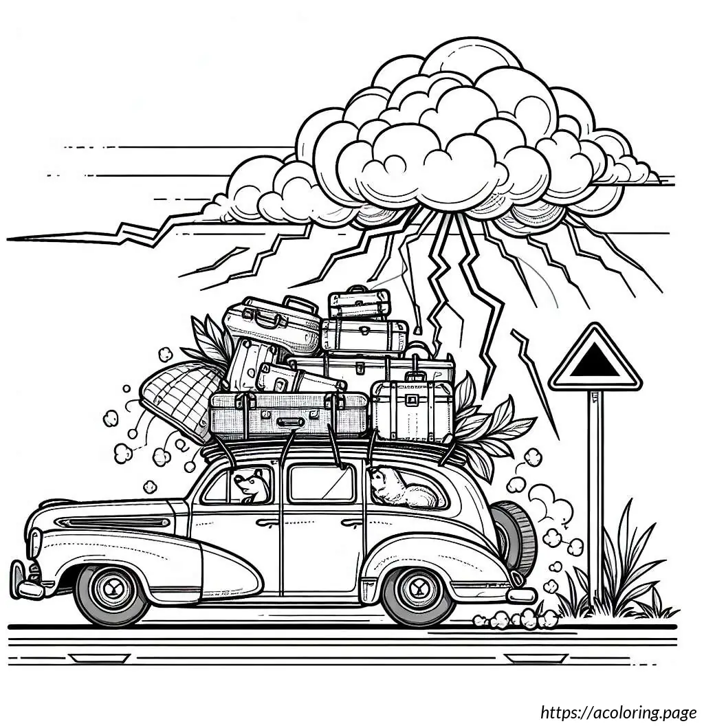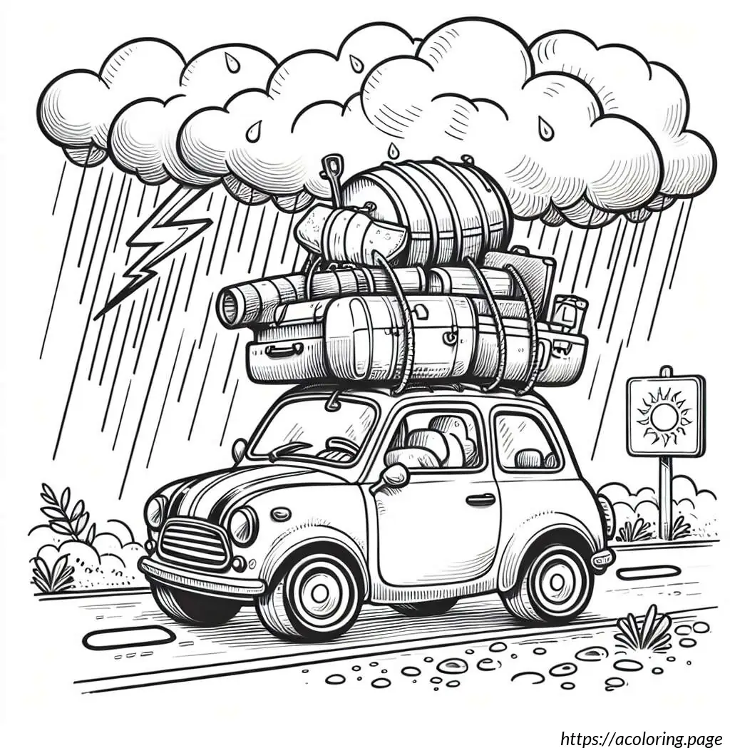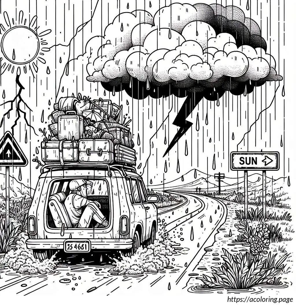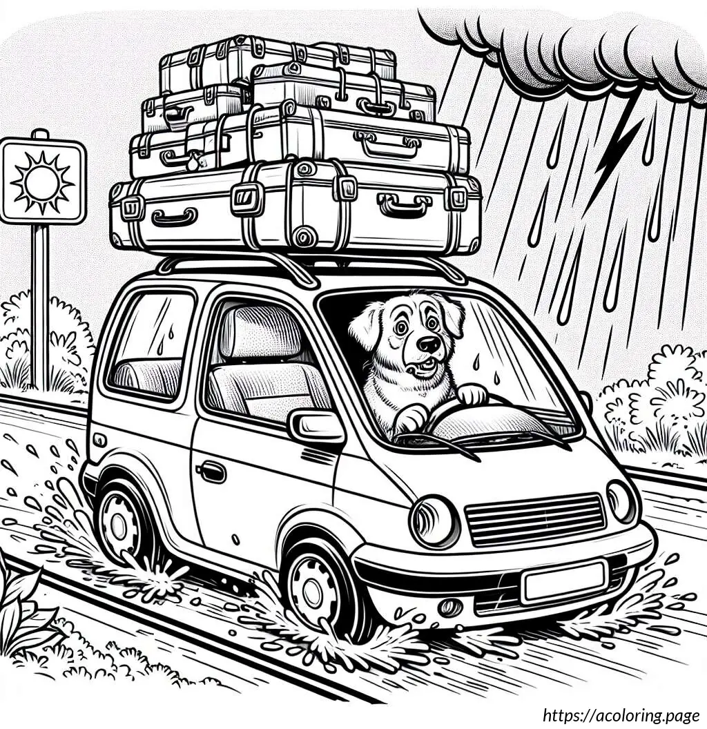 The image is a black and white illustration depicting a humorous, chaotic scenario involving a small car overloaded with baggage on the roof. Inside the car, a dog is driving; its head pops out of the window, and it appears surprised or overwhelmed. The car seems to be stopped at a road sign, which shows a sun symbol, possibly indicating a destination or a change in the weather ahead. It is raining heavily, and lightning bolts can be seen coming from a cloud above. The scene conveys a sense of a challenging travel situation in adverse weather conditions, with the amusing addition of a dog as the driver adding to the whimsy of the illustration.