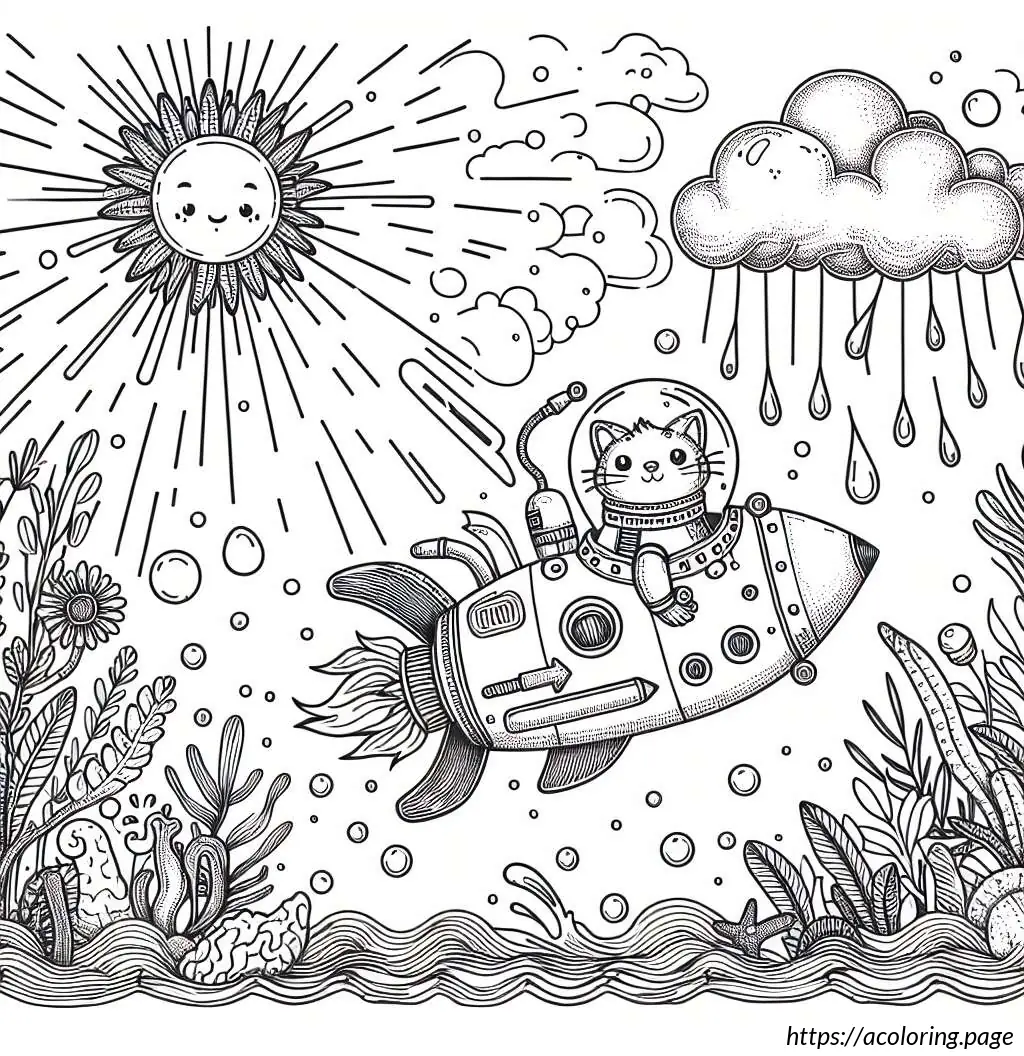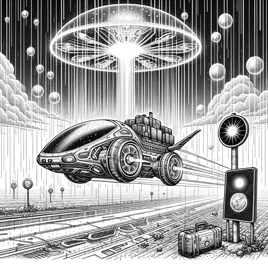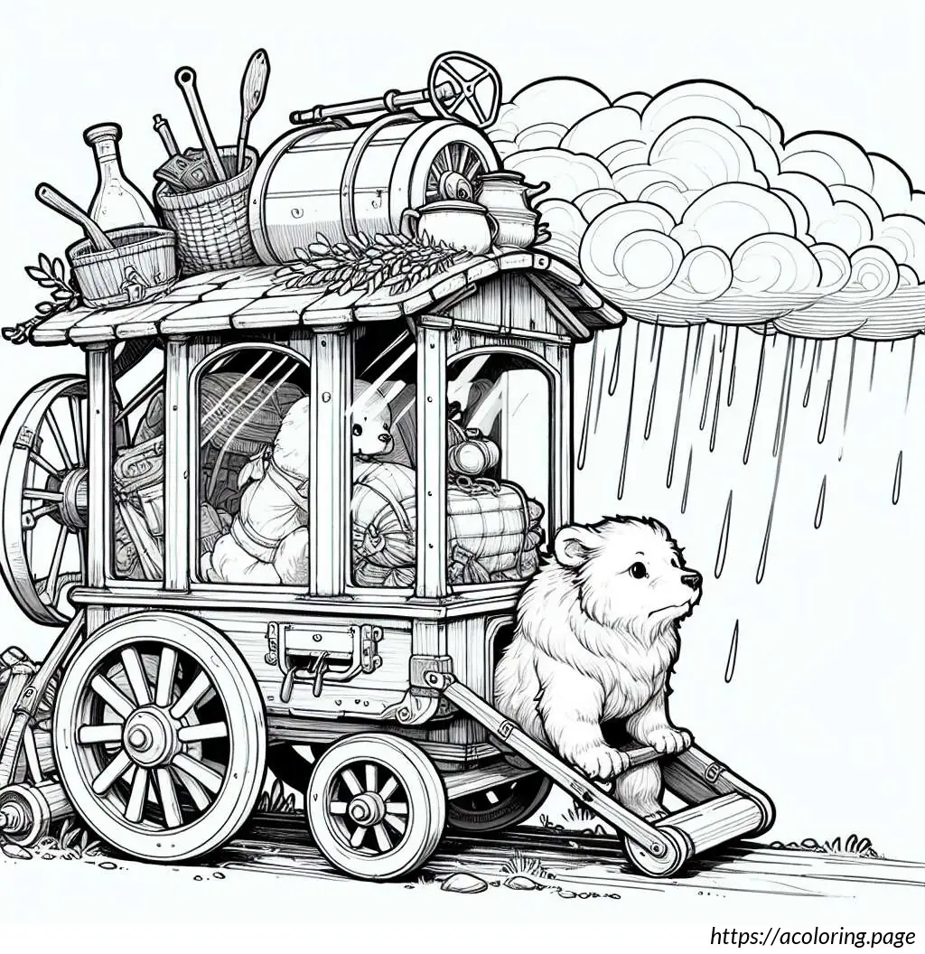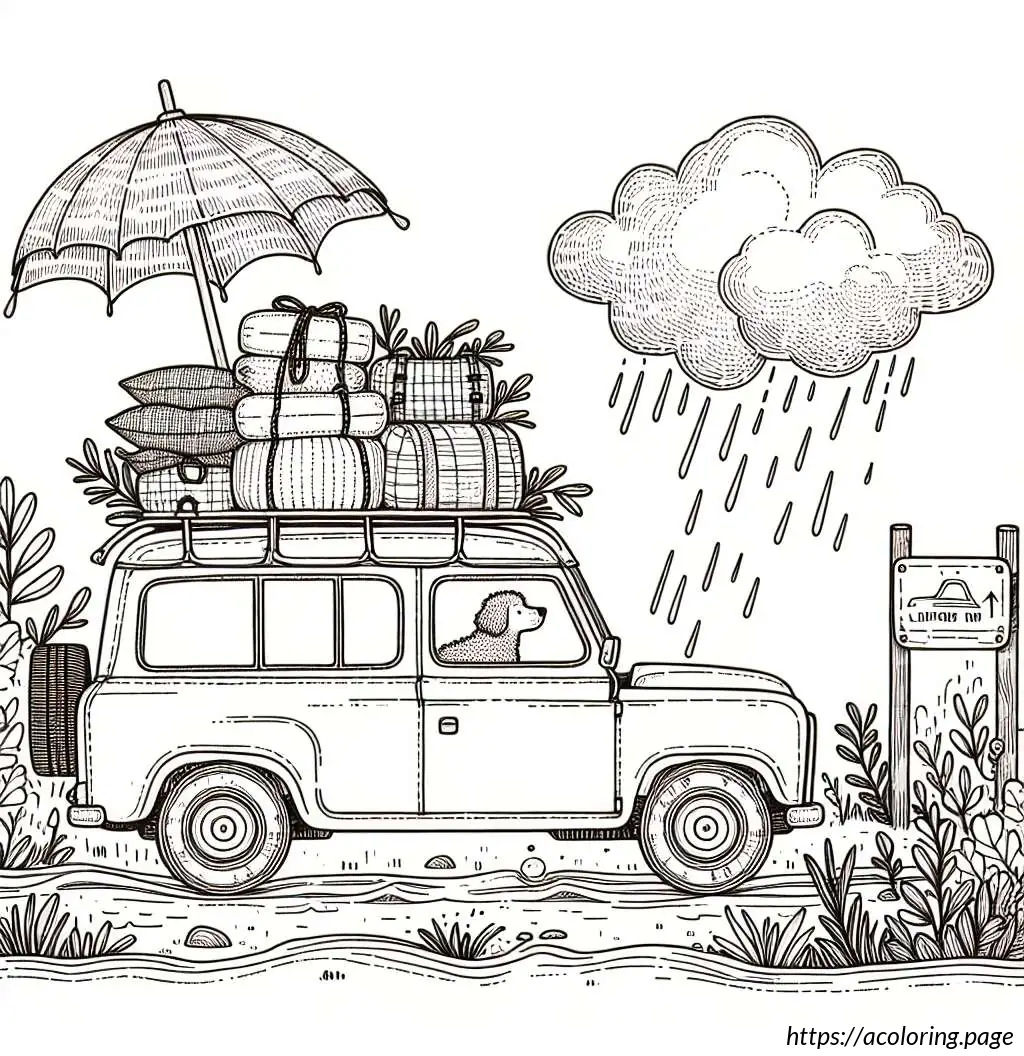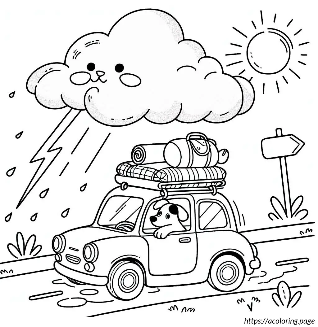 The image is a black and white illustration depicting a humorous, chaotic scenario involving a small car overloaded with baggage on the roof. Inside the car, a dog is driving; its head pops out of the window, and it appears surprised or overwhelmed. The car seems to be stopped at a road sign, which shows a sun symbol, possibly indicating a destination or a change in the weather ahead. It is raining heavily, and lightning bolts can be seen coming from a cloud above. The scene conveys a sense of a challenging travel situation in adverse weather conditions, with the amusing addition of a dog as the driver adding to the whimsy of the illustration.