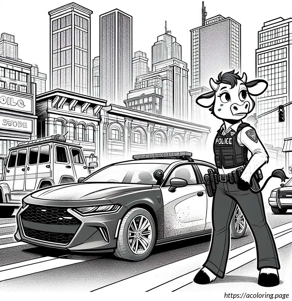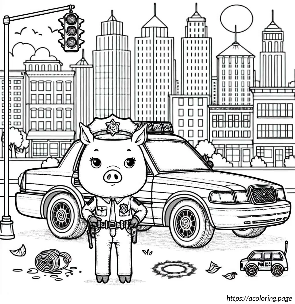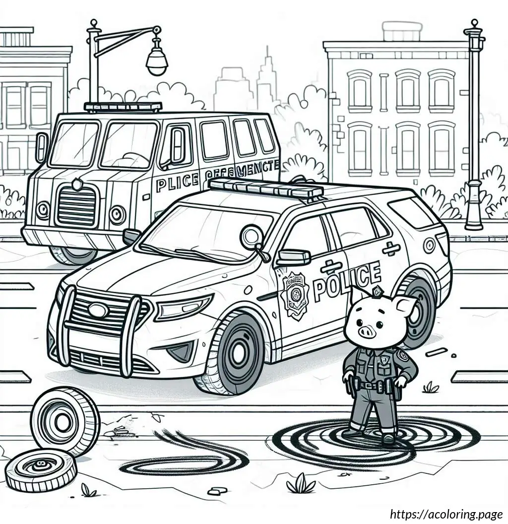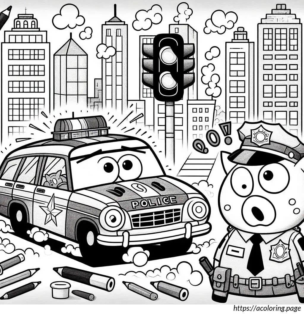 This image features a cartoonish representation in a black-and-white style depicting an urban scene. On the left, there is a police car with a design indicating motion, characterized by speed lines and puffs of smoke at the rear, suggesting it just screeched to a stop. The car has a star badge on the door and a roof-mounted light bar.On the right, there is a distinctly styled cartoon character resembling a police officer who is portrayed with anthropomorphic pig-like features. This character stands with a somewhat surprised or bewildered expression, wearing a police uniform with a badge and a cap.In the background, simple outlines of city buildings create an urban environment. A traffic light stand is also visible beside the police officer, reinforcing the urban traffic theme. The overall scenario may be implying a comedic element common in cartoons involving anthropomorphic characters in human roles.