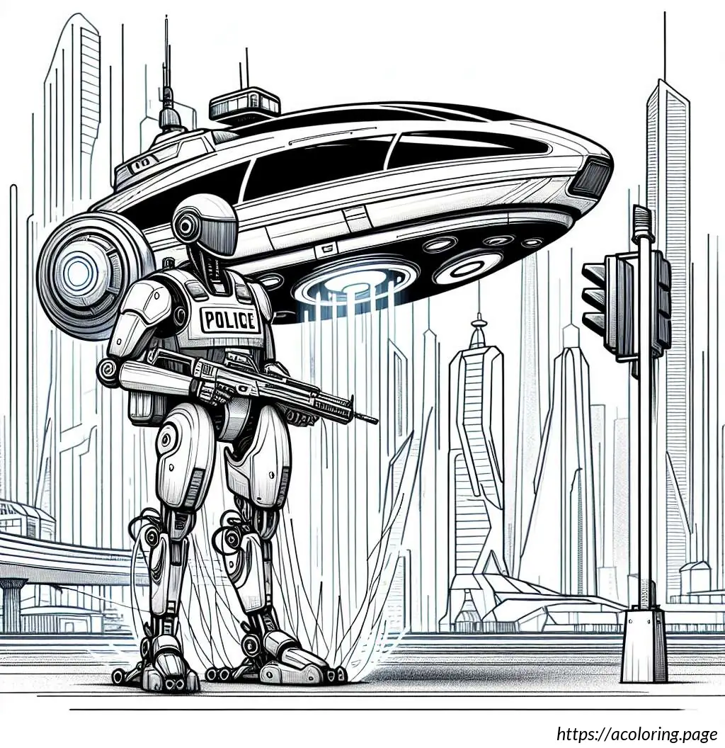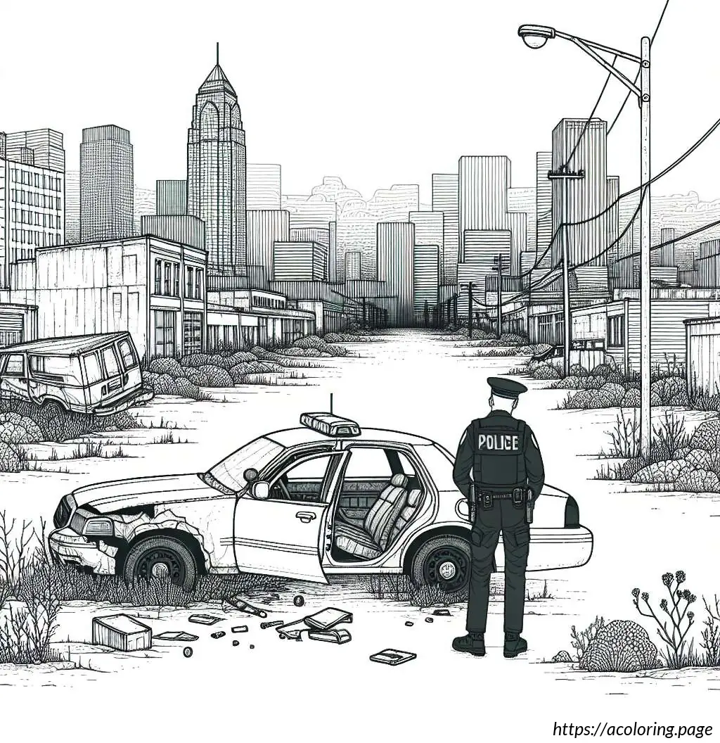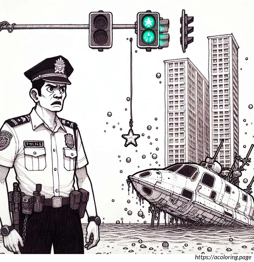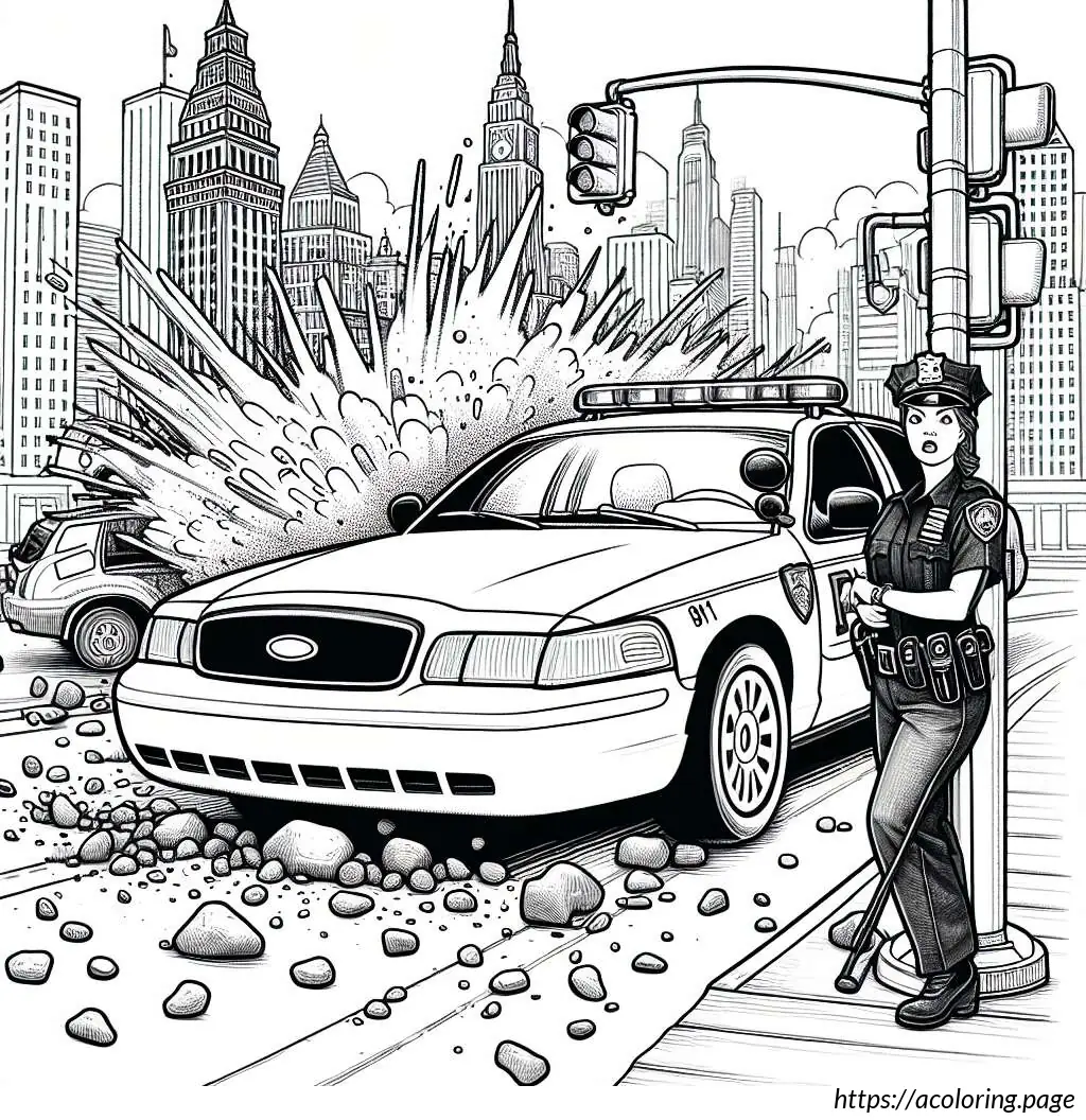 This image features a cartoonish representation in a black-and-white style depicting an urban scene. On the left, there is a police car with a design indicating motion, characterized by speed lines and puffs of smoke at the rear, suggesting it just screeched to a stop. The car has a star badge on the door and a roof-mounted light bar.On the right, there is a distinctly styled cartoon character resembling a police officer who is portrayed with anthropomorphic pig-like features. This character stands with a somewhat surprised or bewildered expression, wearing a police uniform with a badge and a cap.In the background, simple outlines of city buildings create an urban environment. A traffic light stand is also visible beside the police officer, reinforcing the urban traffic theme. The overall scenario may be implying a comedic element common in cartoons involving anthropomorphic characters in human roles.