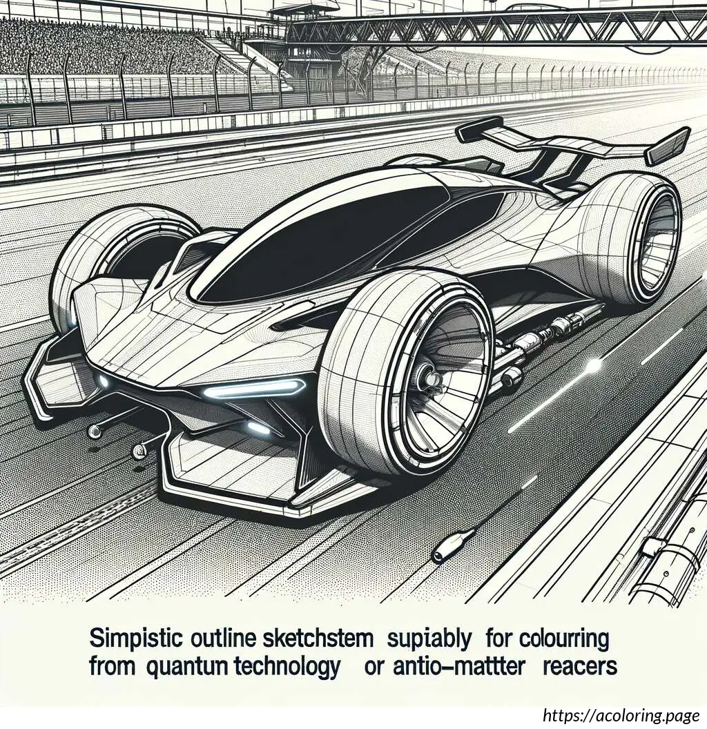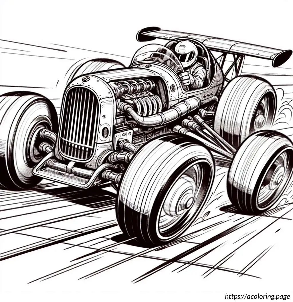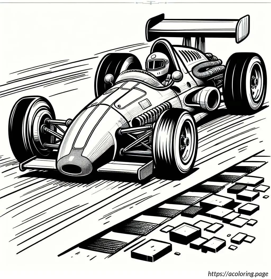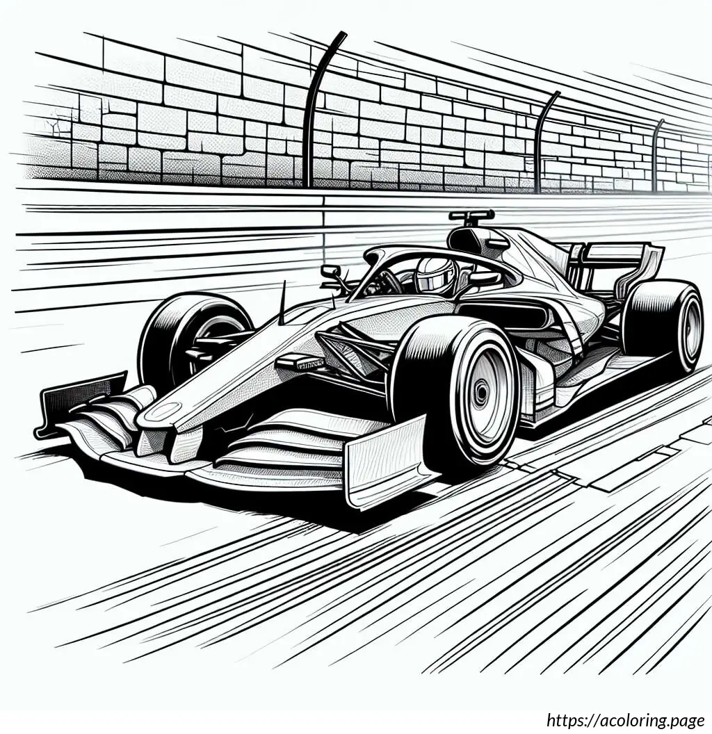 The image depicts an illustration of a racing car, executed in a bold black-and-white line-art style. The car is speeding along what appears to be a racetrack, as indicated by the blur lines behind it and the stone-block wall along the upper edge of the frame. The vehicle is shown in dynamic motion, slightly tilted to suggest high speed. The car features typical elements of a race car design, including large rear tires, a smaller front, aerodynamic bodywork, a large rear wing for downforce, and visible suspension components. The driver, visible through a clear cockpit with a protective halo, appears focused and engaged in the act of driving, denoted by the details in the steering wheel and the driver’s helmet and suit.The drawing has a cartoonish flair, with exaggerated proportions and stylized design elements that add a sense of energy and movement. The track”s depiction involves a basic representation of the pavement with simple horizontal and diagonal lines to give the sense of motion and speed.