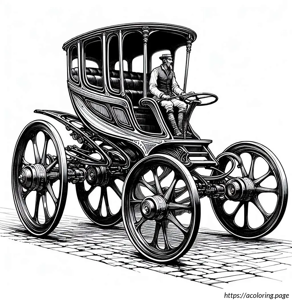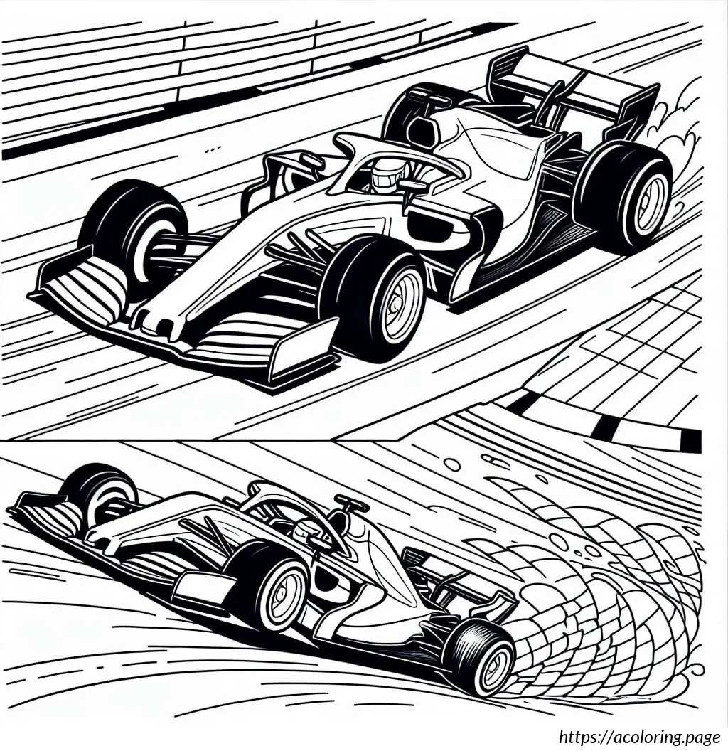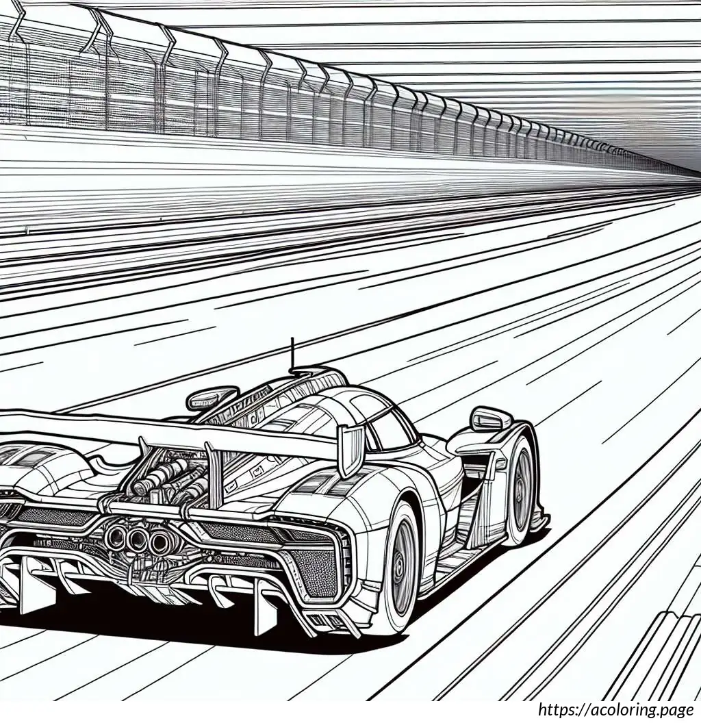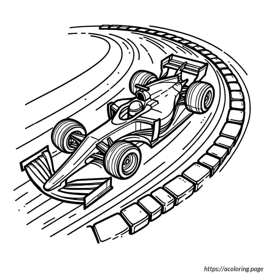 The image depicts an illustration of a racing car, executed in a bold black-and-white line-art style. The car is speeding along what appears to be a racetrack, as indicated by the blur lines behind it and the stone-block wall along the upper edge of the frame. The vehicle is shown in dynamic motion, slightly tilted to suggest high speed. The car features typical elements of a race car design, including large rear tires, a smaller front, aerodynamic bodywork, a large rear wing for downforce, and visible suspension components. The driver, visible through a clear cockpit with a protective halo, appears focused and engaged in the act of driving, denoted by the details in the steering wheel and the driver’s helmet and suit.The drawing has a cartoonish flair, with exaggerated proportions and stylized design elements that add a sense of energy and movement. The track”s depiction involves a basic representation of the pavement with simple horizontal and diagonal lines to give the sense of motion and speed.