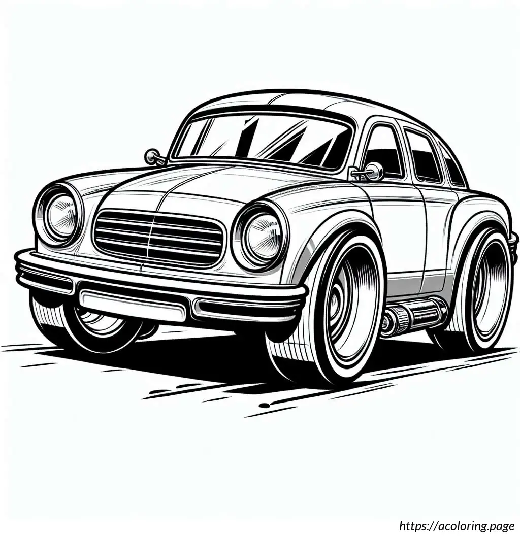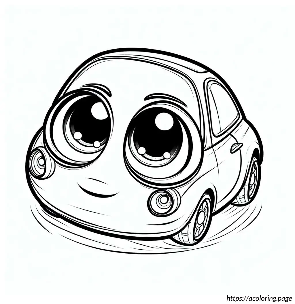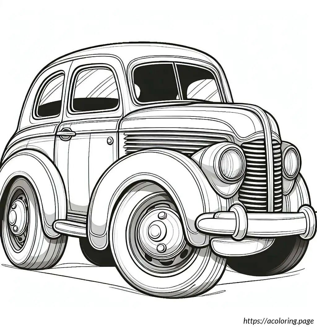 The image shows a cartoon-style line drawing of a classic car. The car is depicted with exaggerated, rounded features, giving it a whimsical, friendly appearance. It features large, rounded headlights and similarly styled wheels that are prominently displayed. The windows of the car are simple outlines without any intricate detail, adding to the childlike, playful design of the image. The car has a front bumper that curves around the bottom and separate fenders over the wheels that bulge outward. The overall look suggests that the image might be appealing for coloring activities, especially for children, due to its bold outlines and simple shapes.